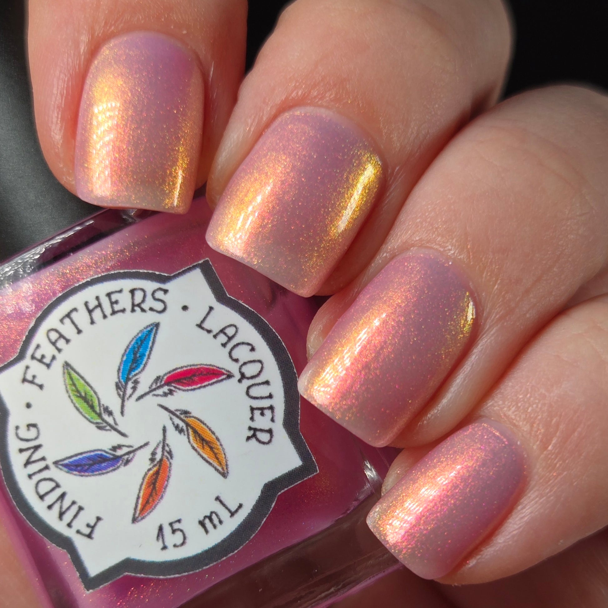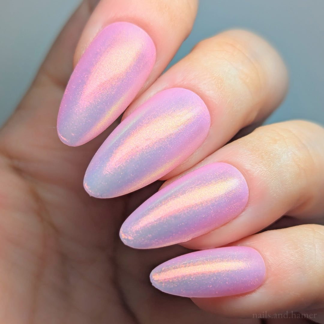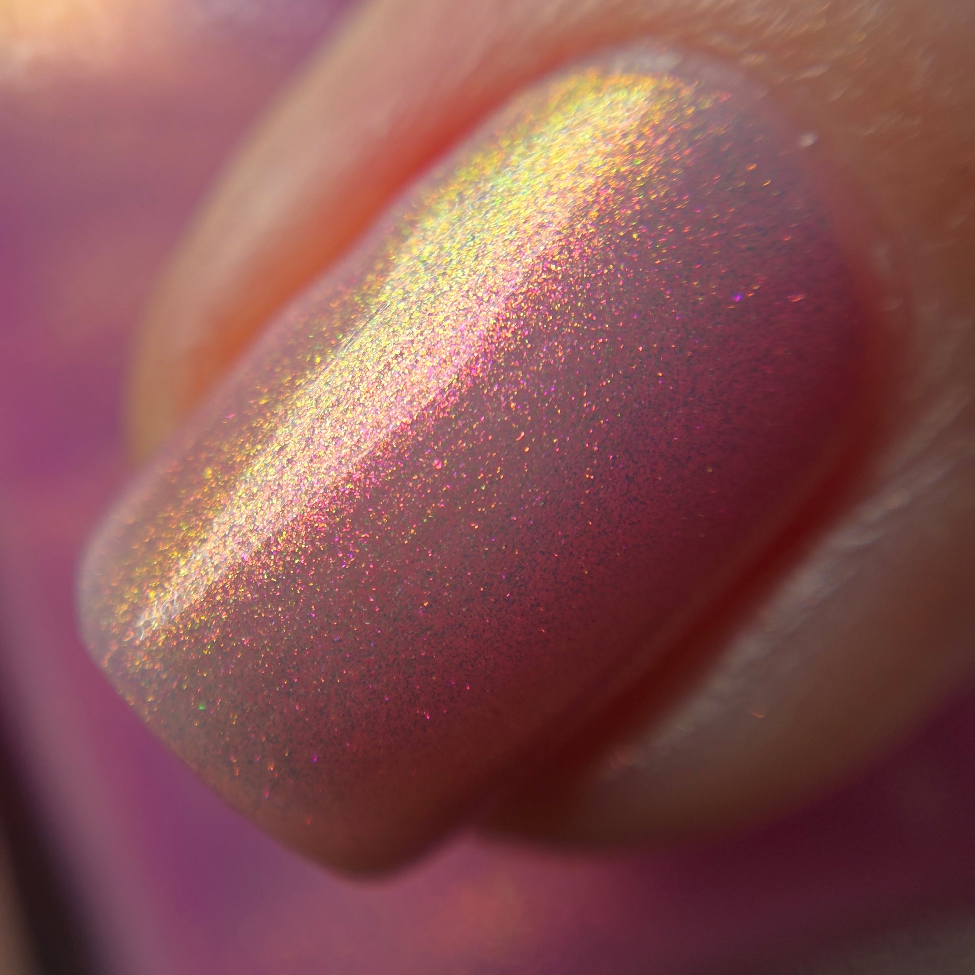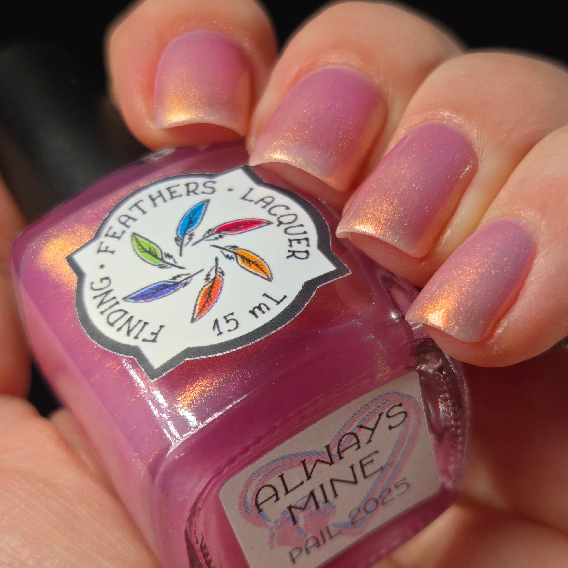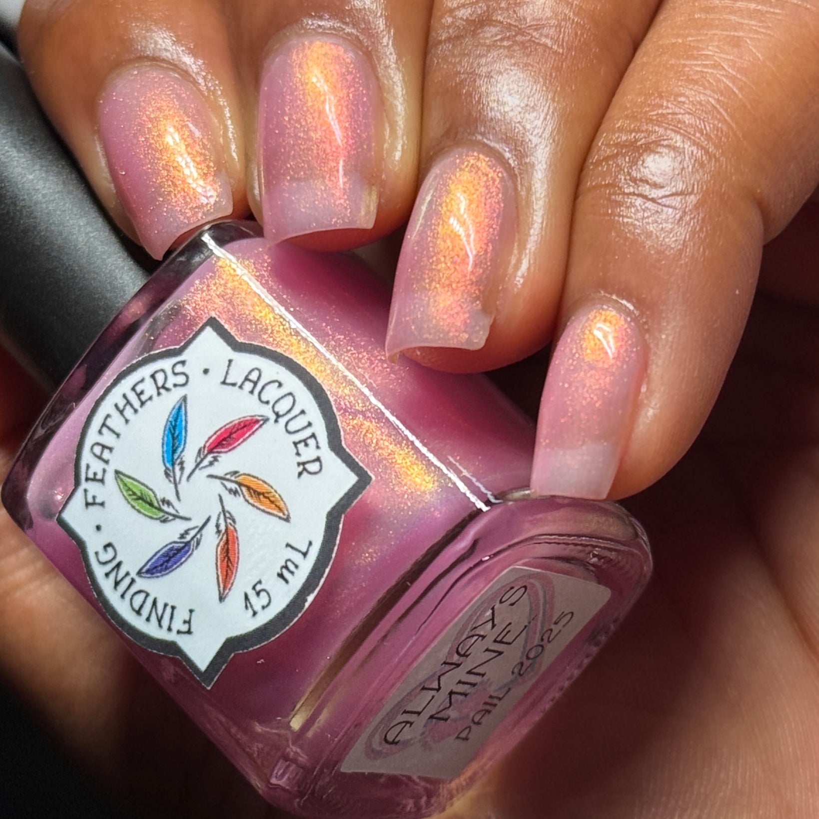 Always Mine... is a semi-sheer cherry blossom pink polish alight with pink/orange/gold/lime multichrome shimmer.