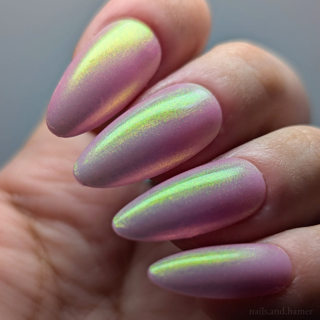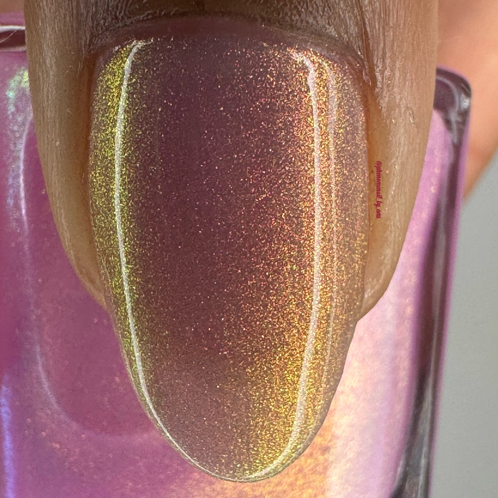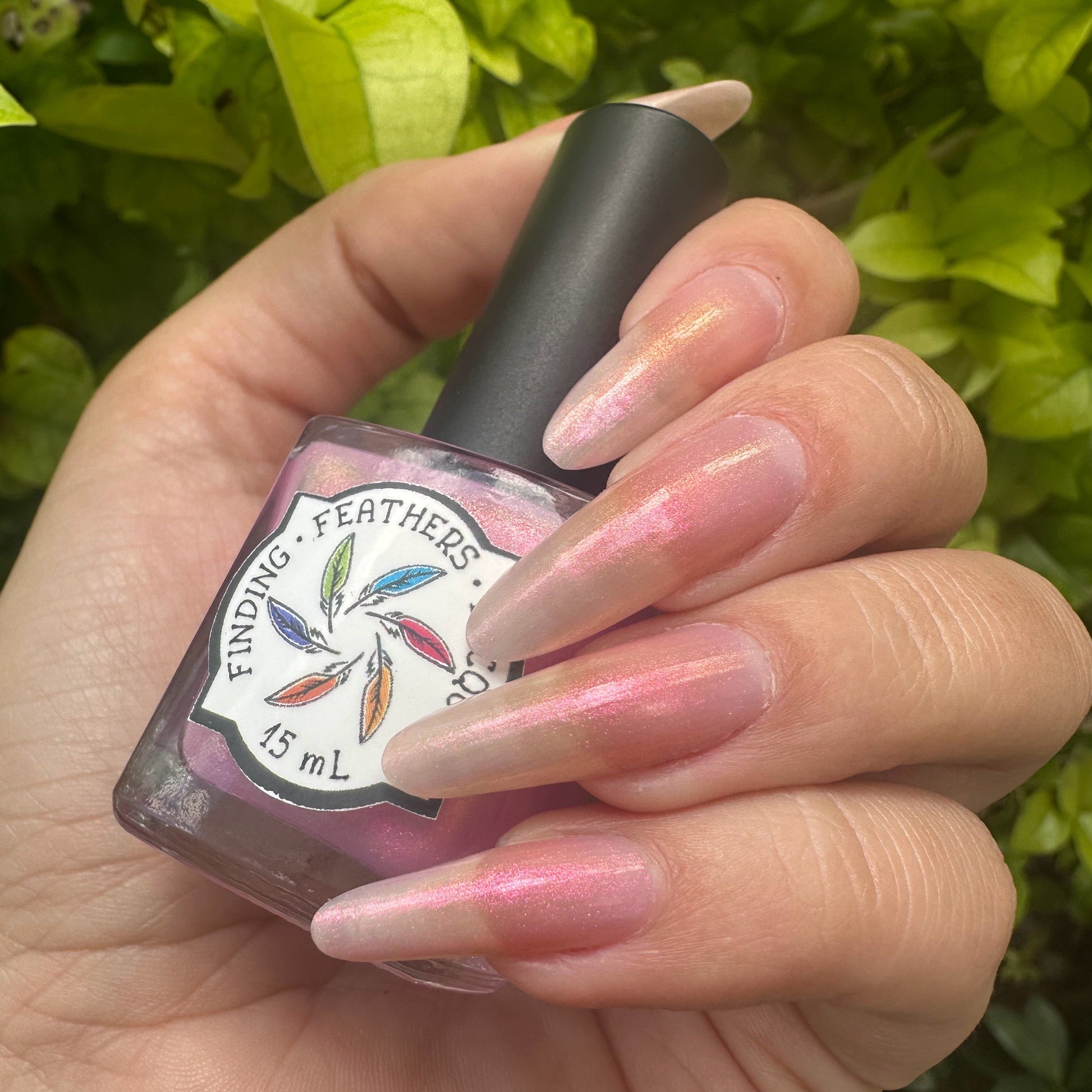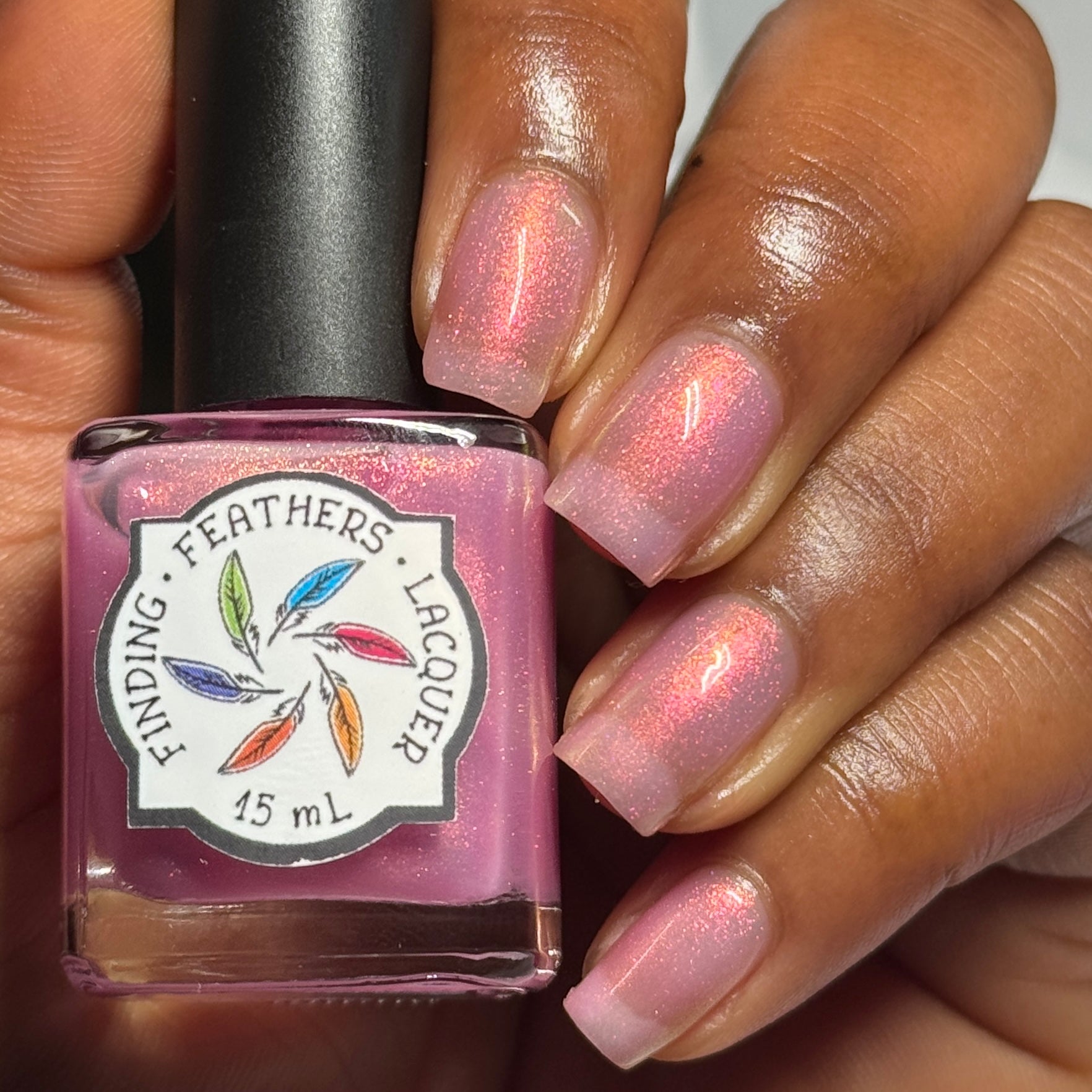 Always Mine... is a semi-sheer cherry blossom pink polish alight with pink/orange/gold/lime multichrome shimmer.