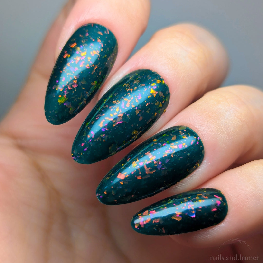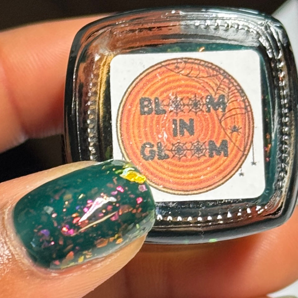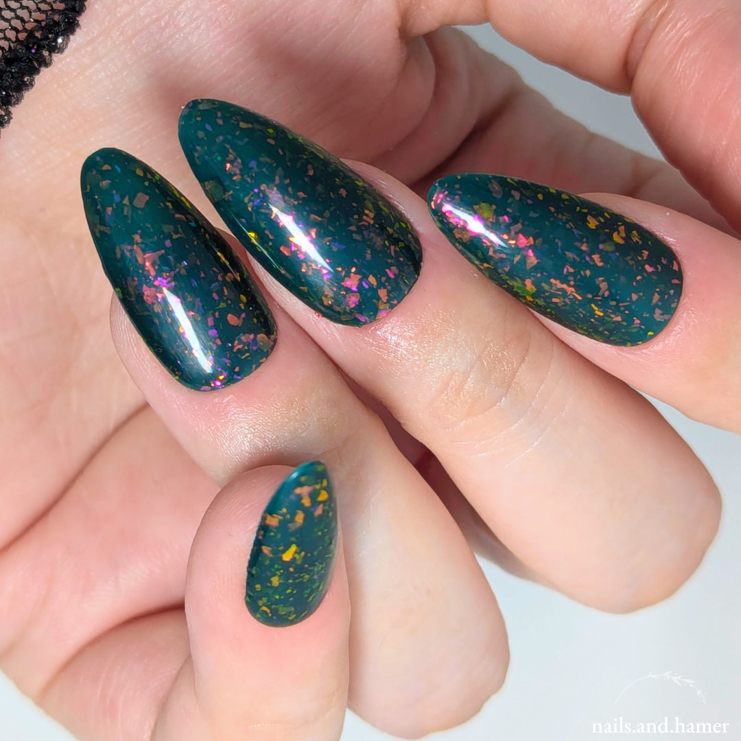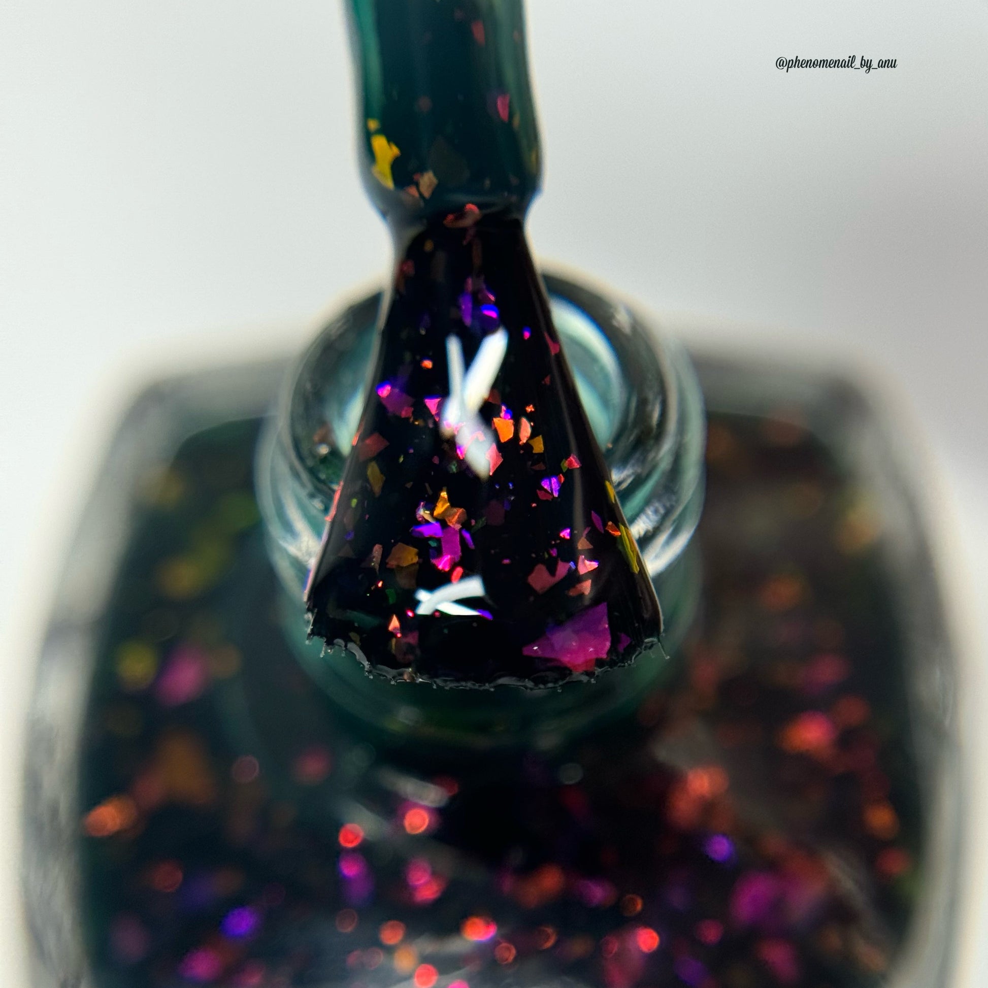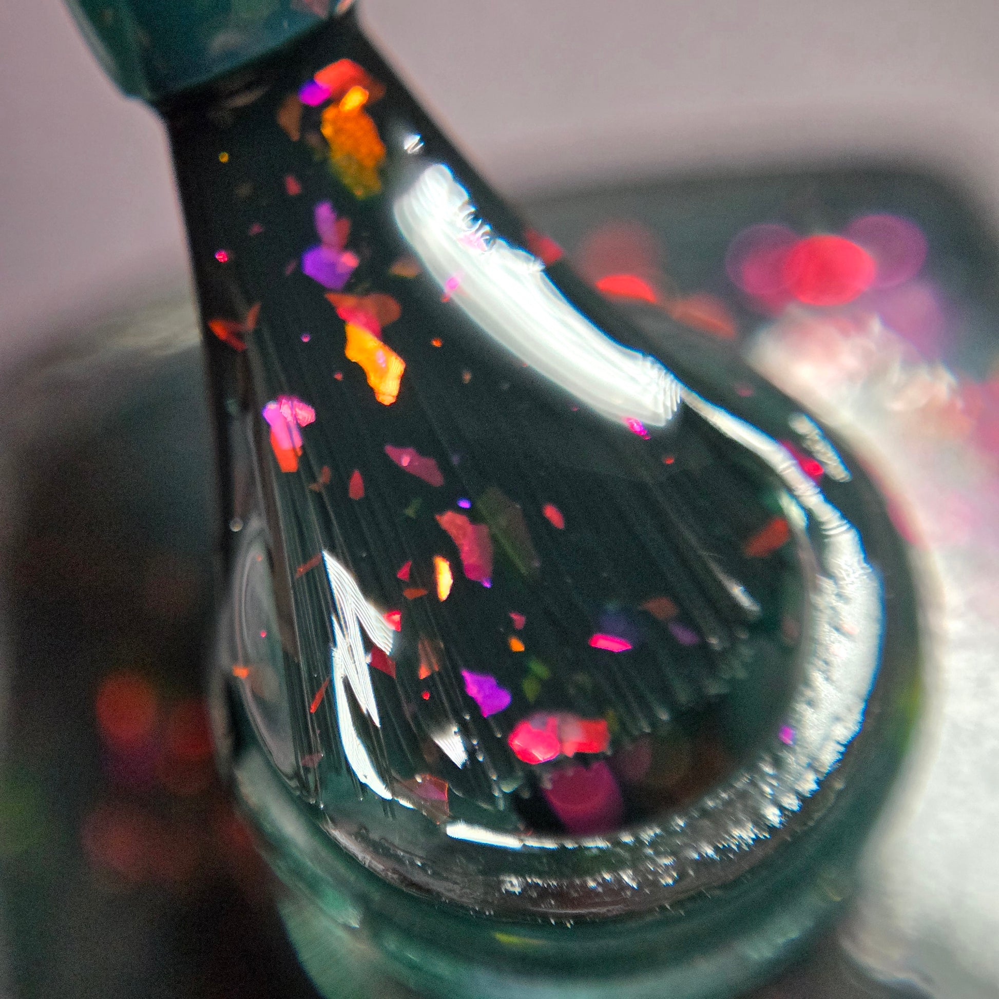 Bloom in Gloom is a midnight teal jelly blossoming with magenta/copper/orange/gold/lime green multichrome flakies.