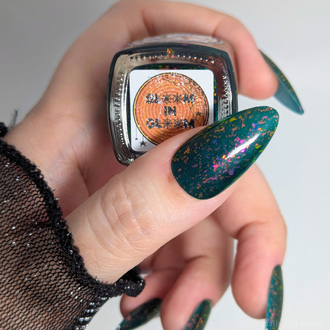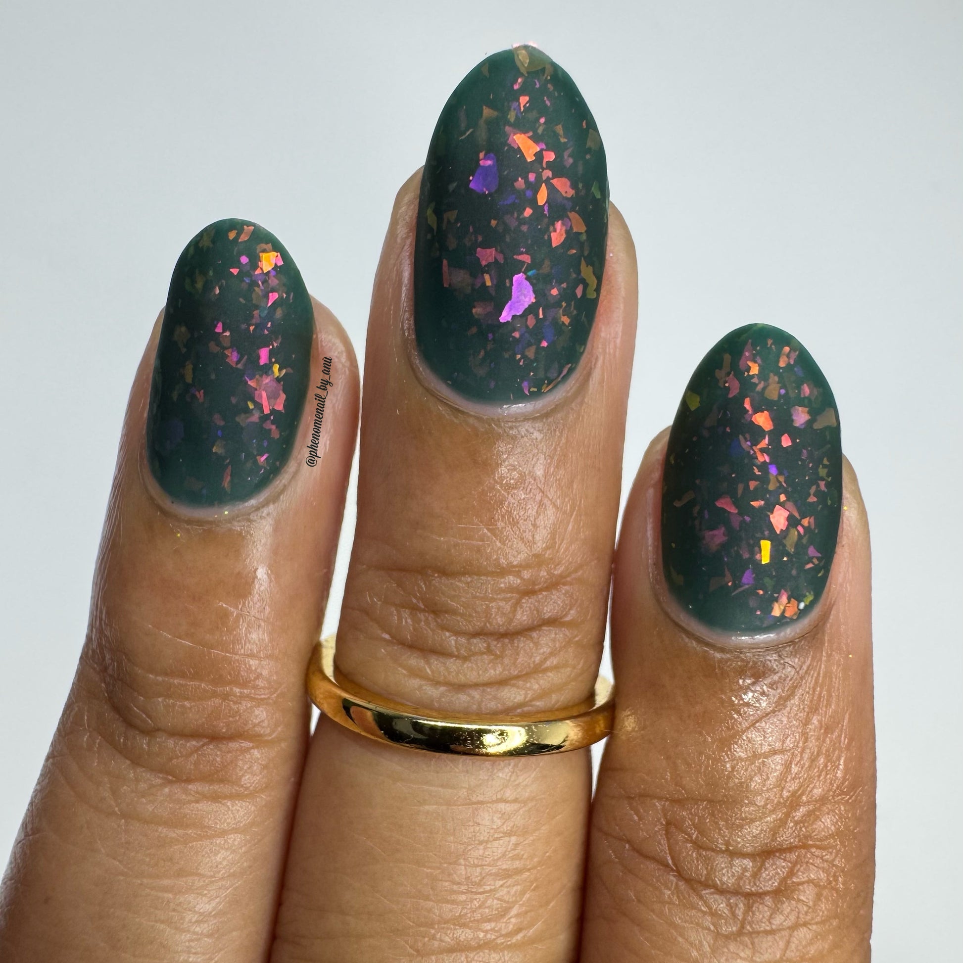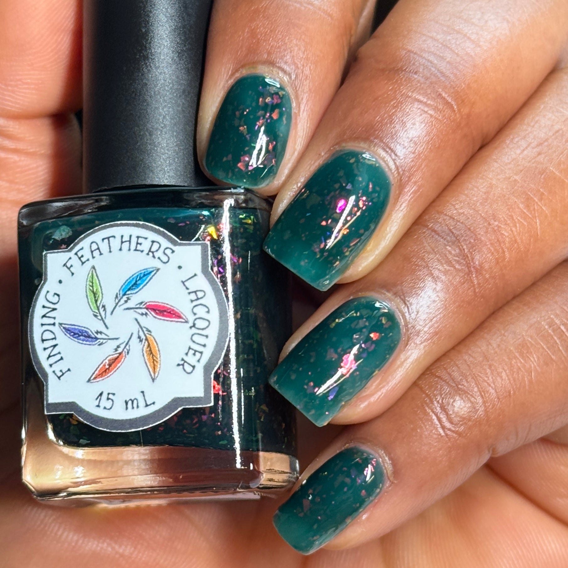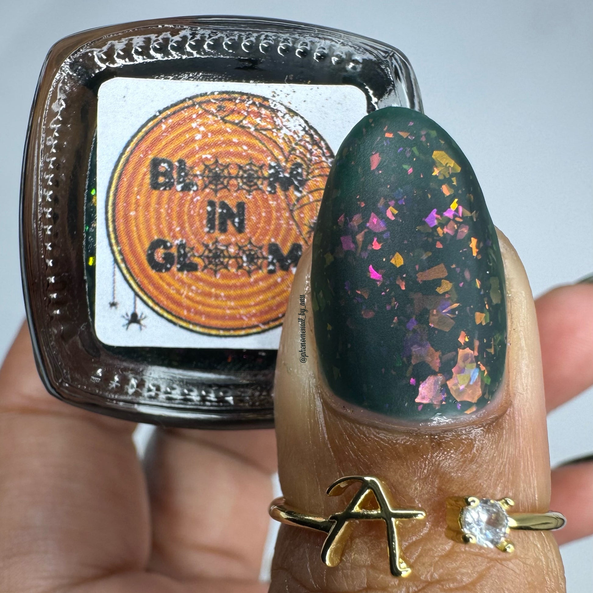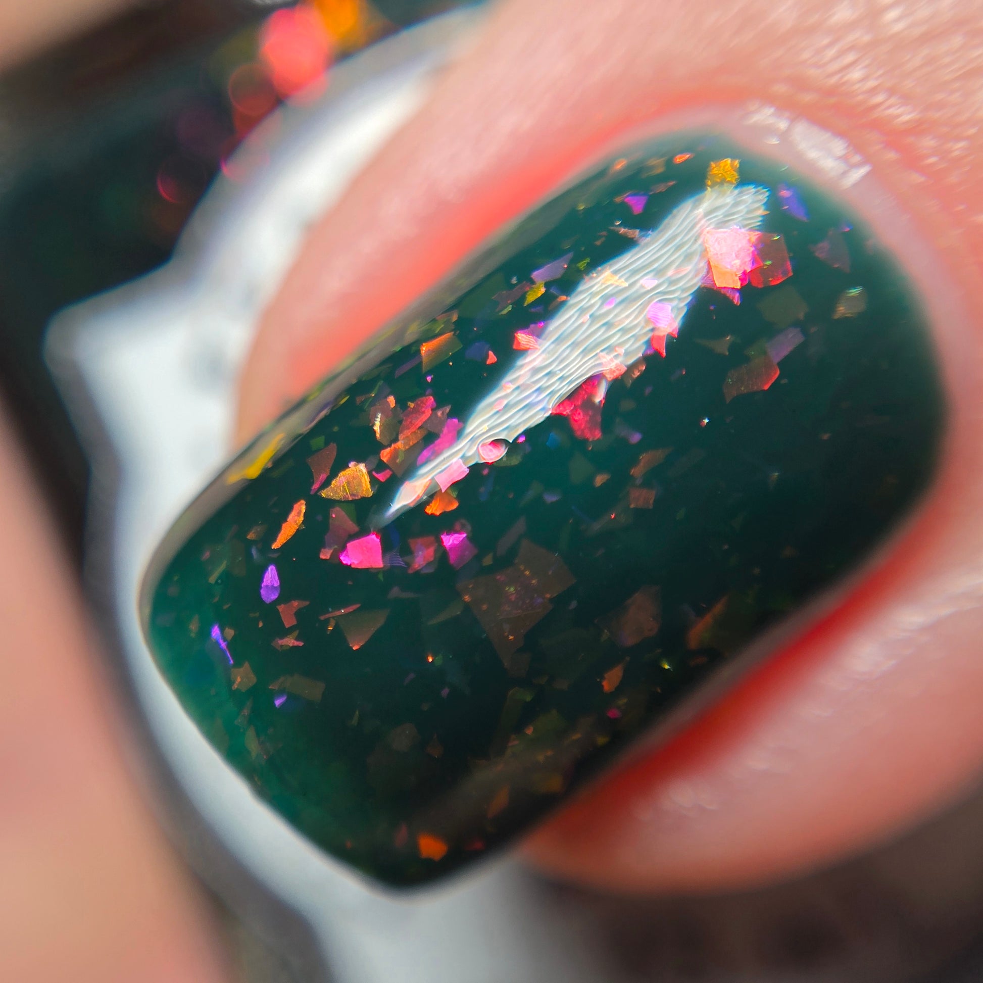 Bloom in Gloom is a midnight teal jelly blossoming with magenta/copper/orange/gold/lime green multichrome flakies.