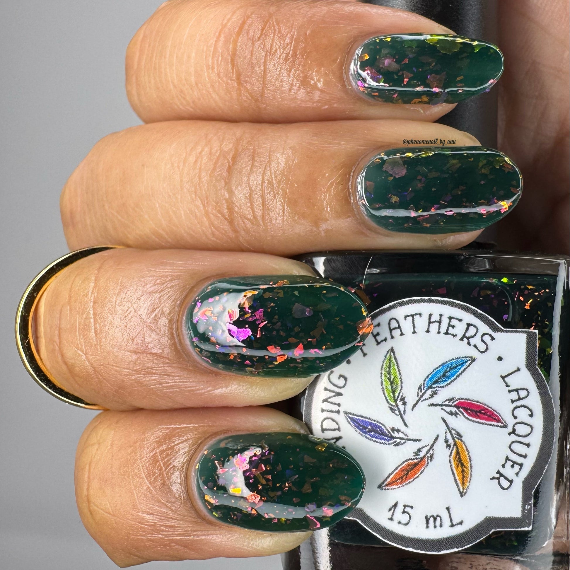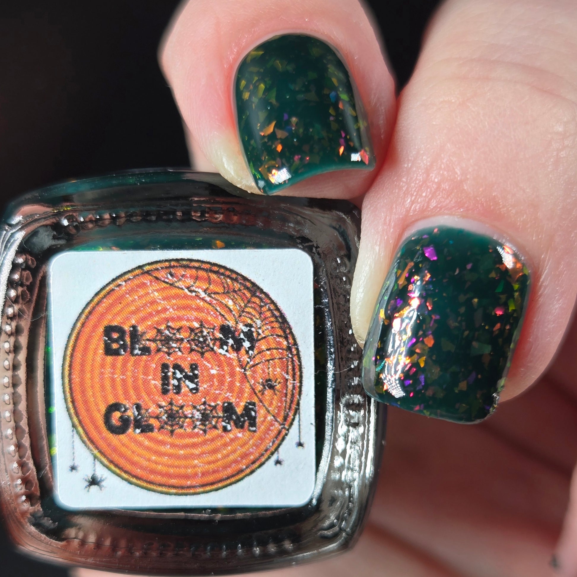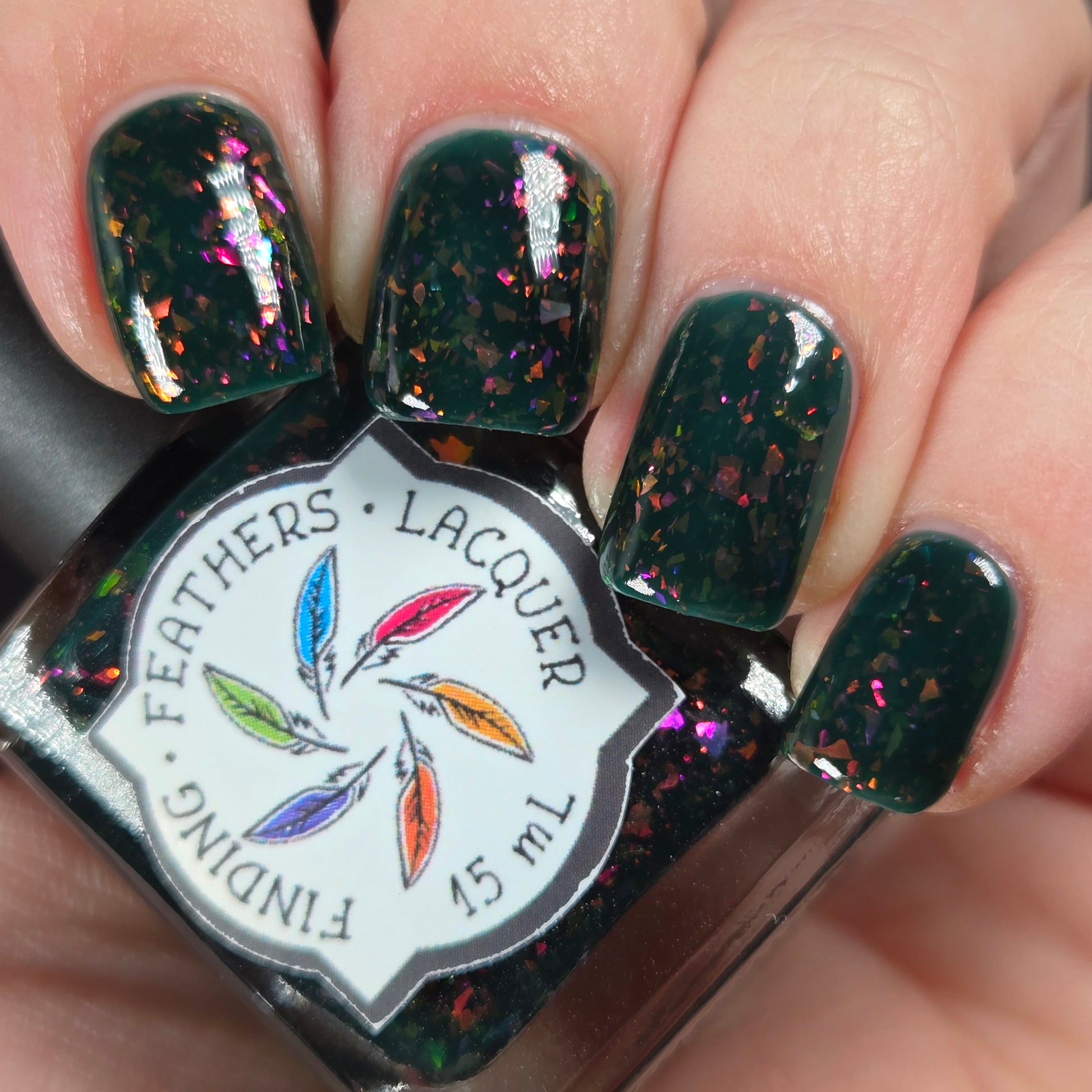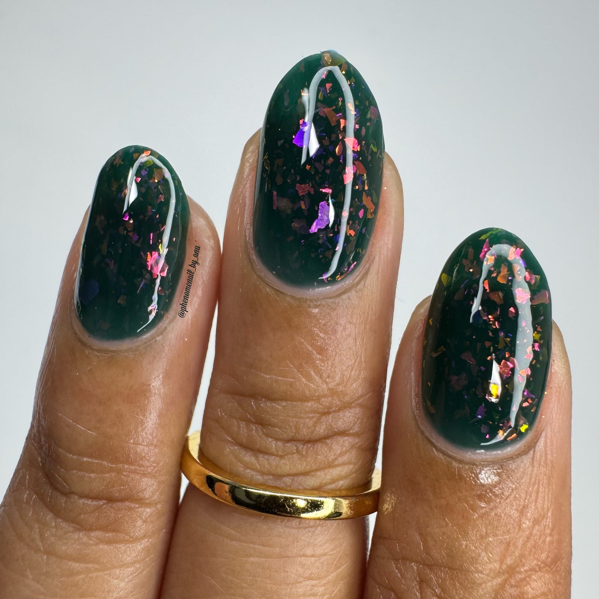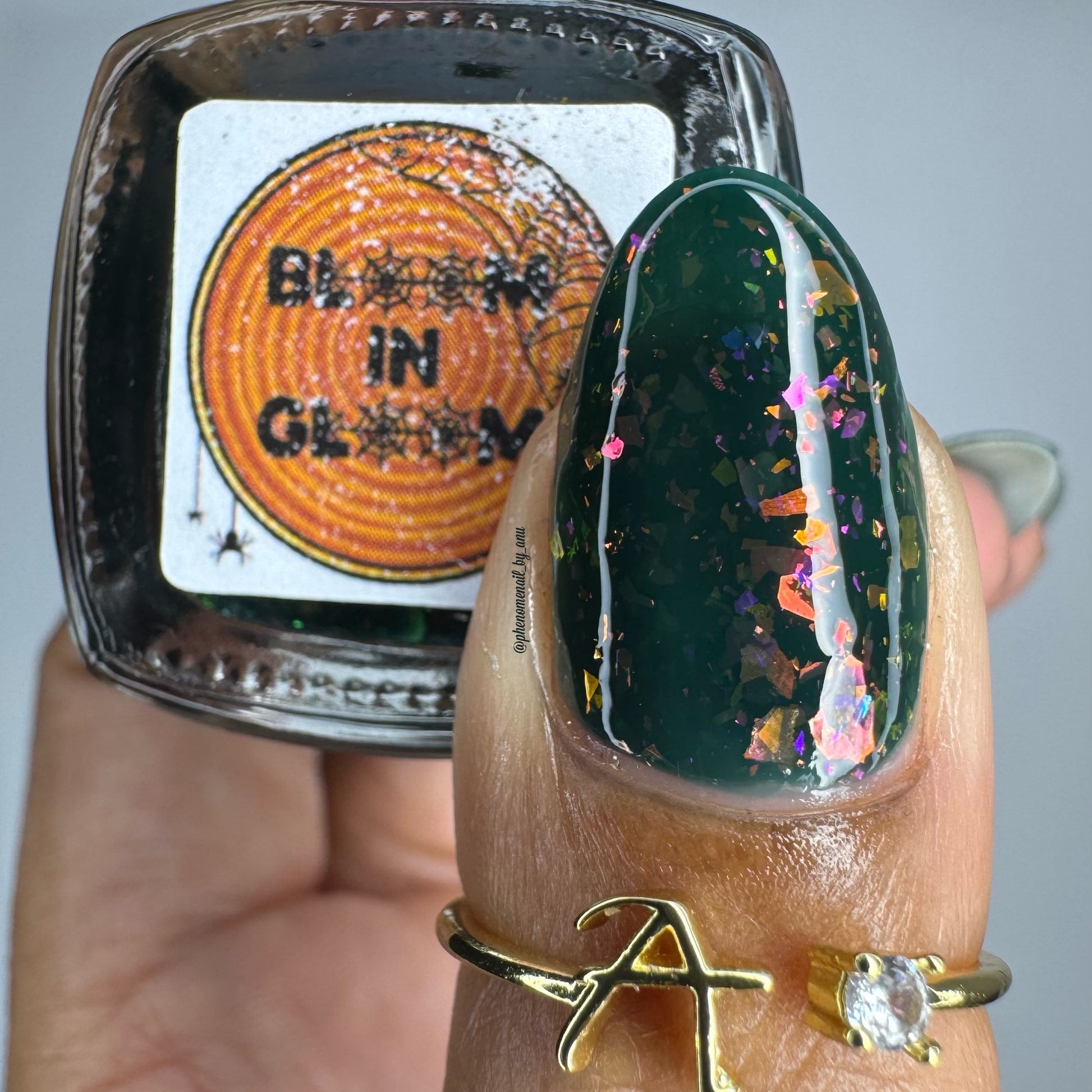 Bloom in Gloom is a midnight teal jelly blossoming with magenta/copper/orange/gold/lime green multichrome flakies.