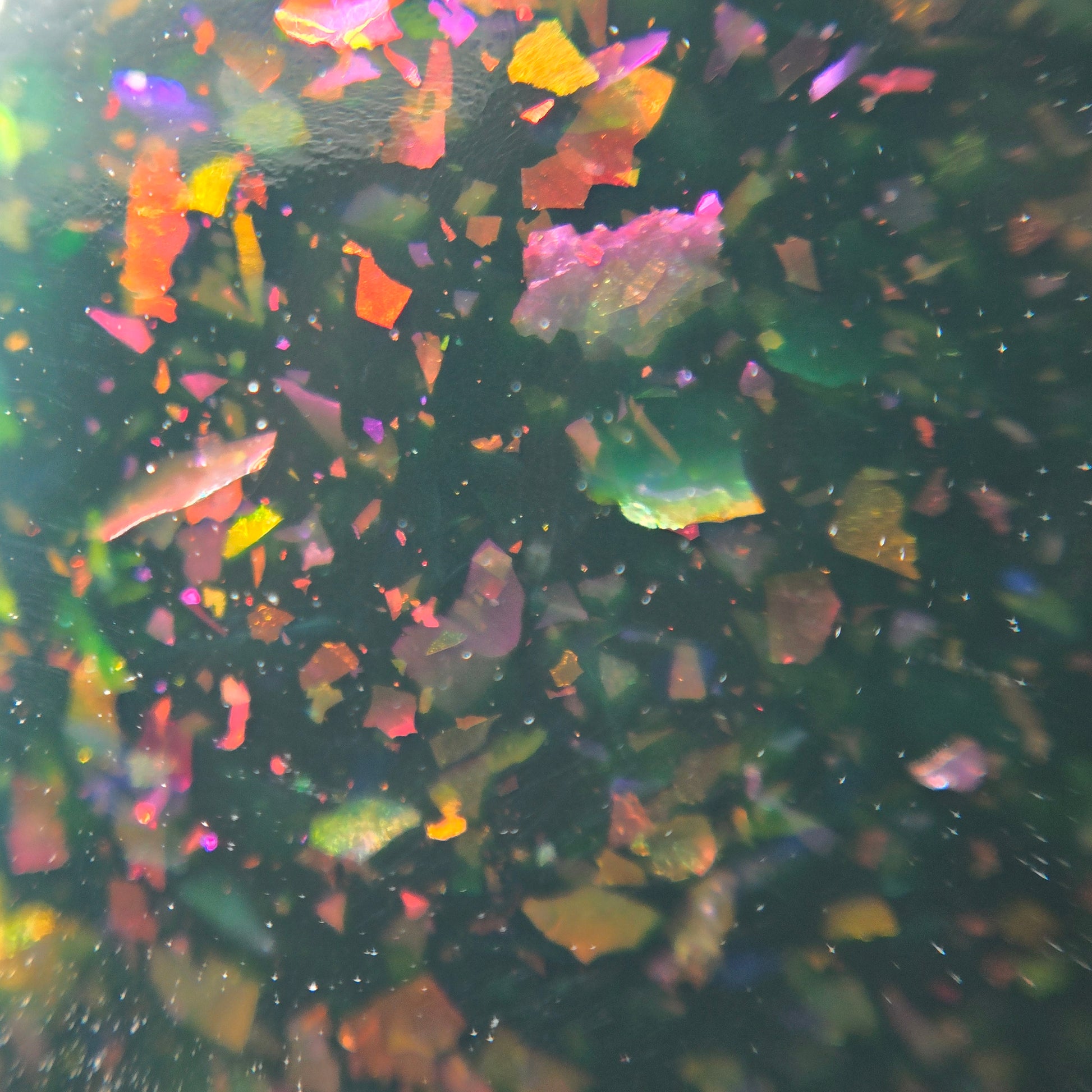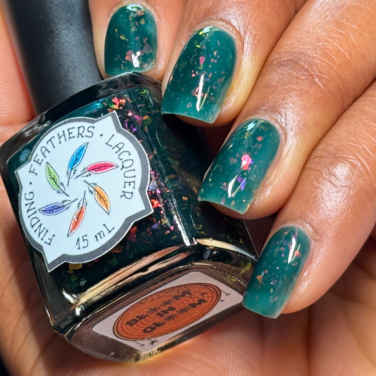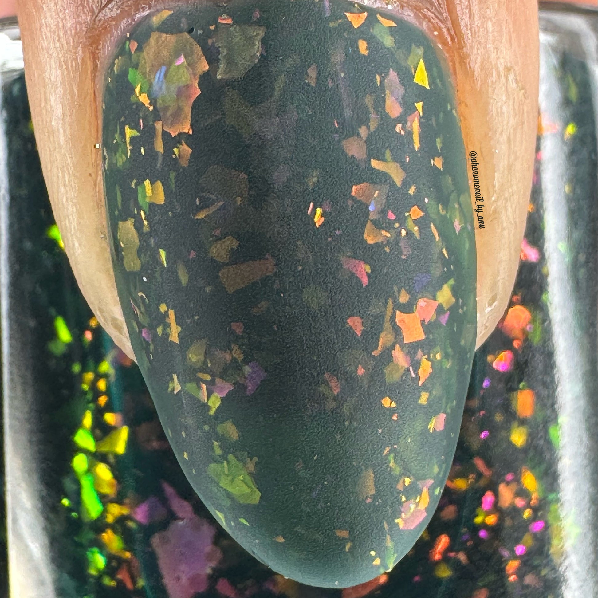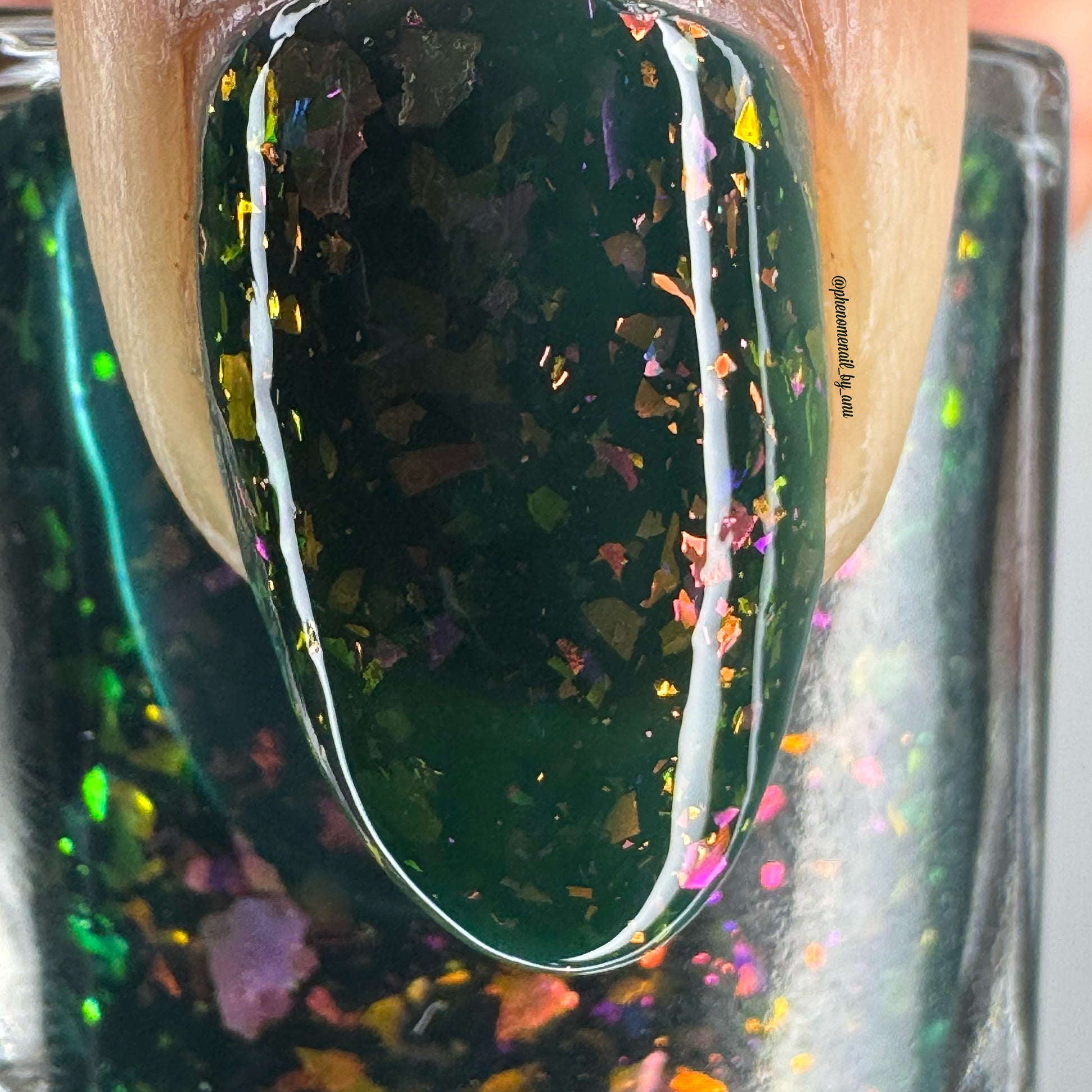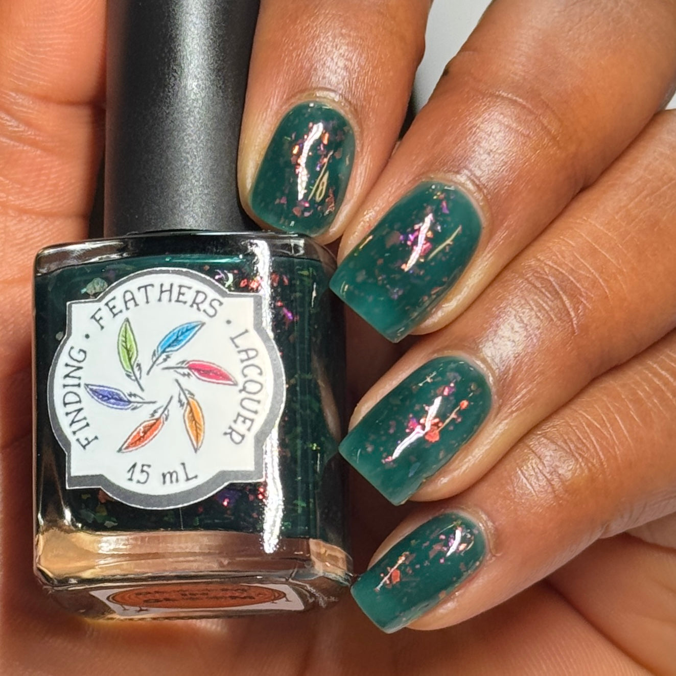 Bloom in Gloom is a midnight teal jelly blossoming with magenta/copper/orange/gold/lime green multichrome flakies.