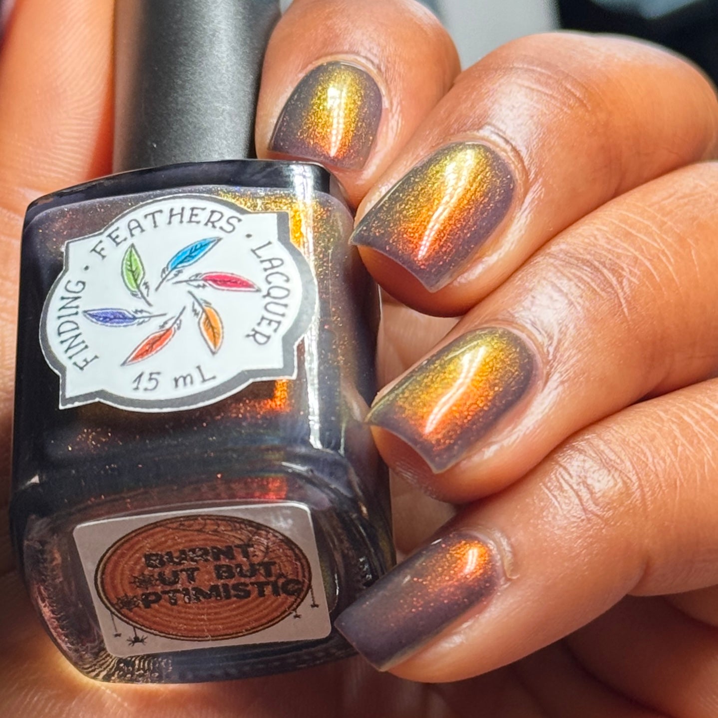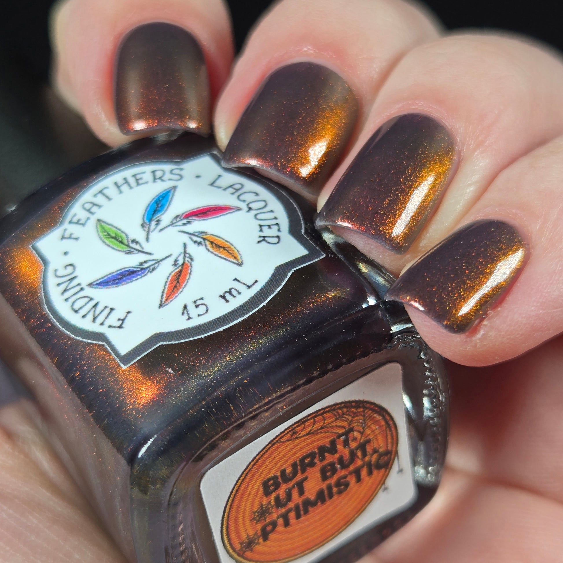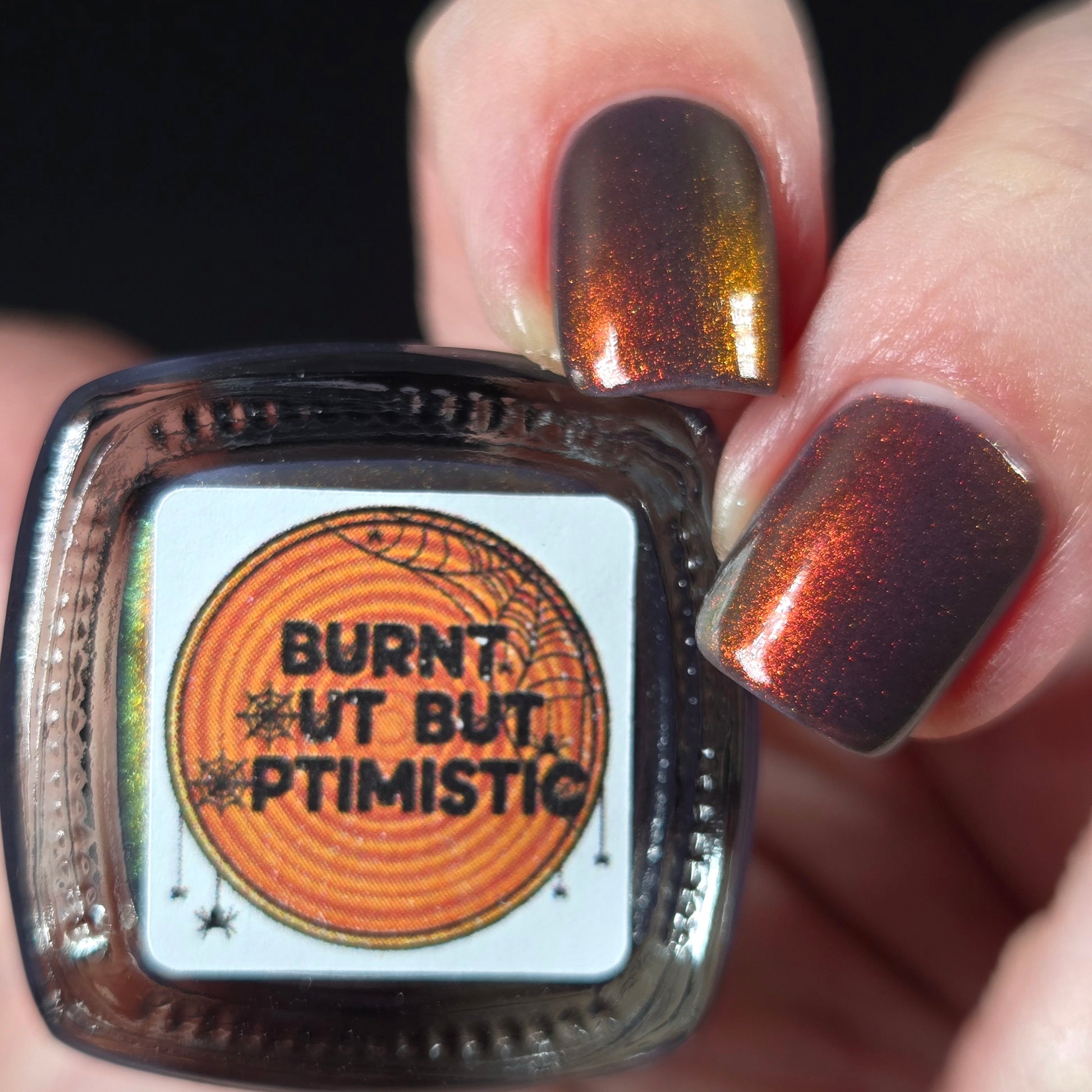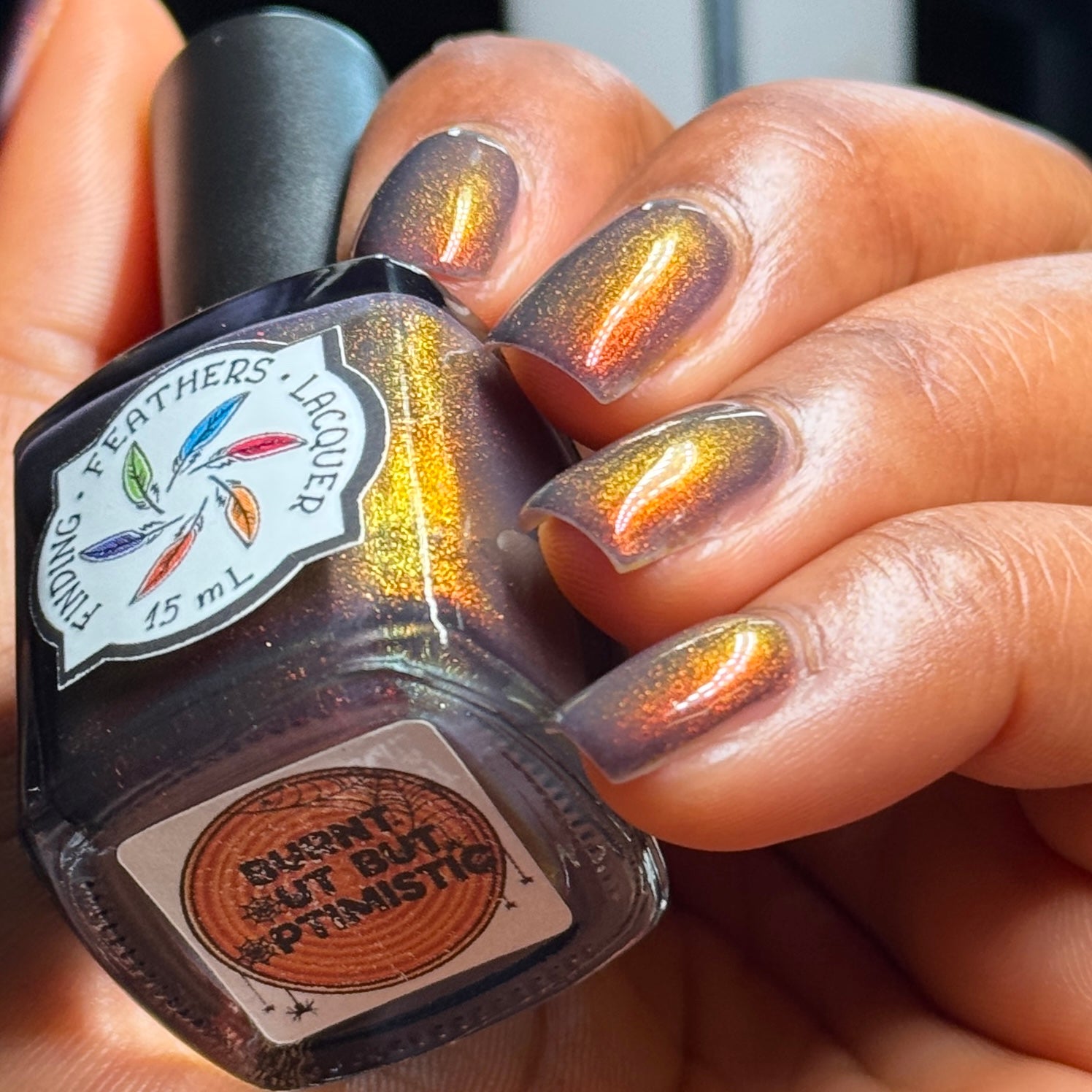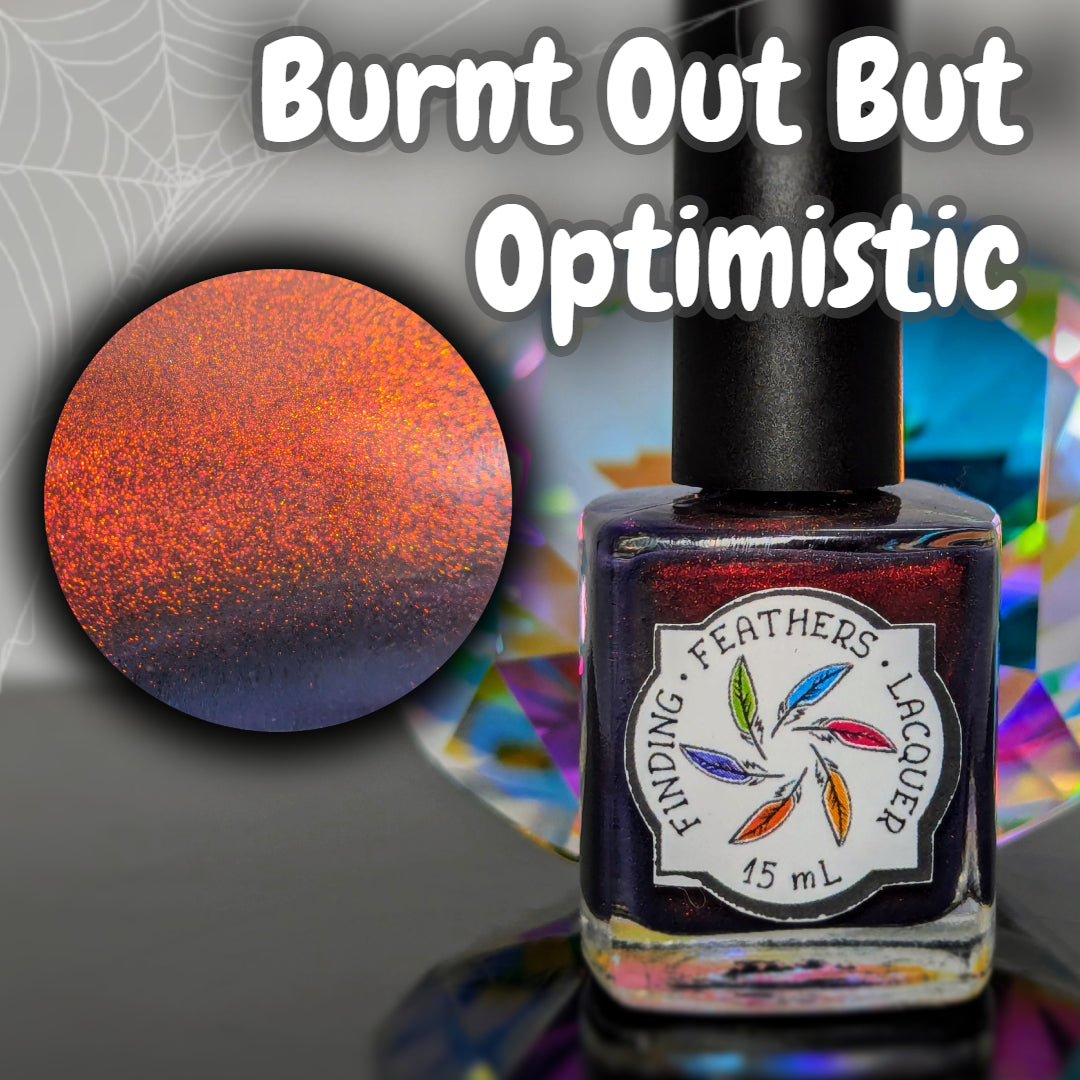 Burnt Out But Optimistic is a deep raisin/plum based polish with strong red/orange/gold/lime green multichrome shimmer.