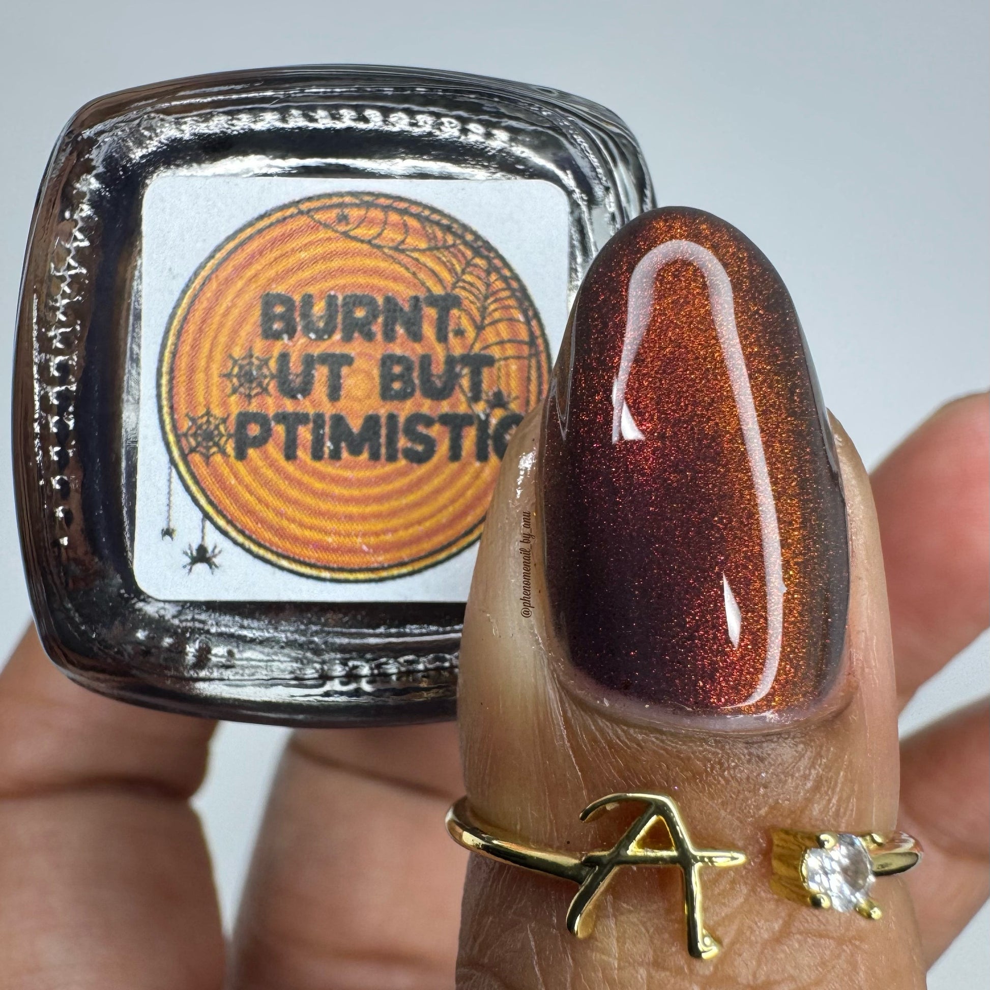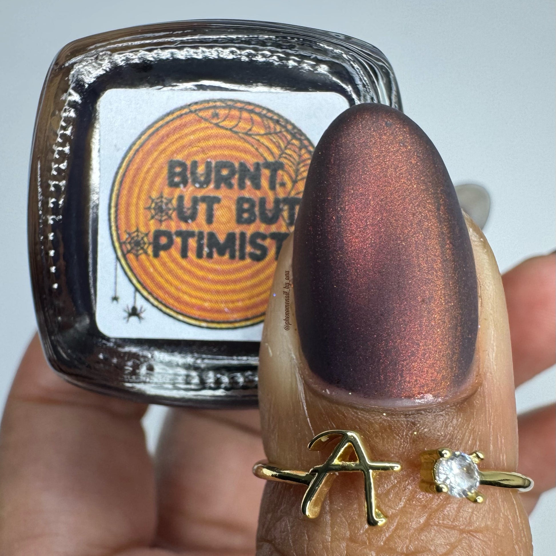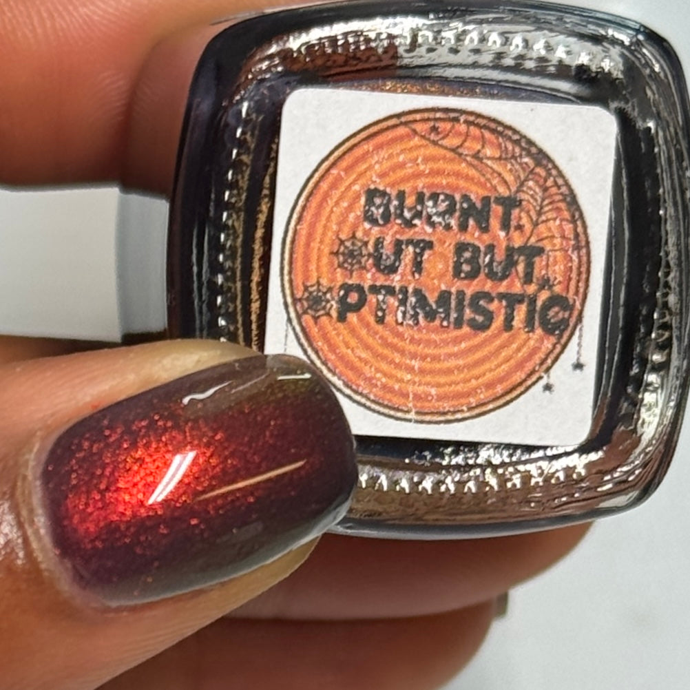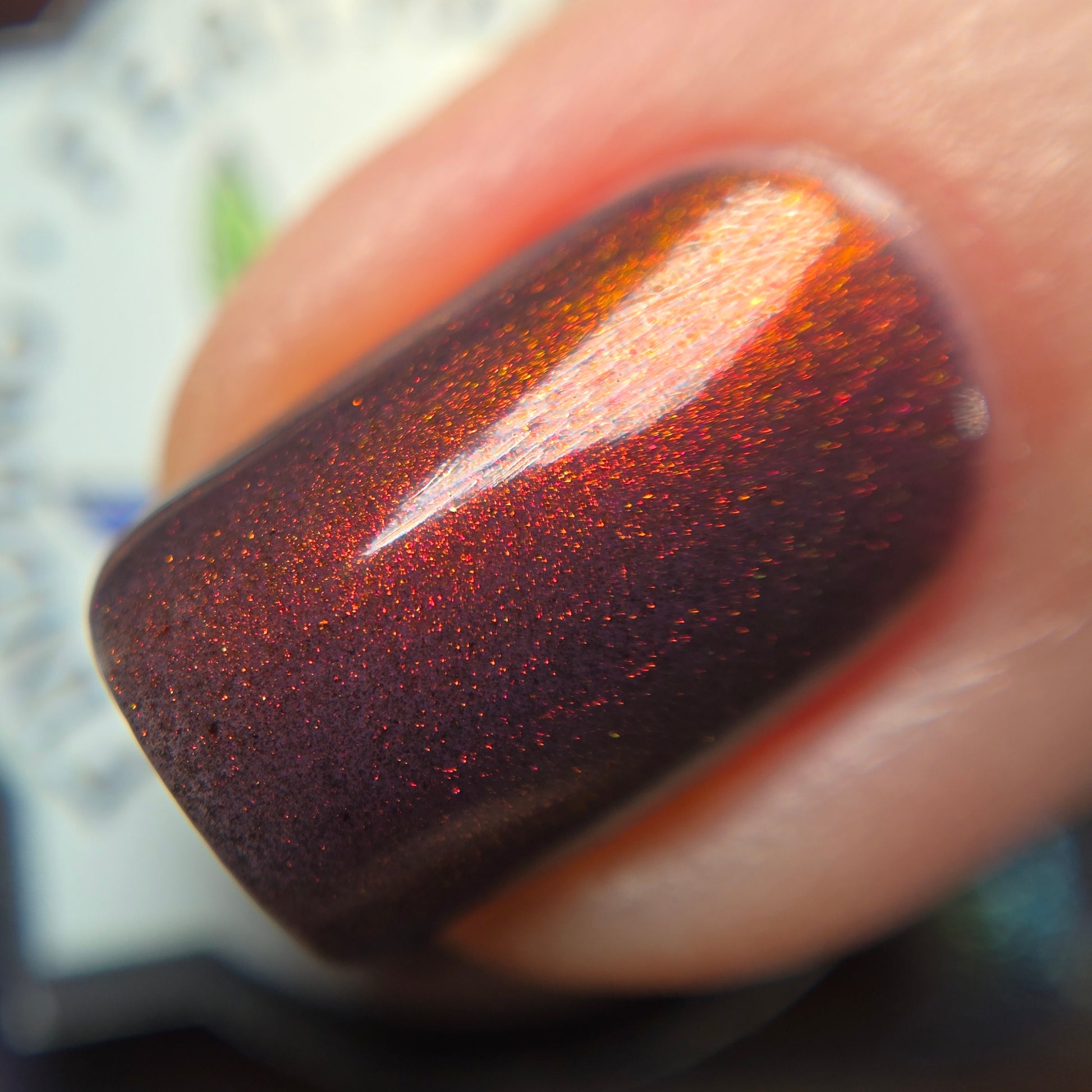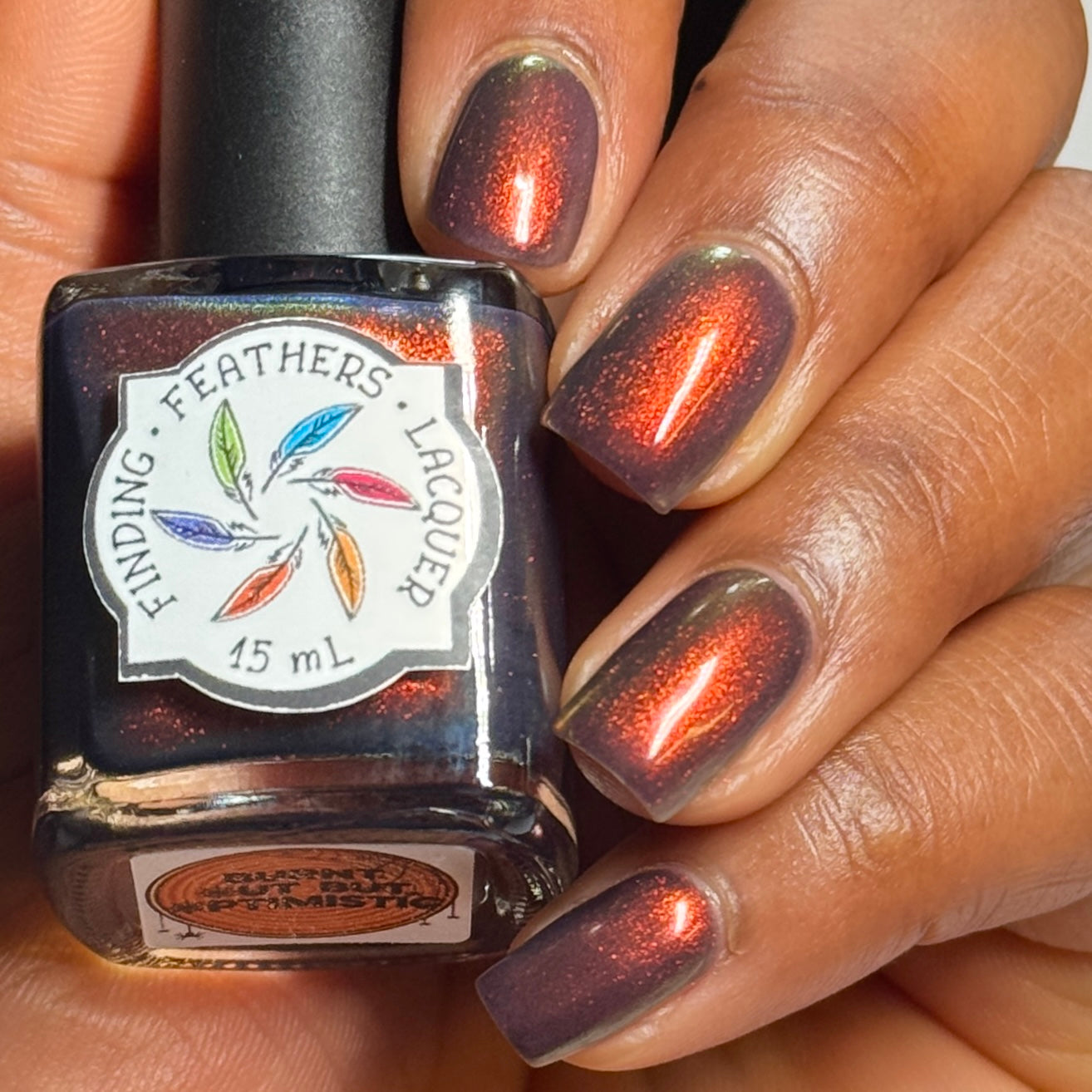 Burnt Out But Optimistic is a deep raisin/plum based polish with strong red/orange/gold/lime green multichrome shimmer.