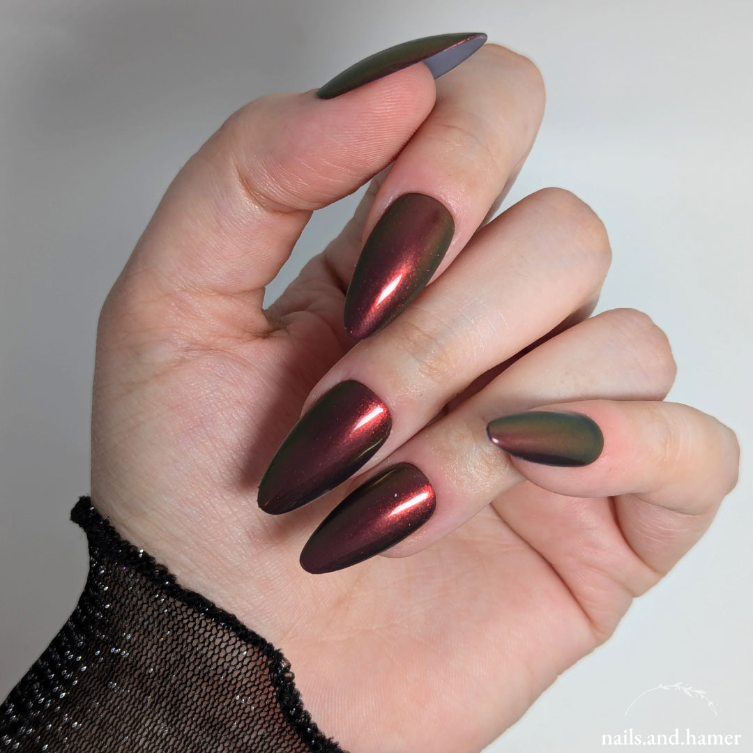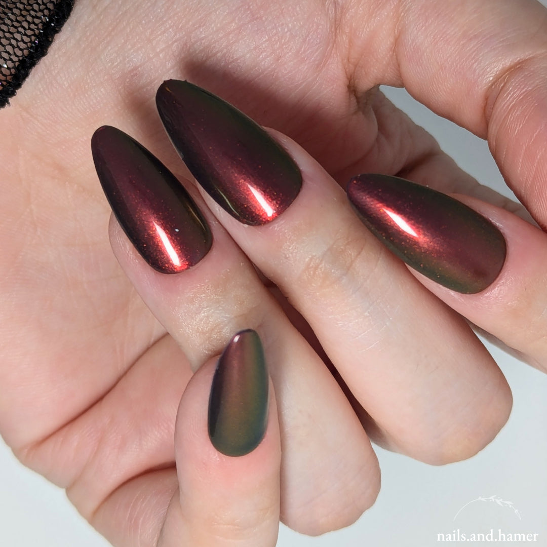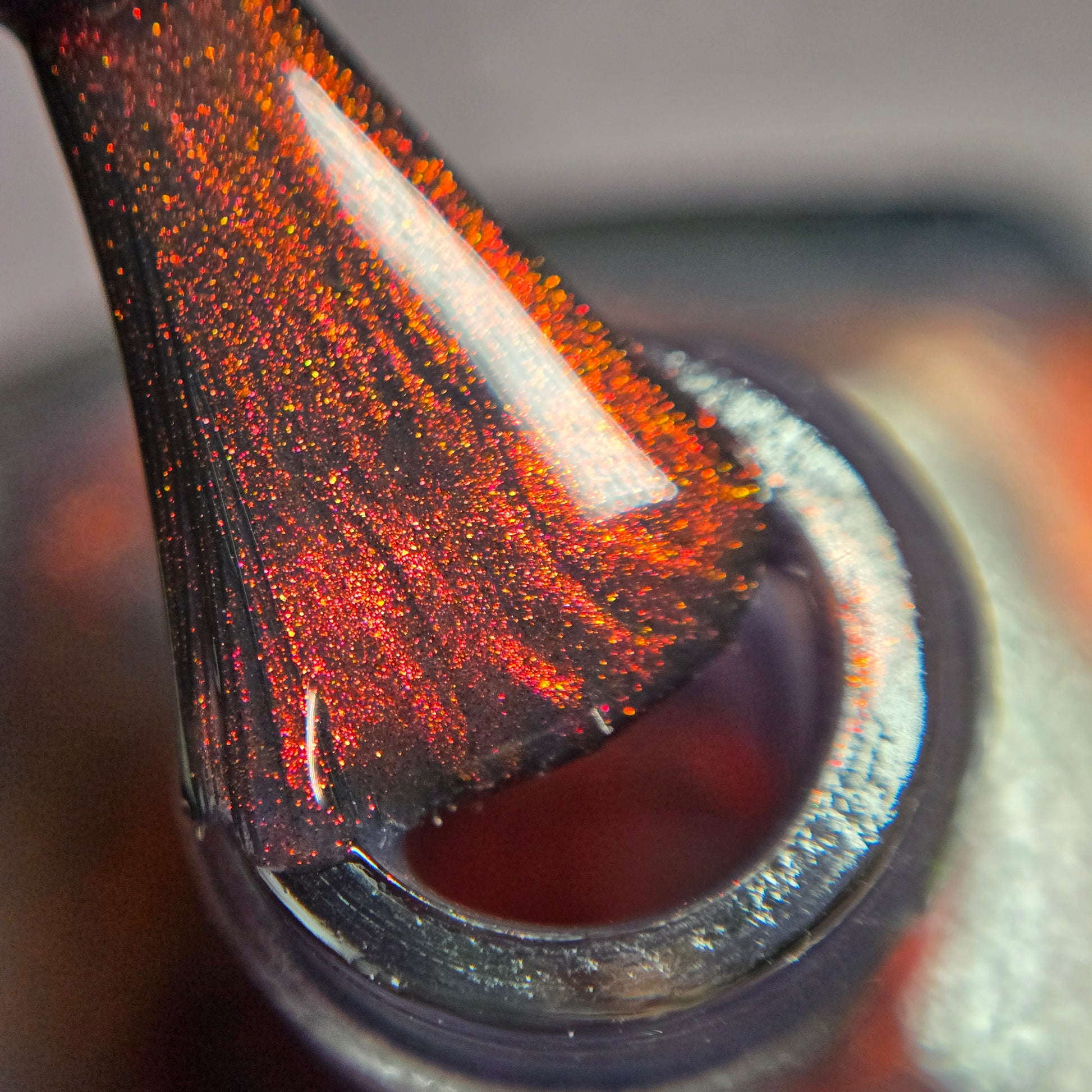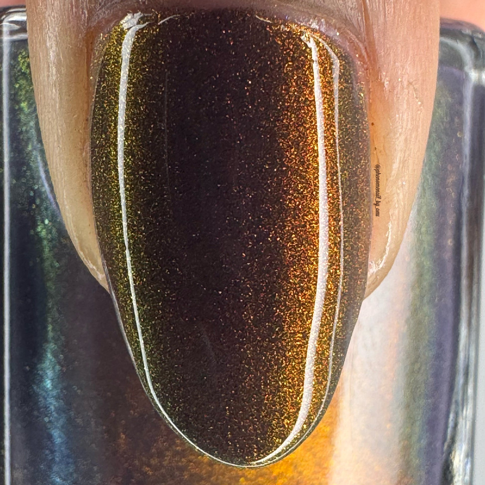 Burnt Out But Optimistic is a deep raisin/plum based polish with strong red/orange/gold/lime green multichrome shimmer.