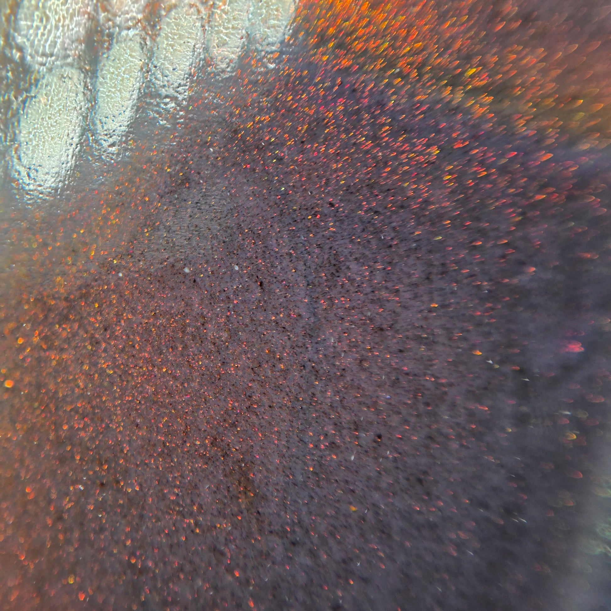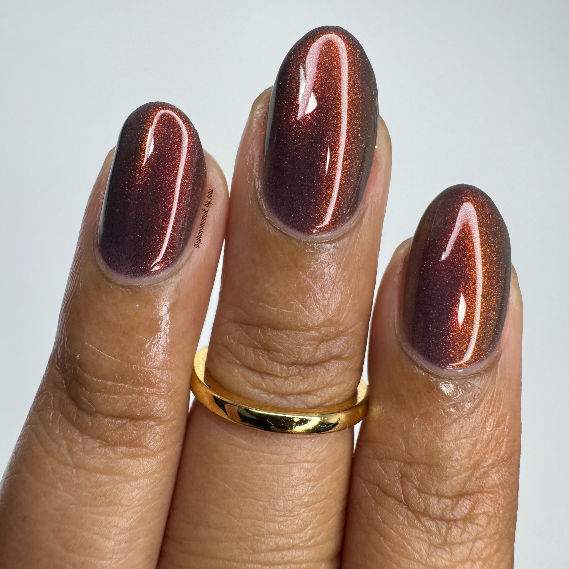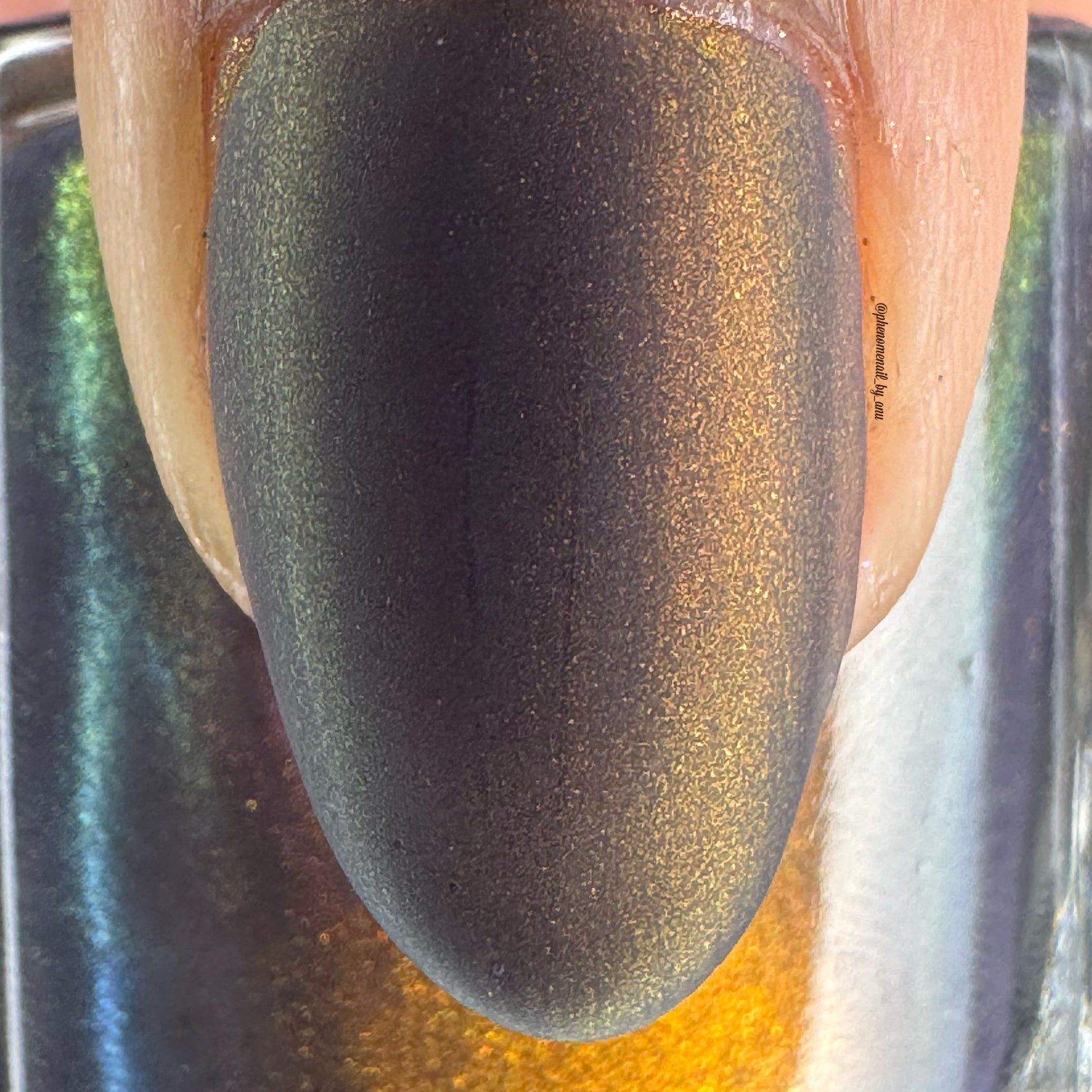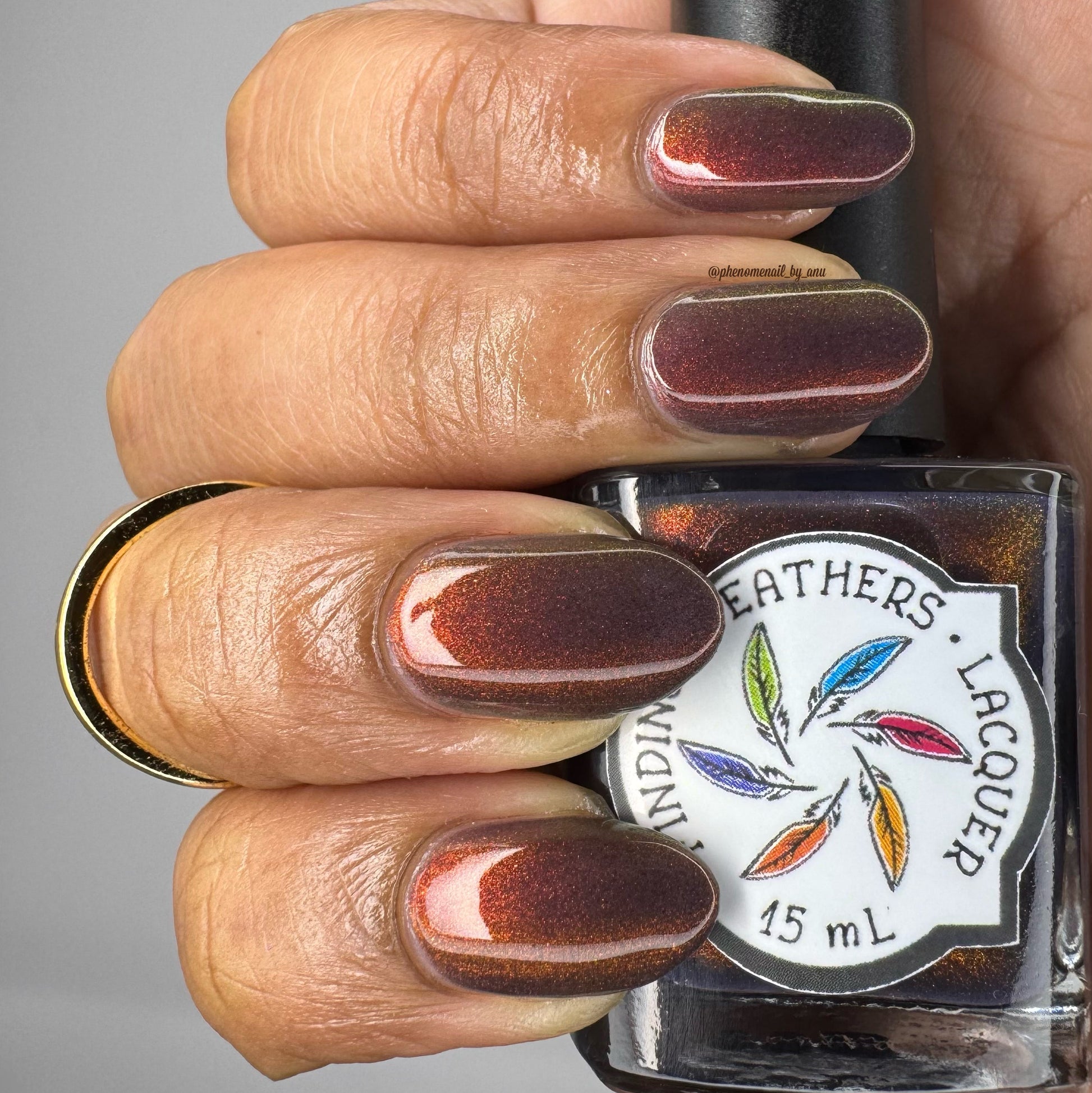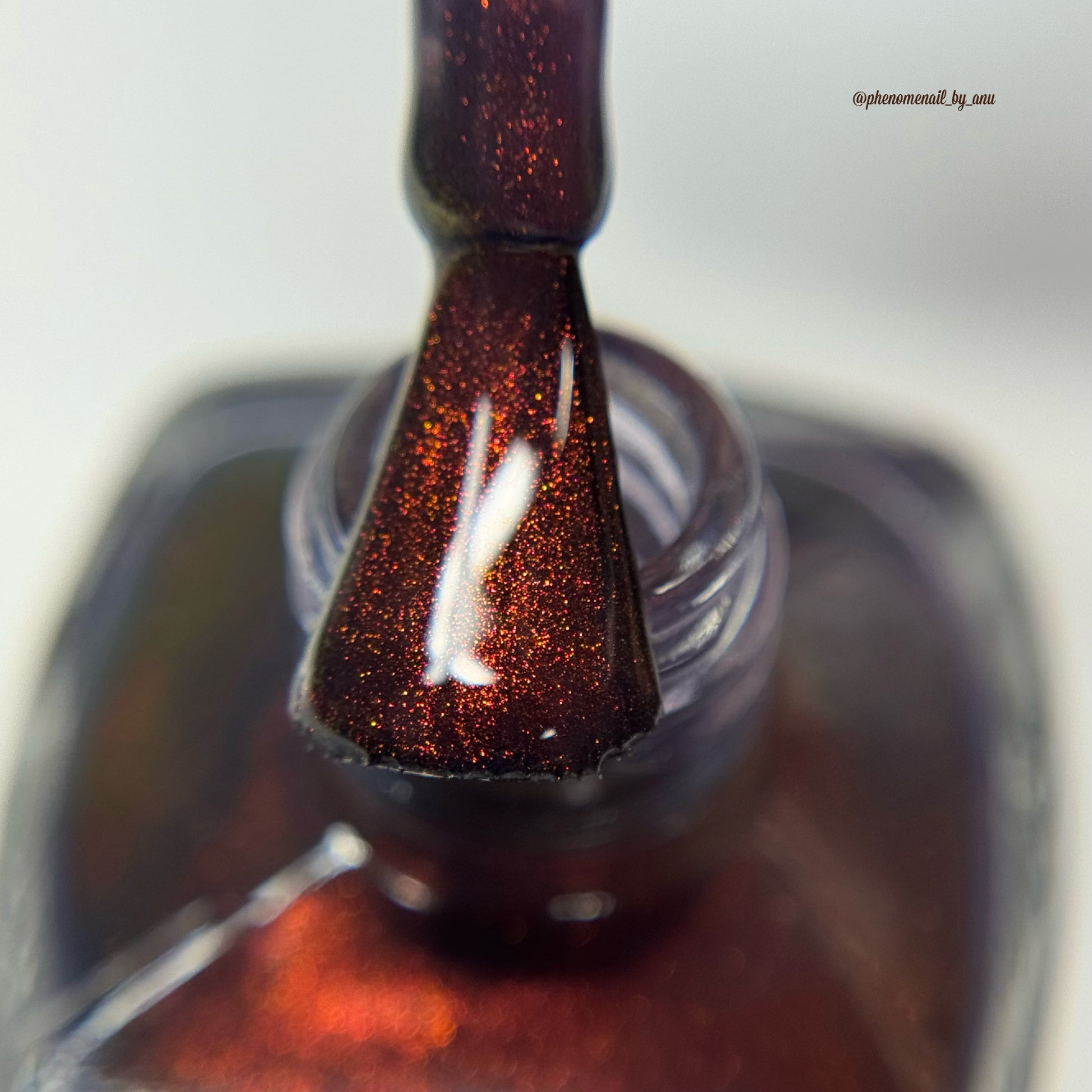 Burnt Out But Optimistic is a deep raisin/plum based polish with strong red/orange/gold/lime green multichrome shimmer.