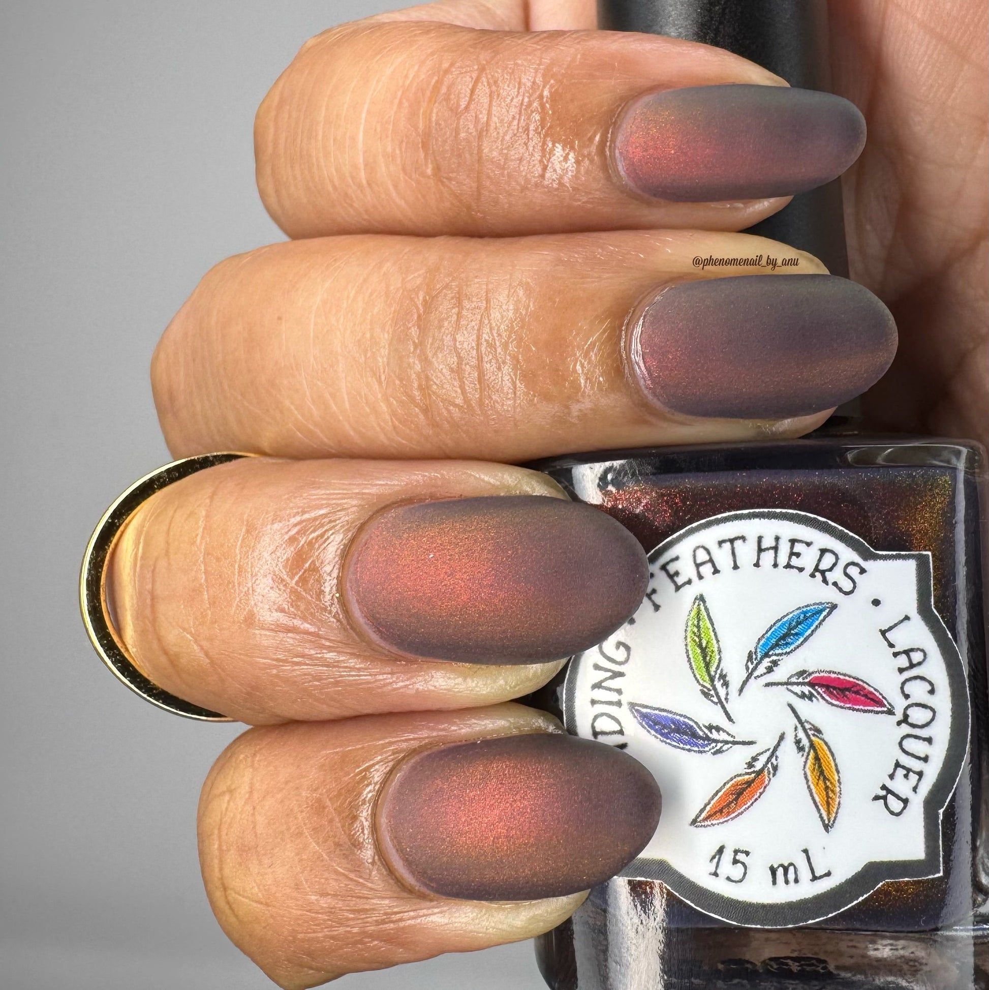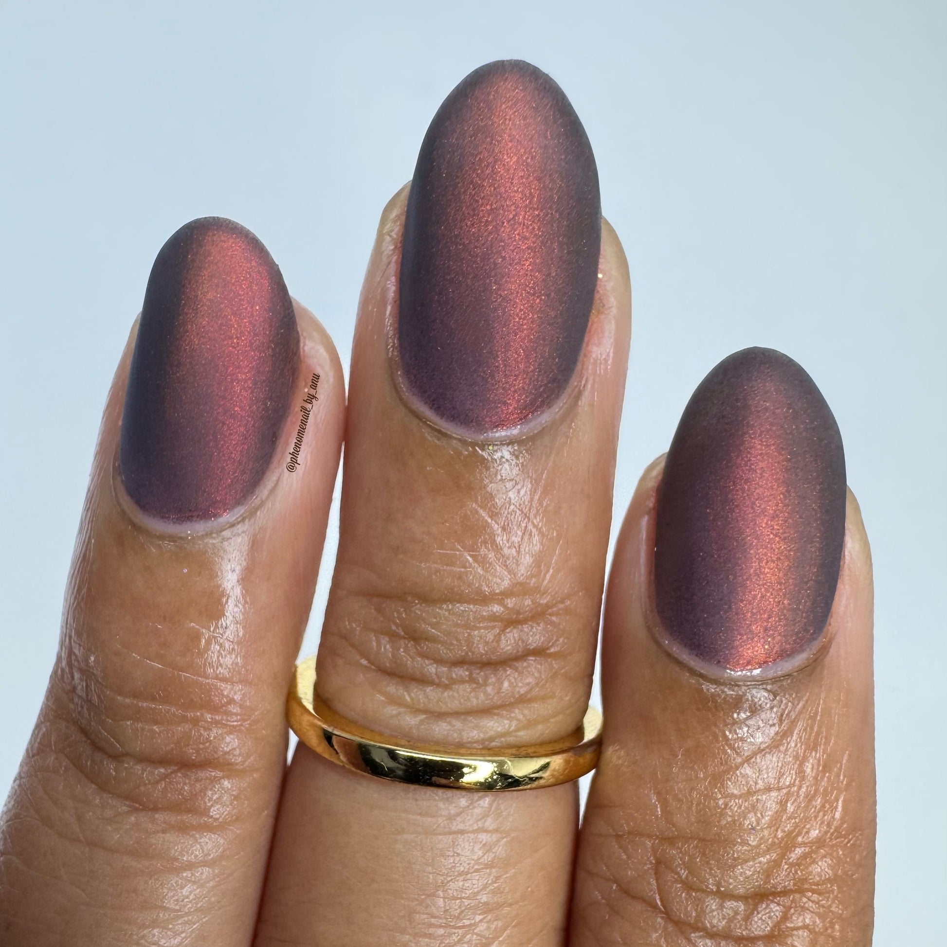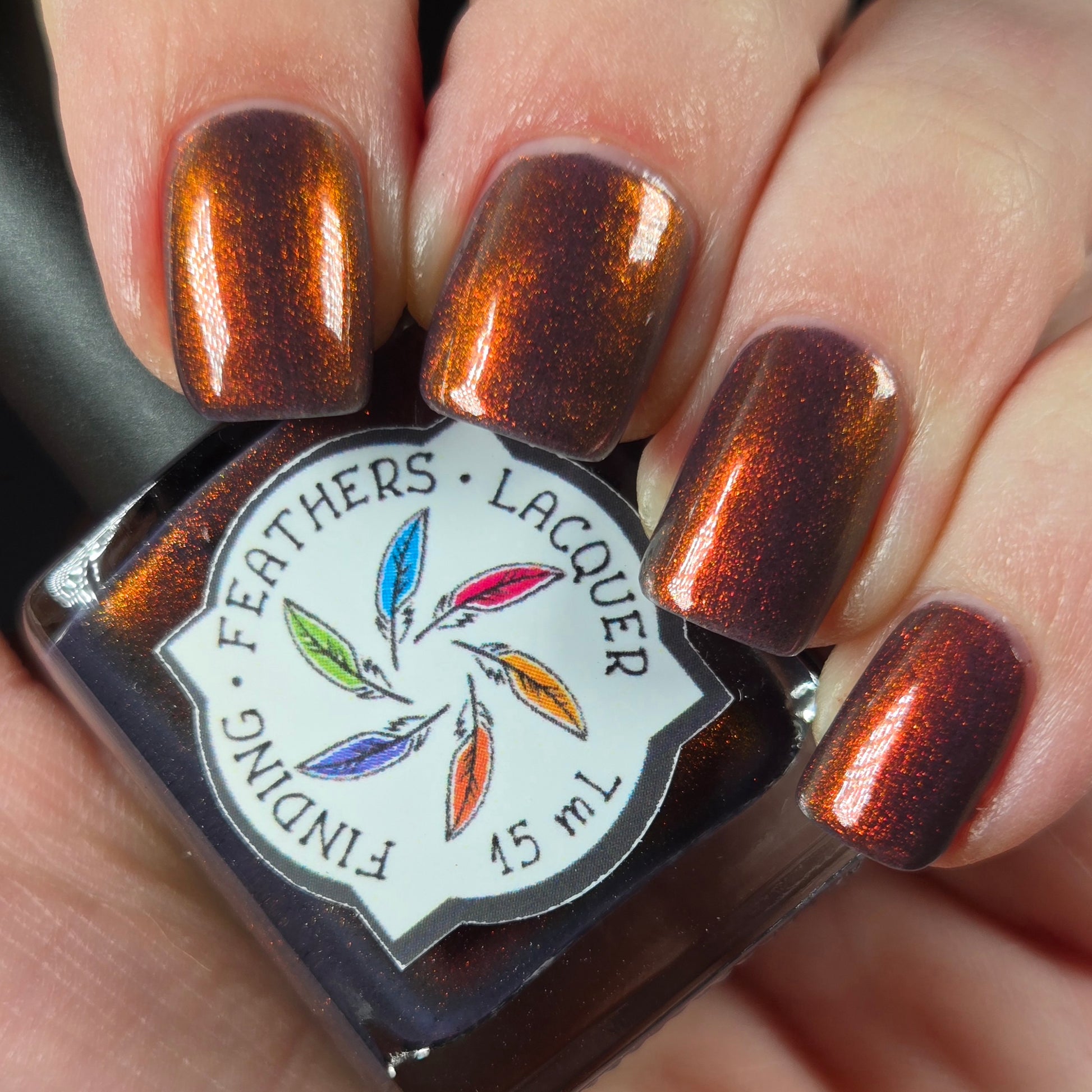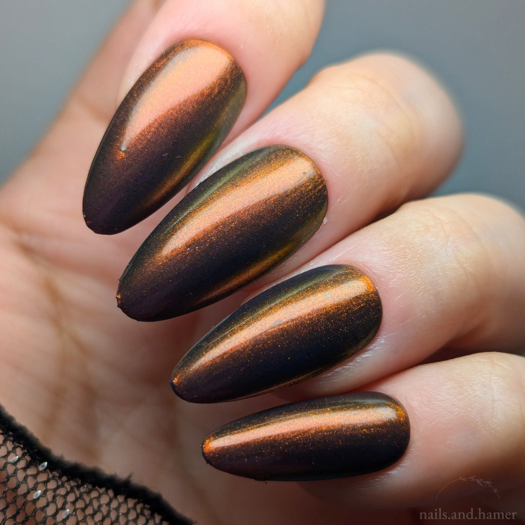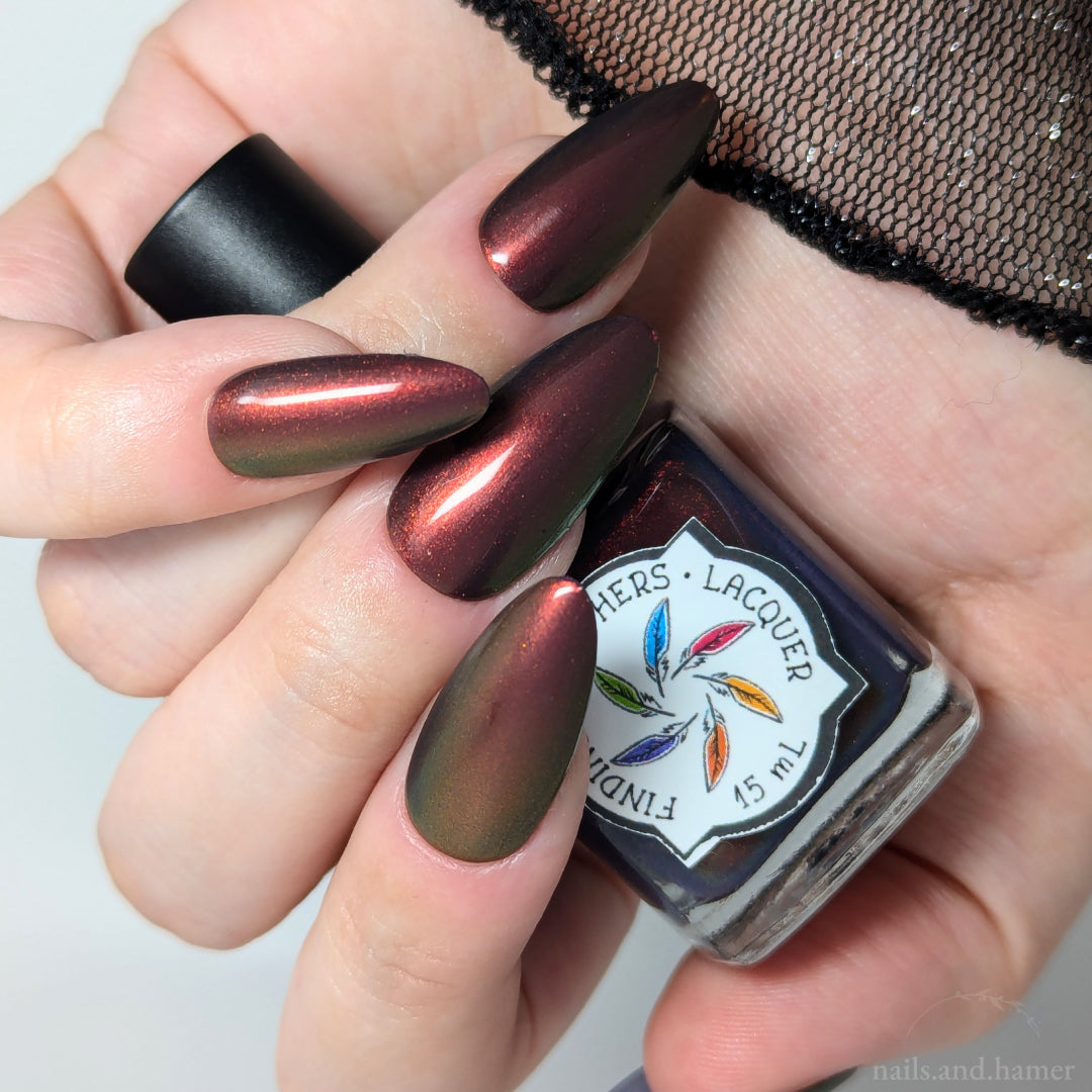 Burnt Out But Optimistic is a deep raisin/plum based polish with strong red/orange/gold/lime green multichrome shimmer.
