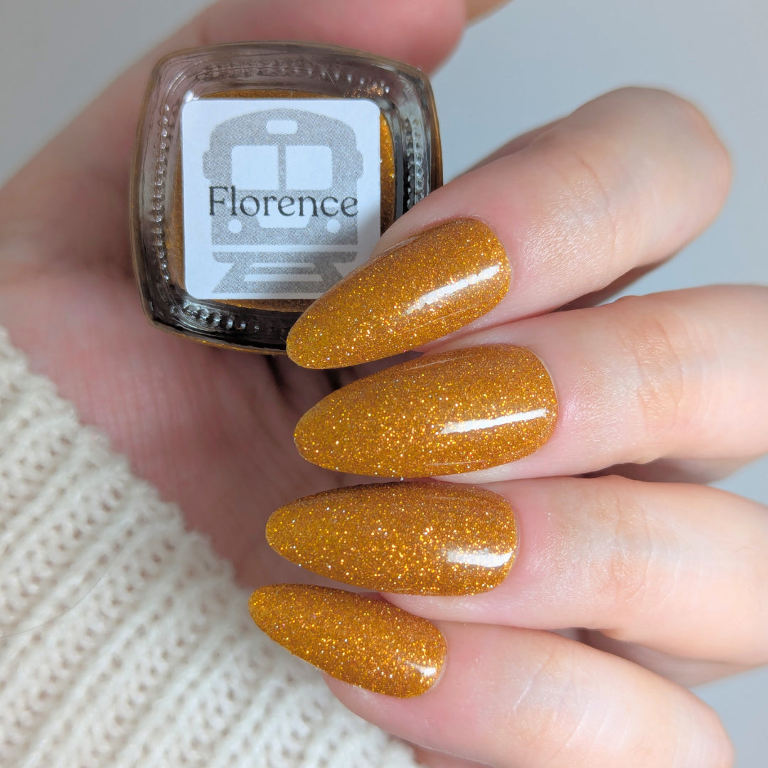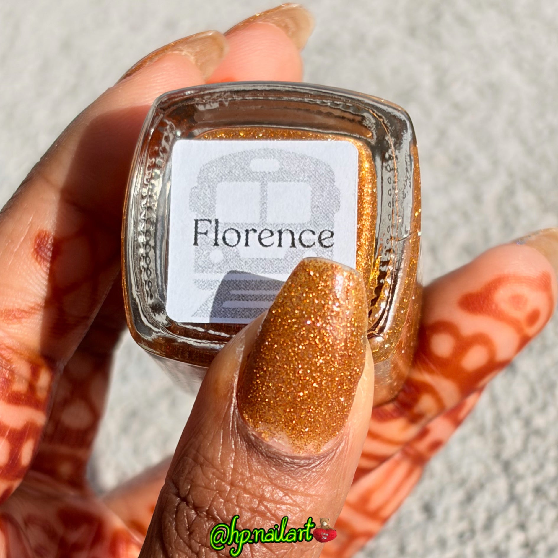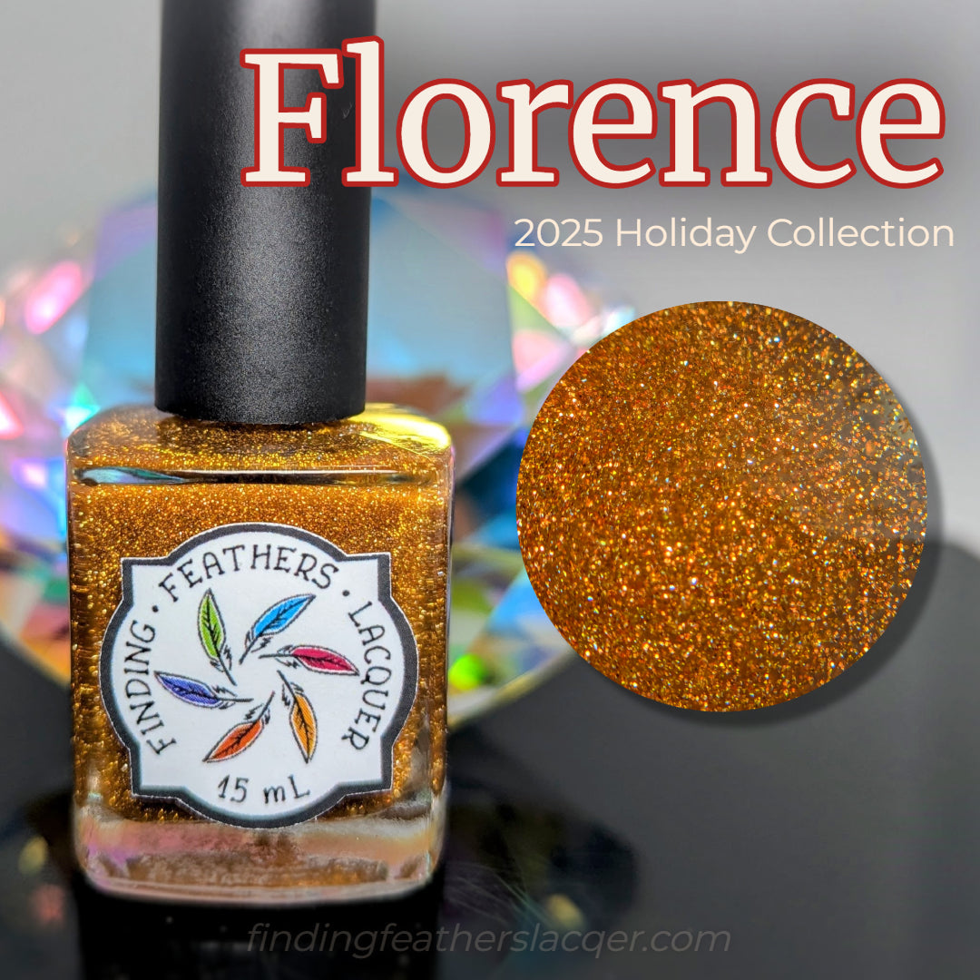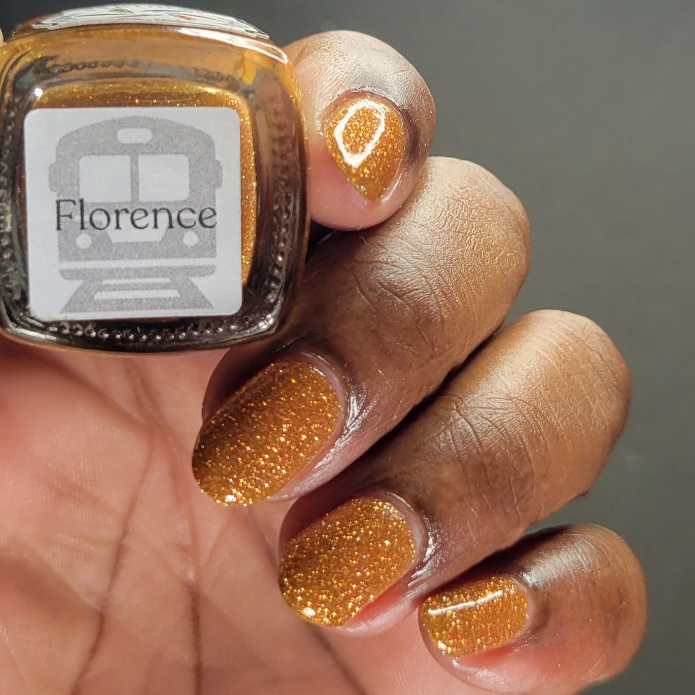Florence is a warm butterscotch gold jelly base alight with dazzling mini coppery golden metallic and reflective glitters. Reflective glitters by nature are extra "thirsty", and we highly recommend FFL's Serenity Smoothing Top Coat BEFORE topping with FFL's True Tranquility QDTC for a smooth finish.