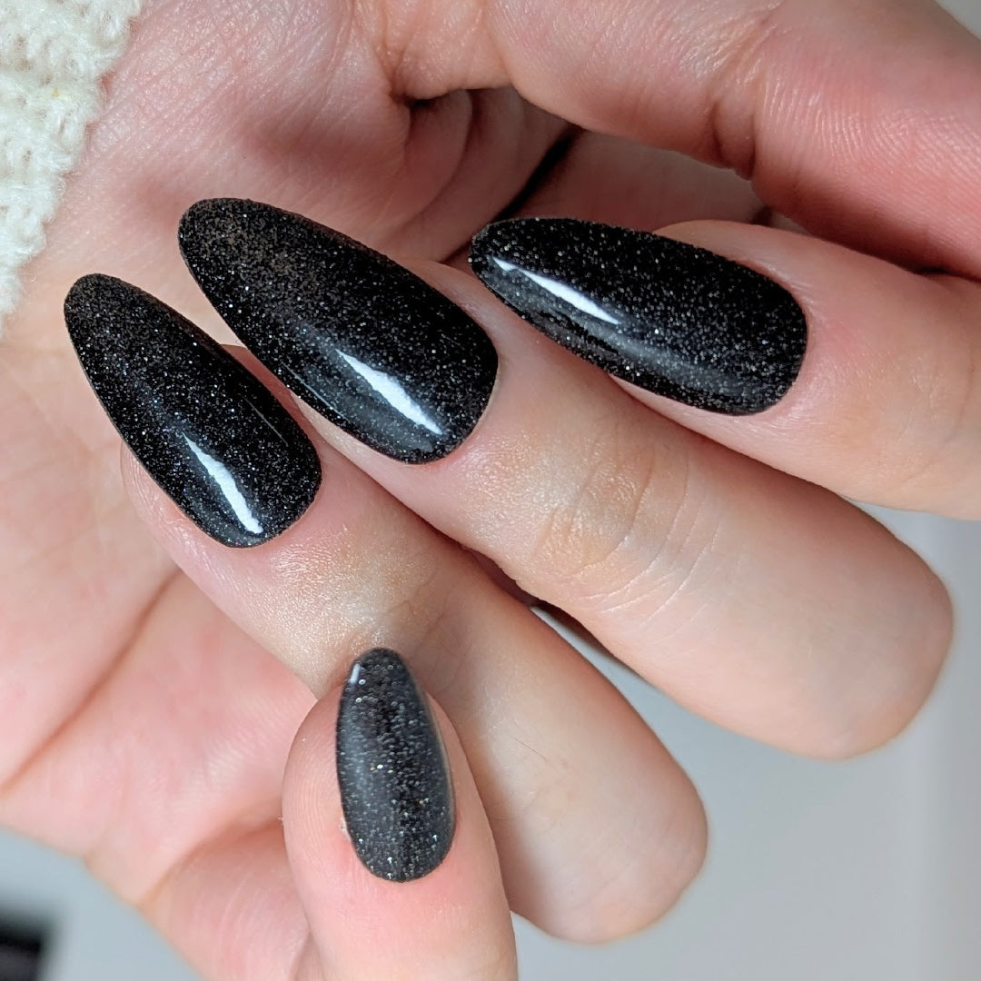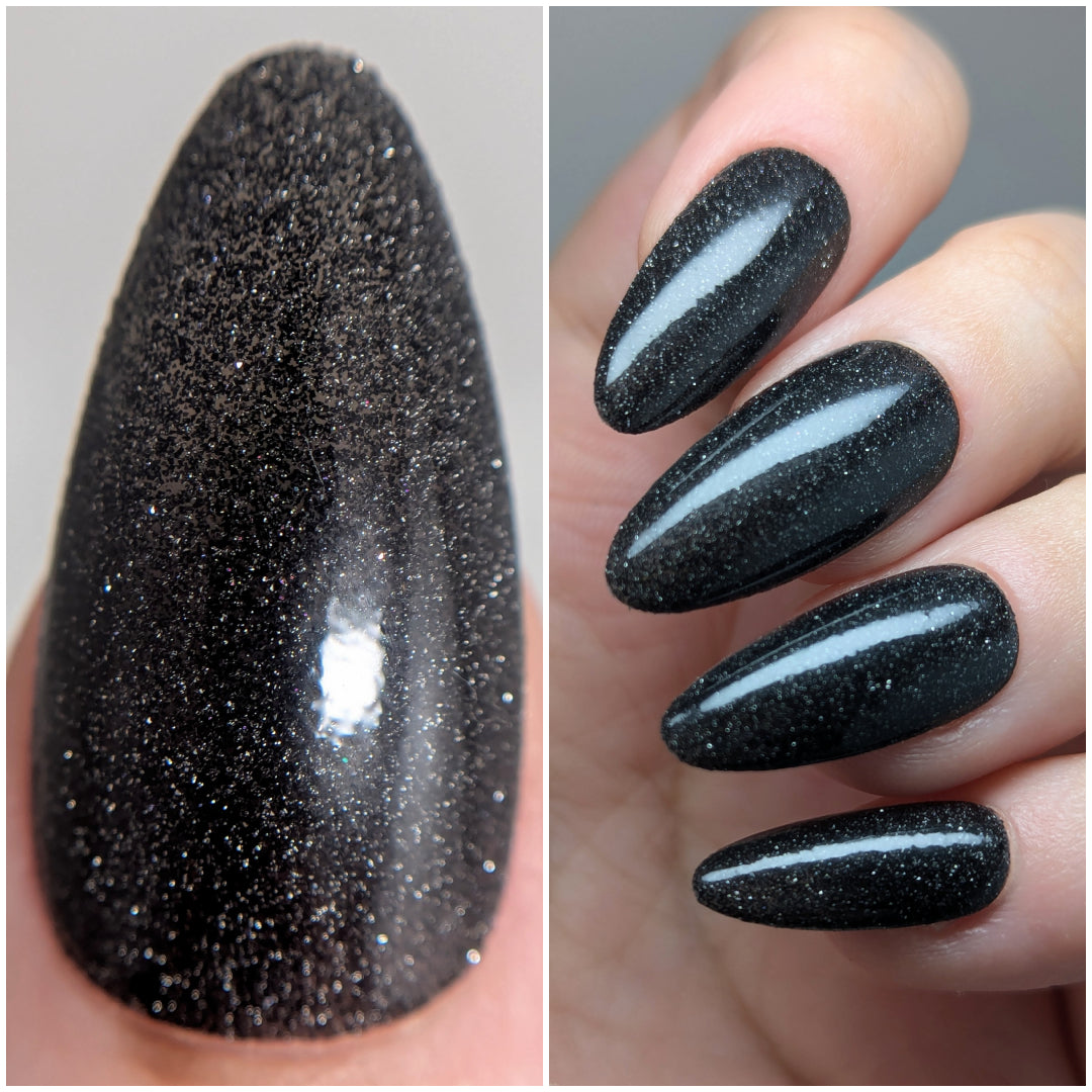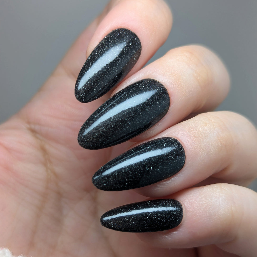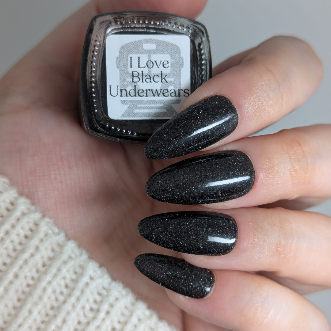 I Love Black Underwears is an onyx jelly base with tantalizing mini black metallic and reflective glitters. Reflective glitters by nature are extra "thirsty", and we highly recommend FFL's Serenity Smoothing Top Coat BEFORE topping with FFL's True Tranquility QDTC for a smooth finish.