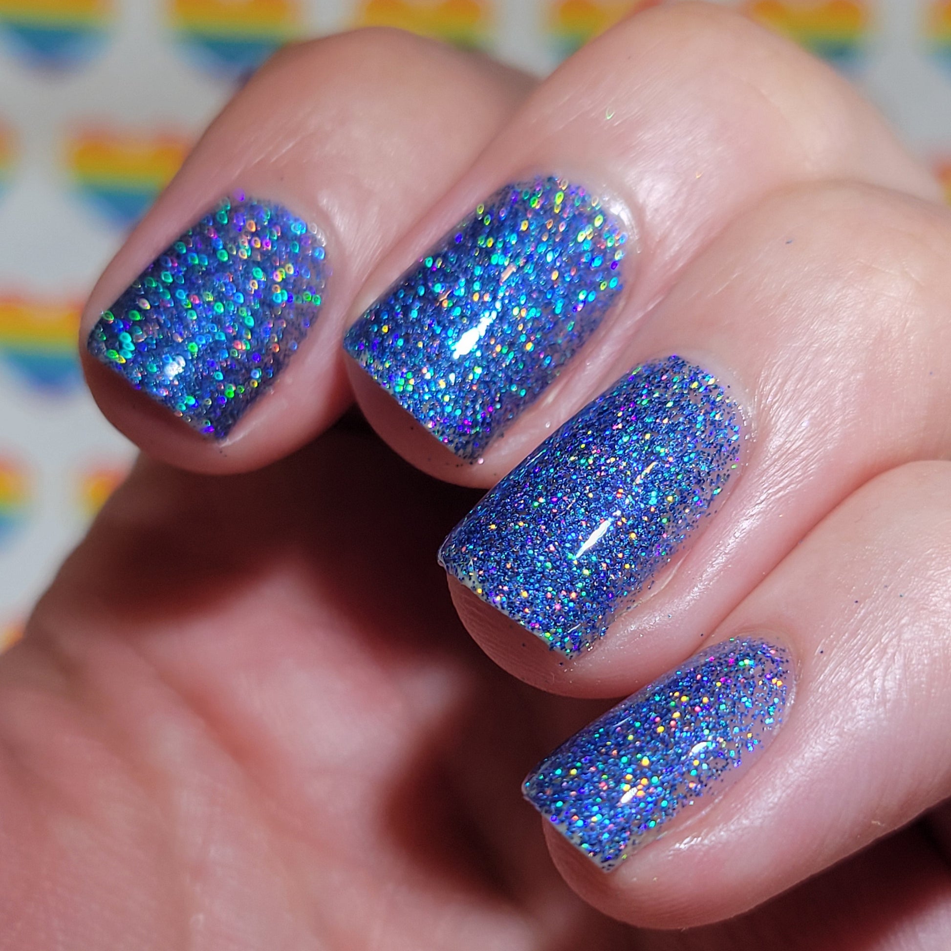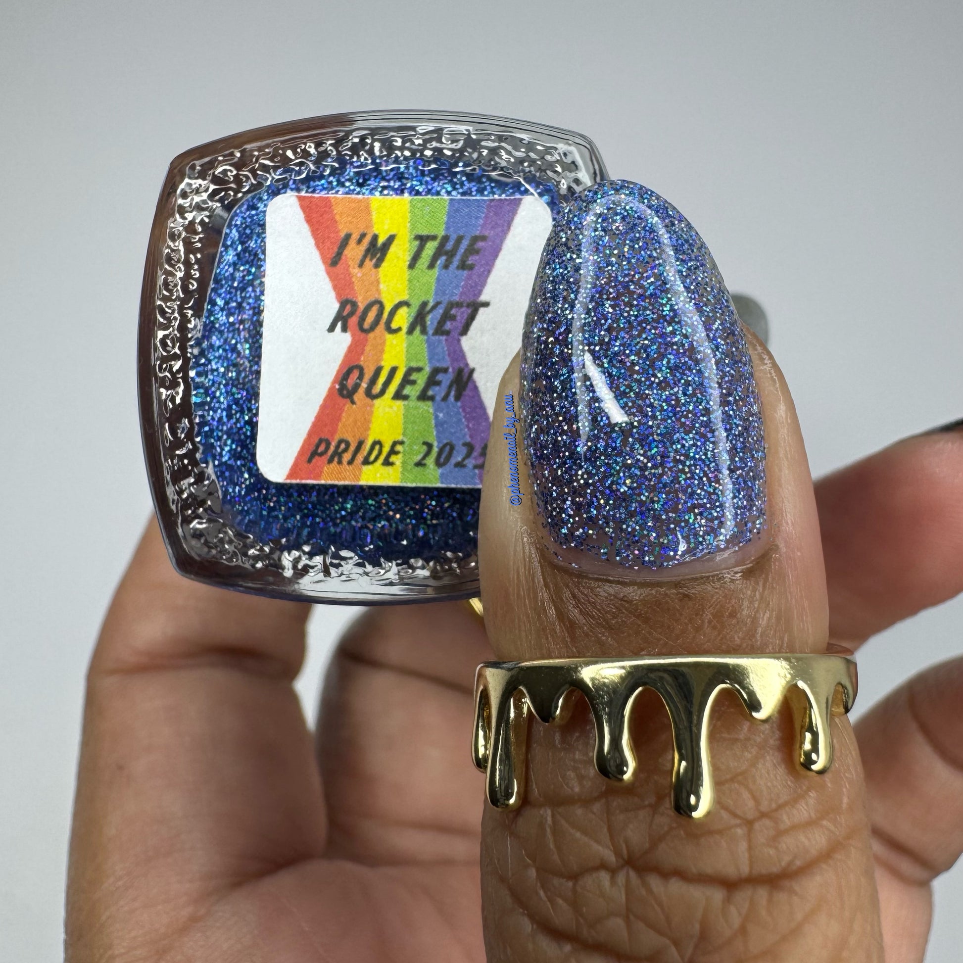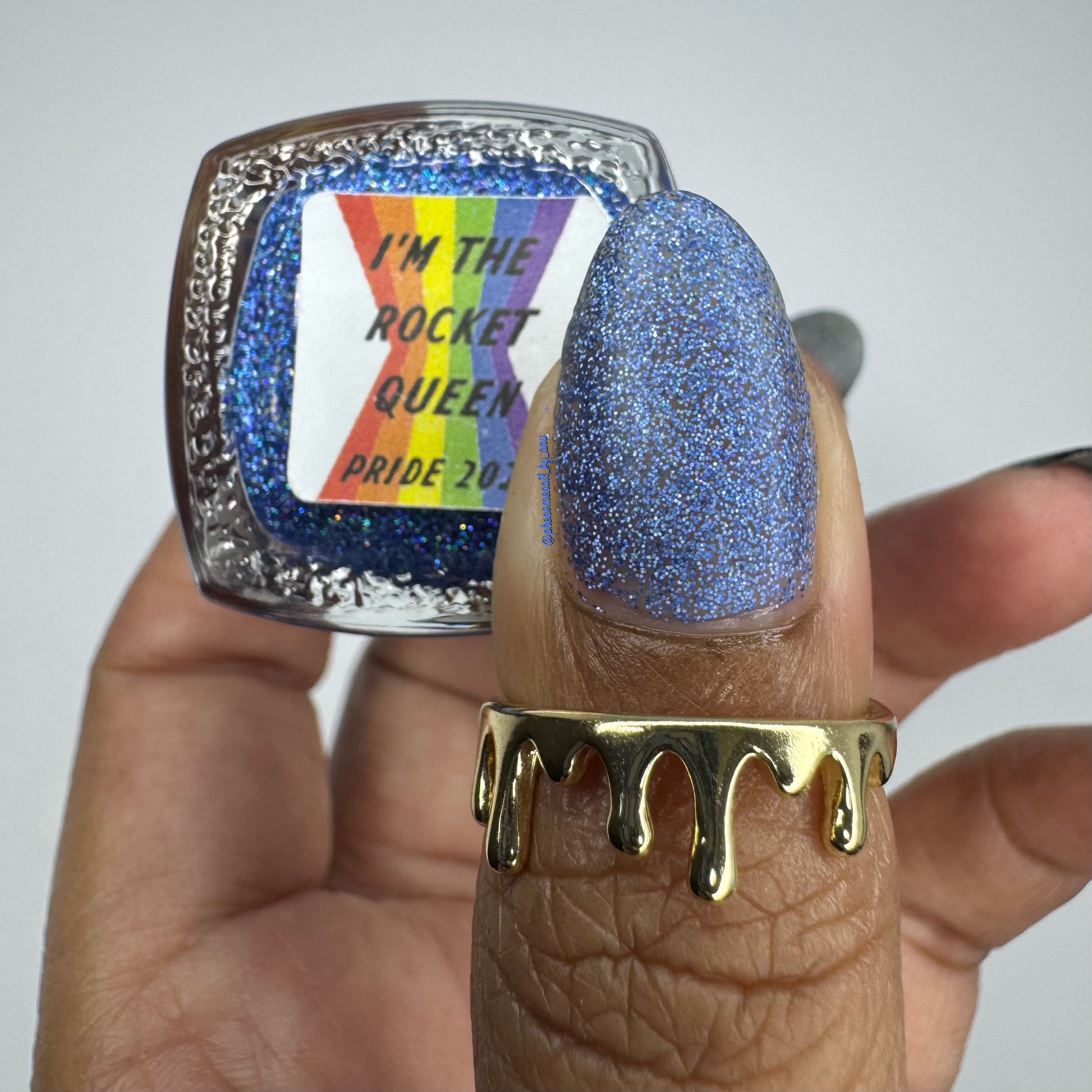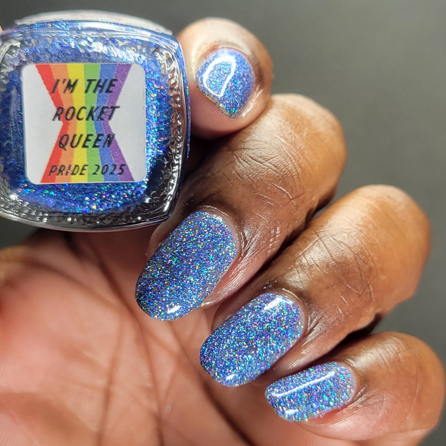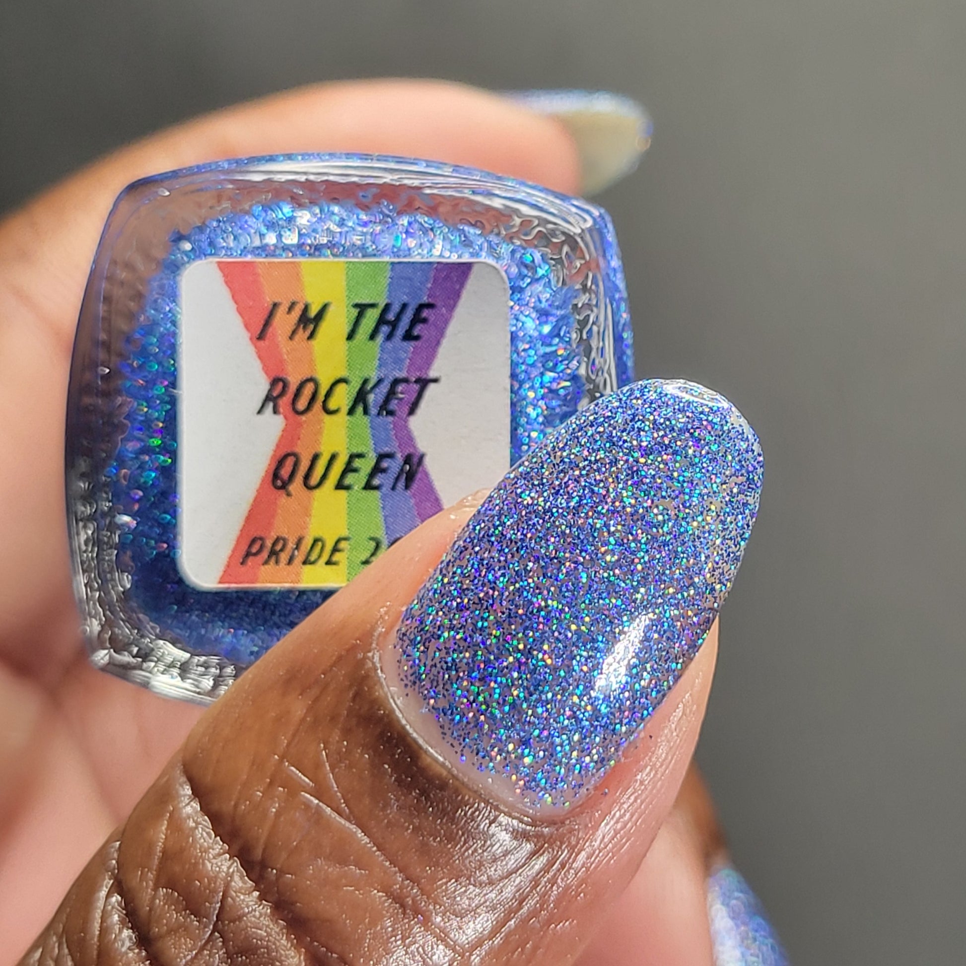 I'm the Rocket Queen is an Egyptian blue mini holo glitter polish, inspired by Pharah, a lesbian Egyptian/Canadian security chief from the video game, Overwatch.