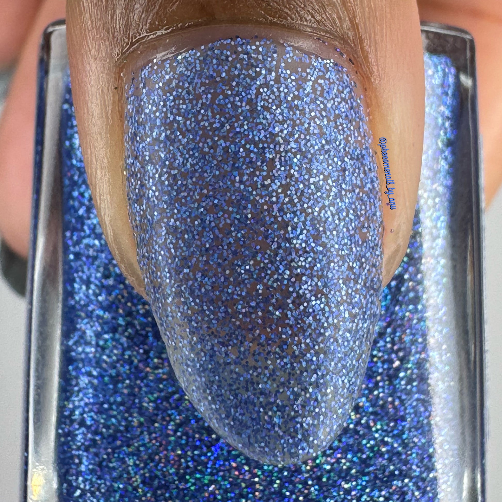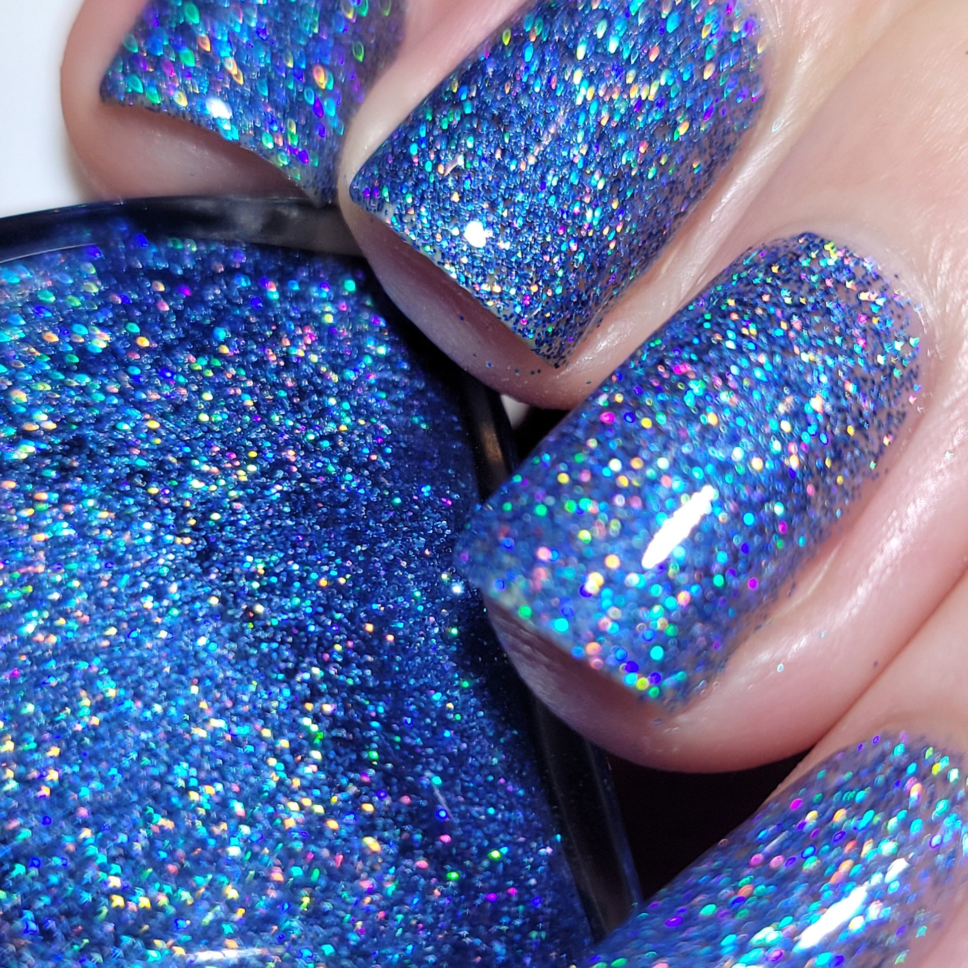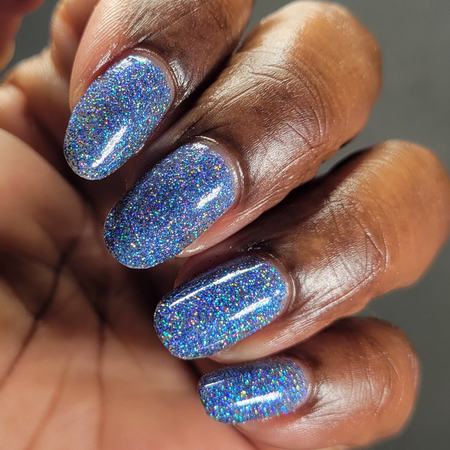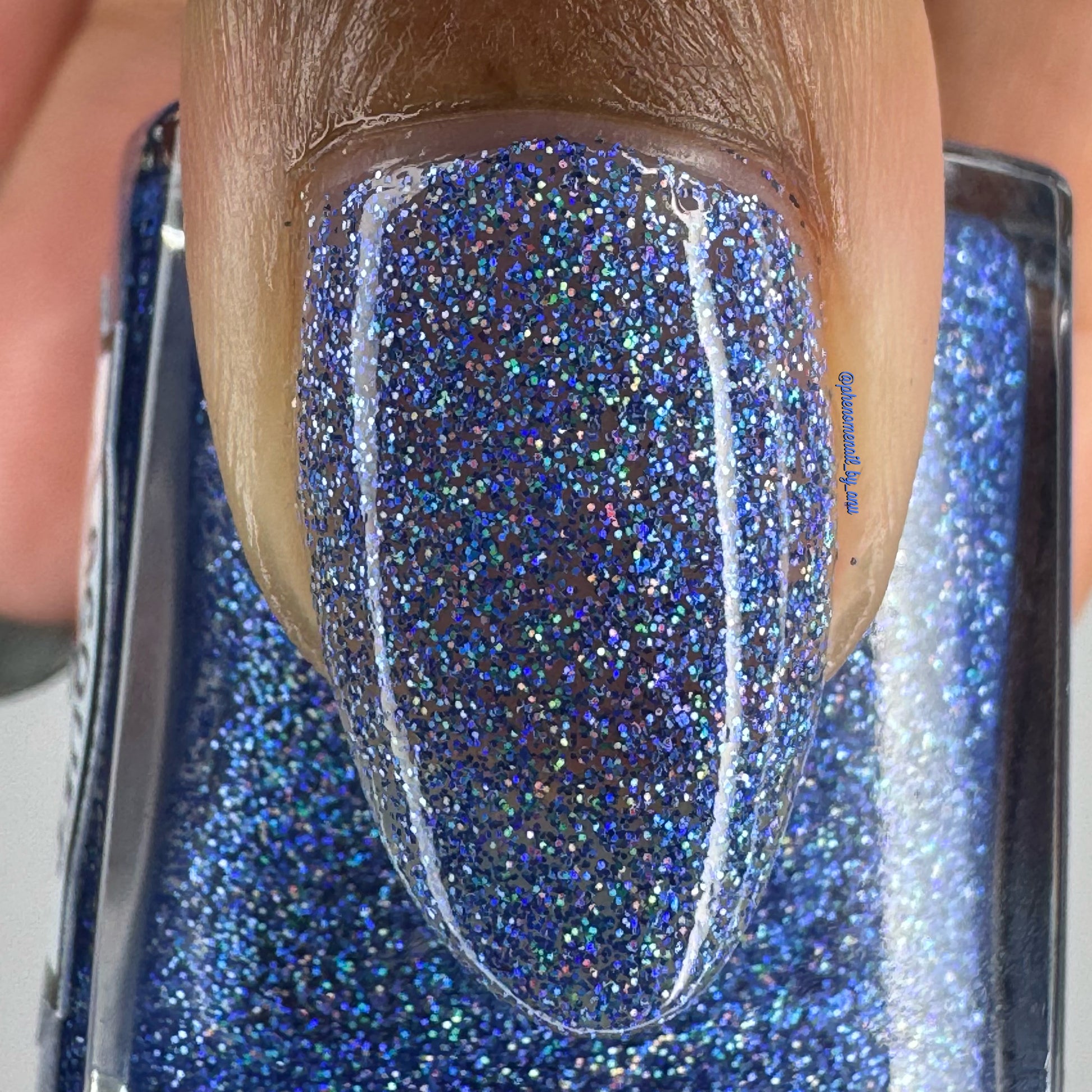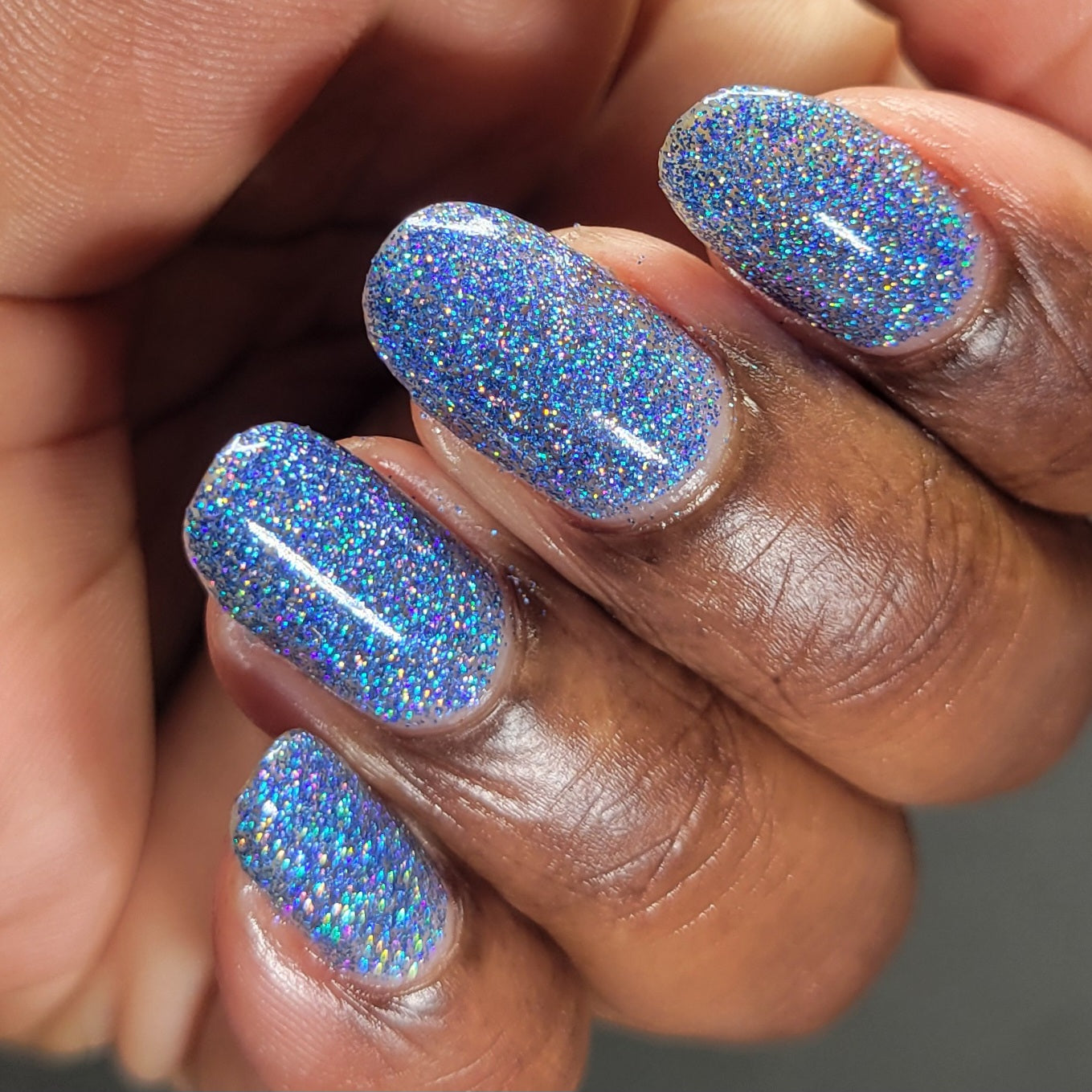I'm the Rocket Queen is an Egyptian blue mini holo glitter polish, inspired by Pharah, a lesbian Egyptian/Canadian security chief from the video game, Overwatch.