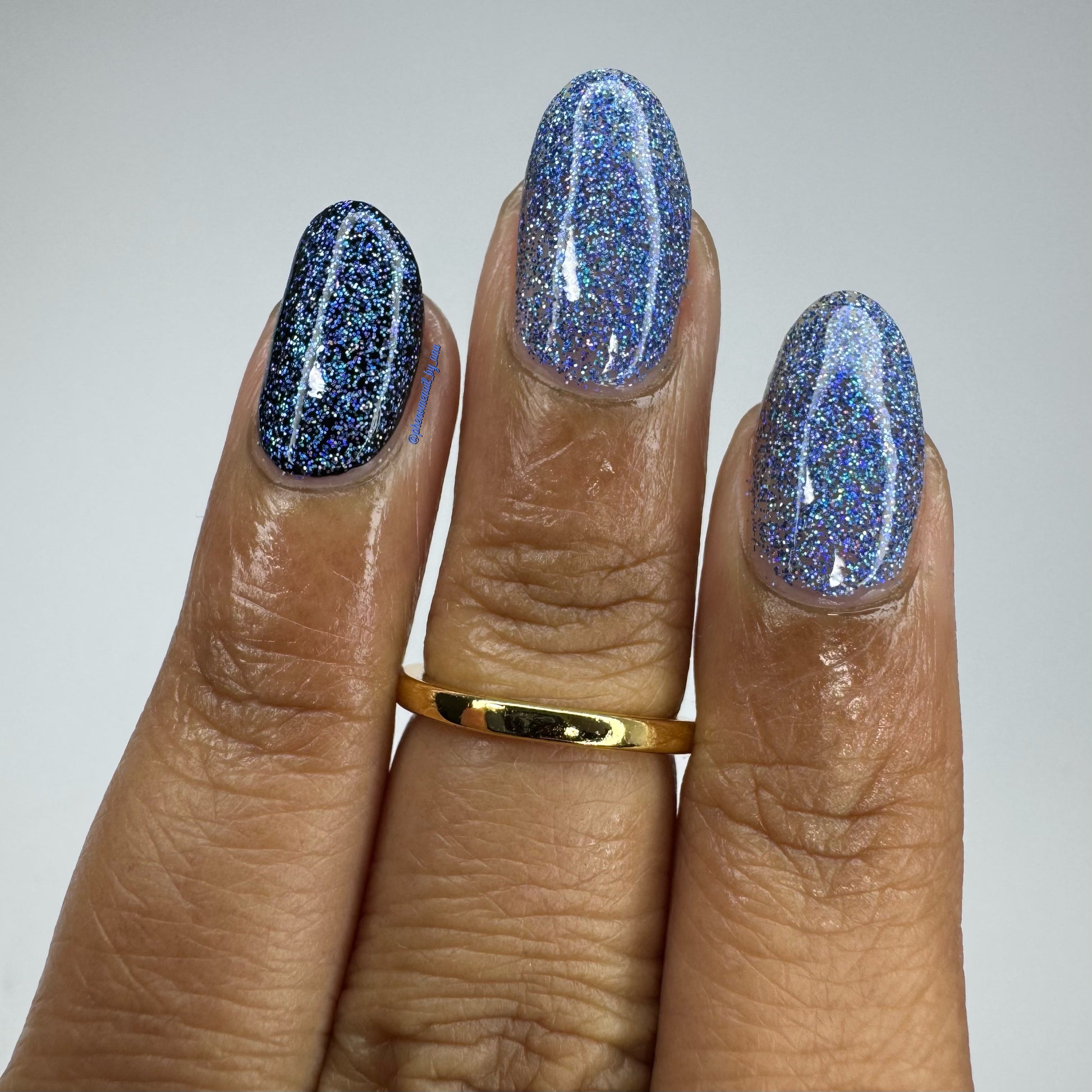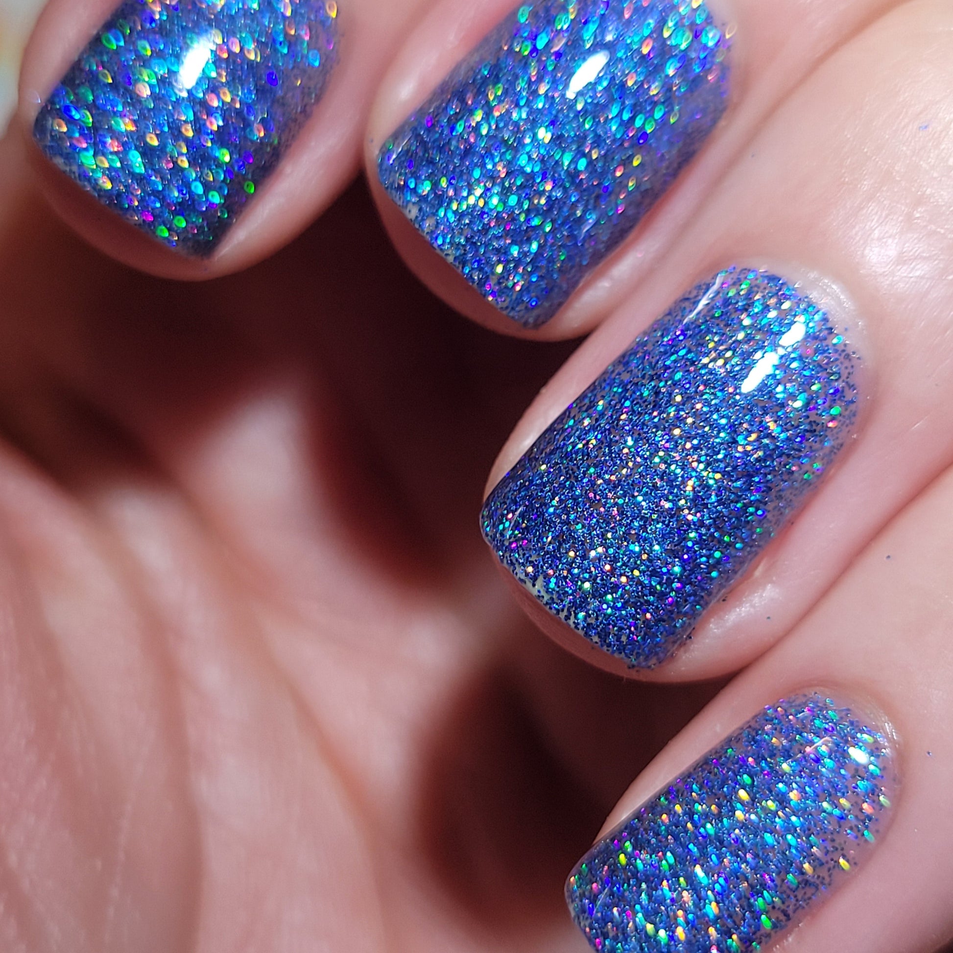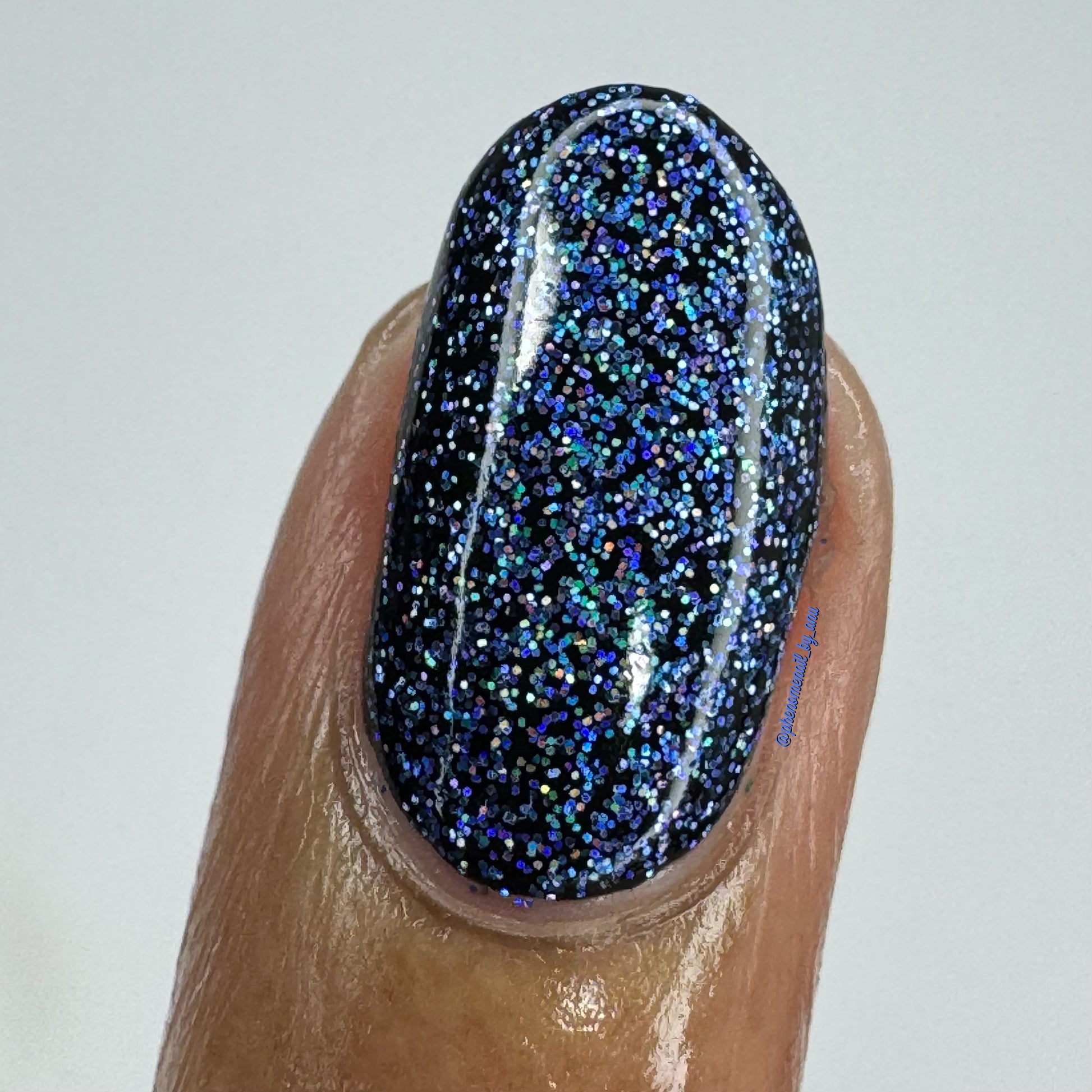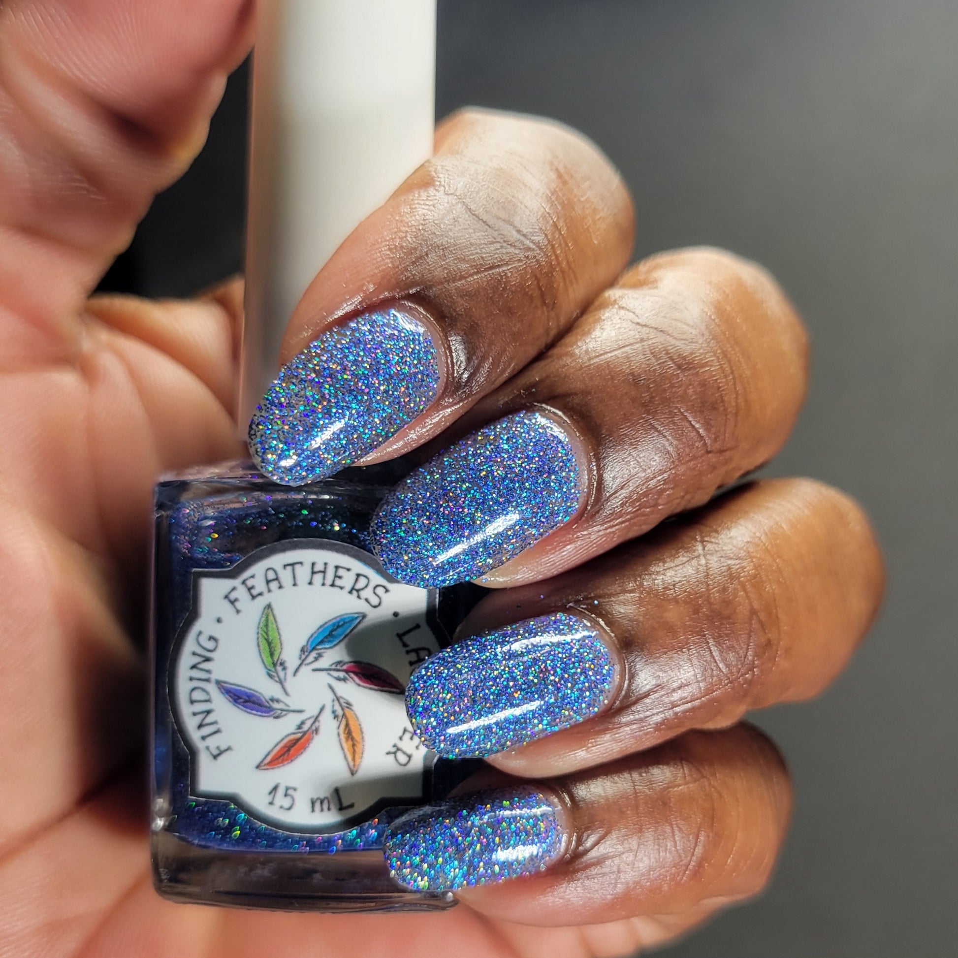 I'm the Rocket Queen is an Egyptian blue mini holo glitter polish, inspired by Pharah, a lesbian Egyptian/Canadian security chief from the video game, Overwatch.