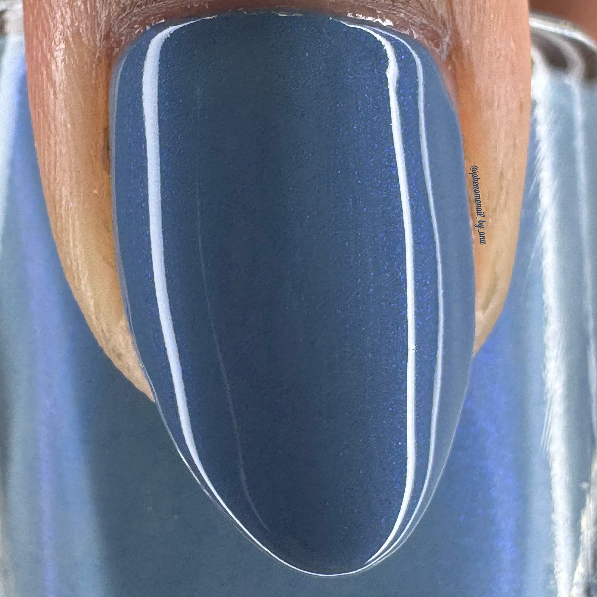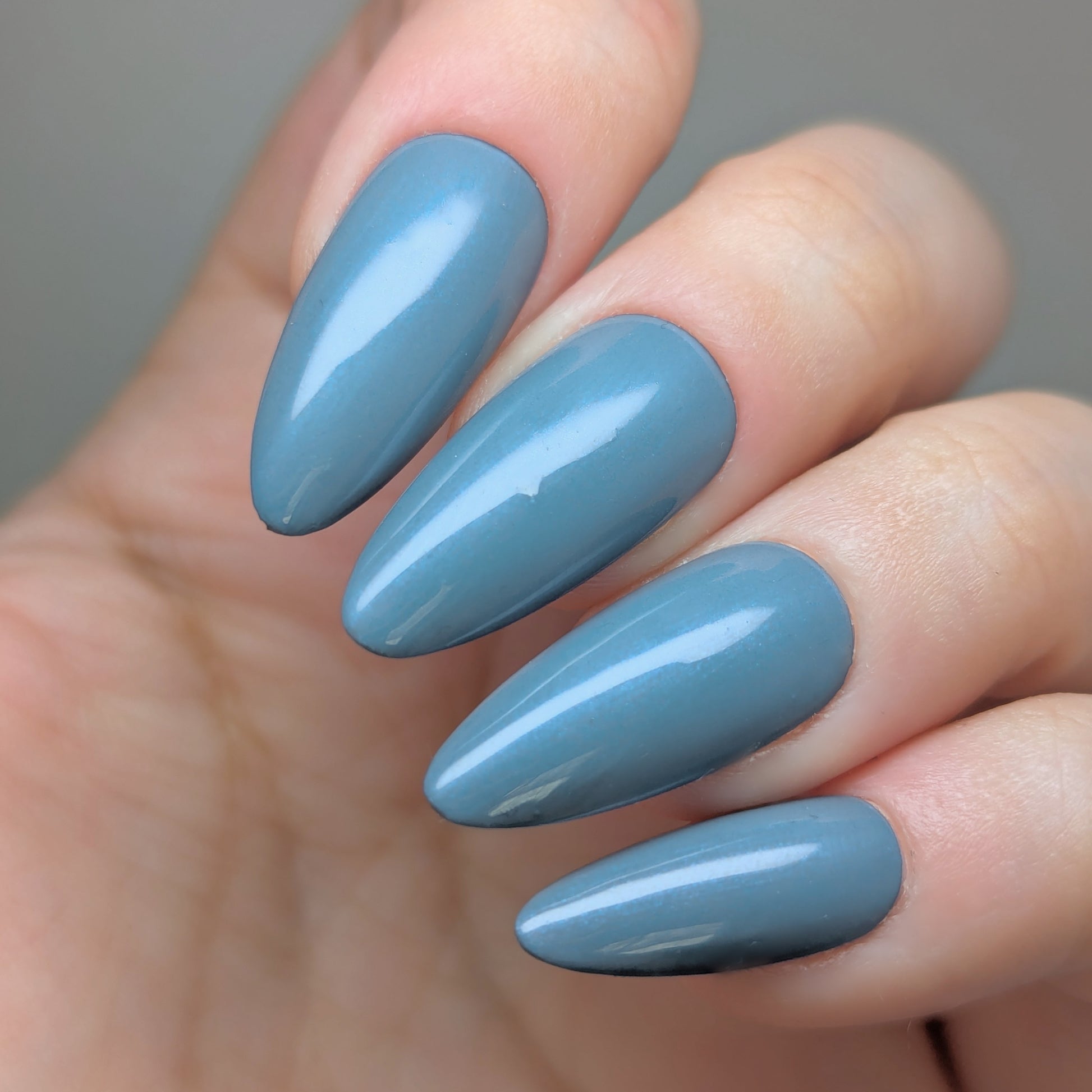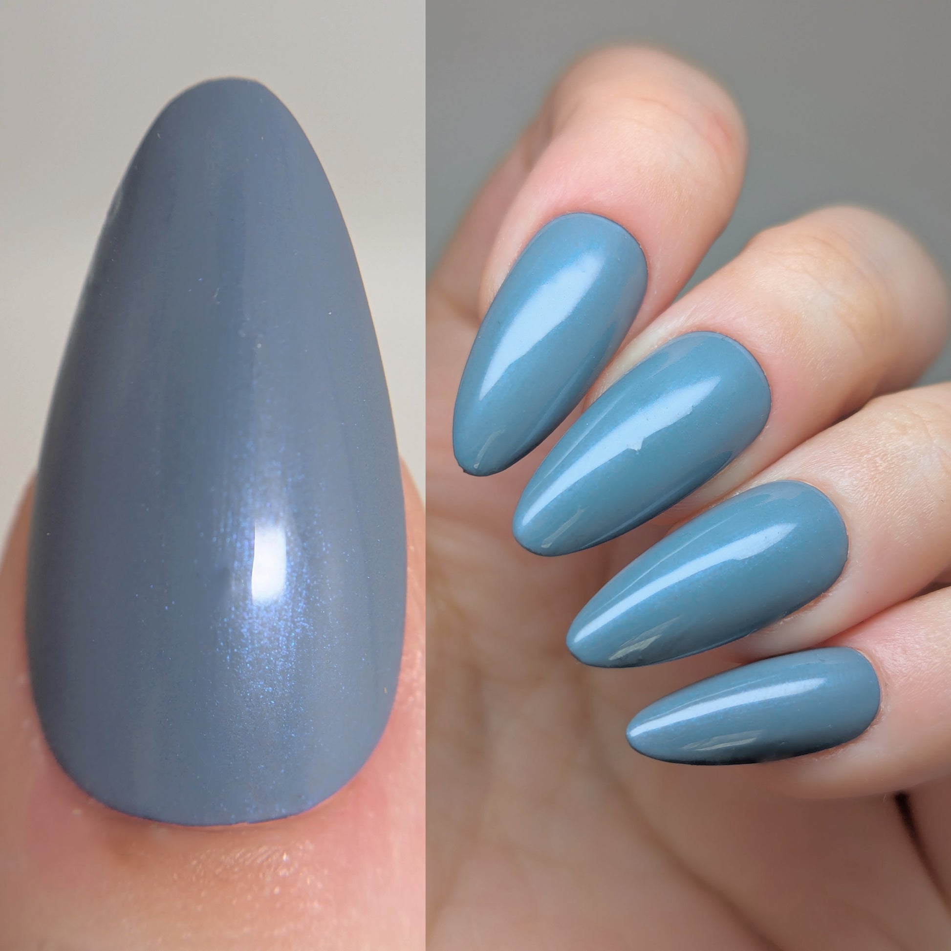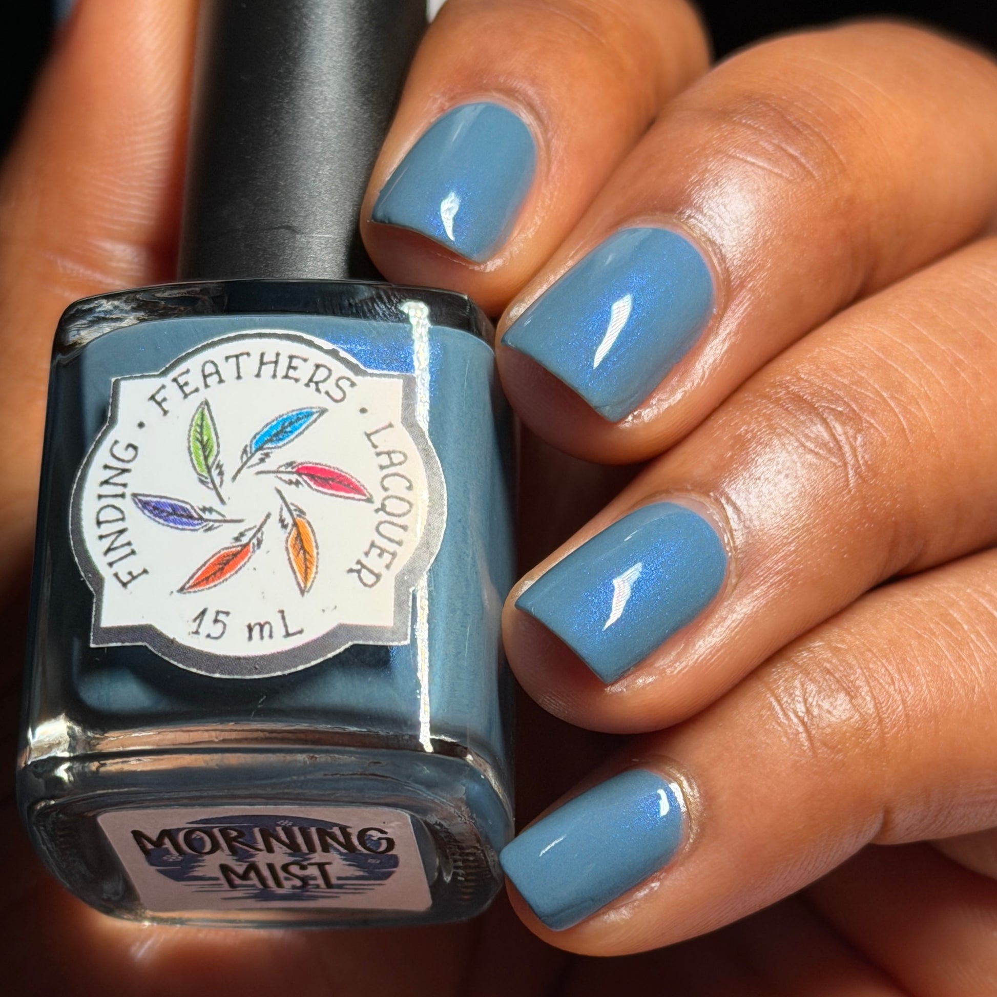 Morning Mist's neutral cozy gray base is mingled with a rich royal blue shimmer, creating a brisk steel blue shimmer creme polish.