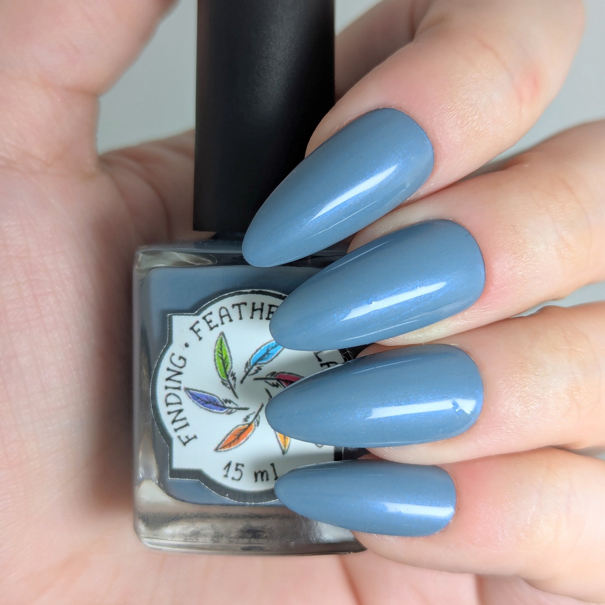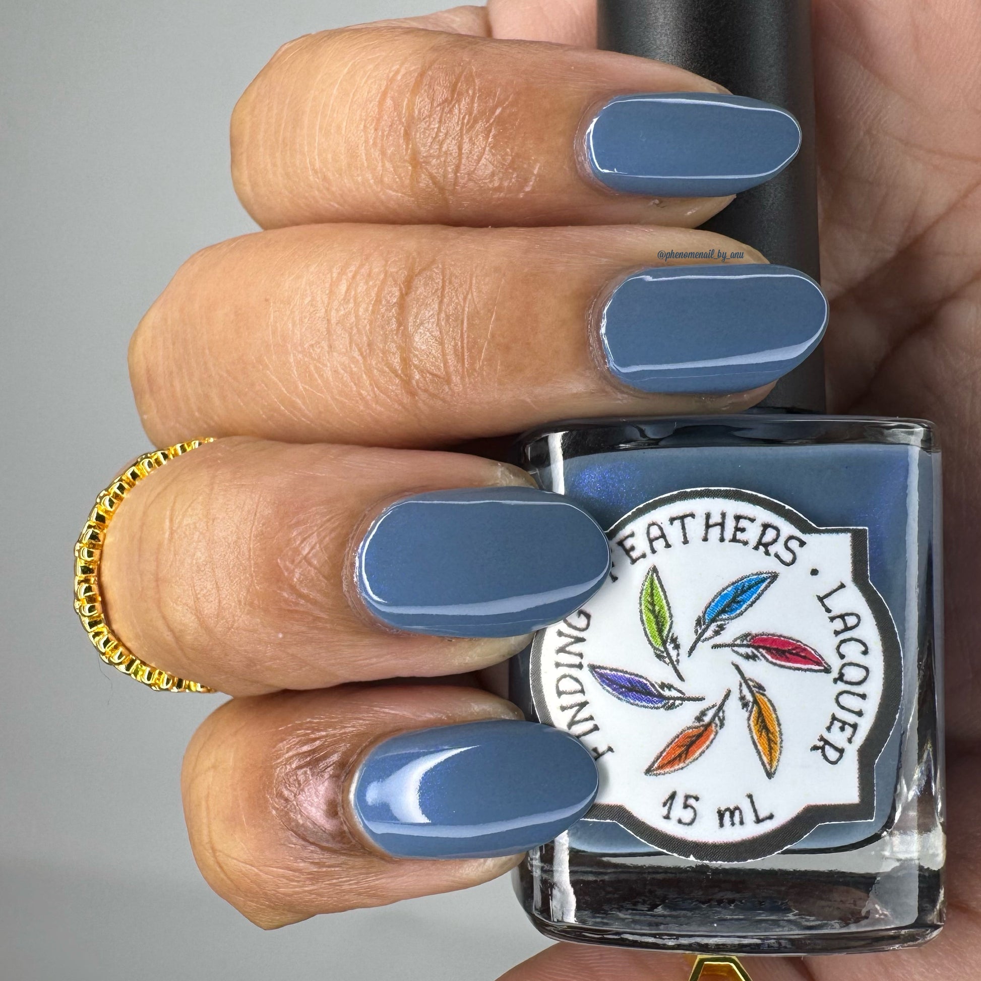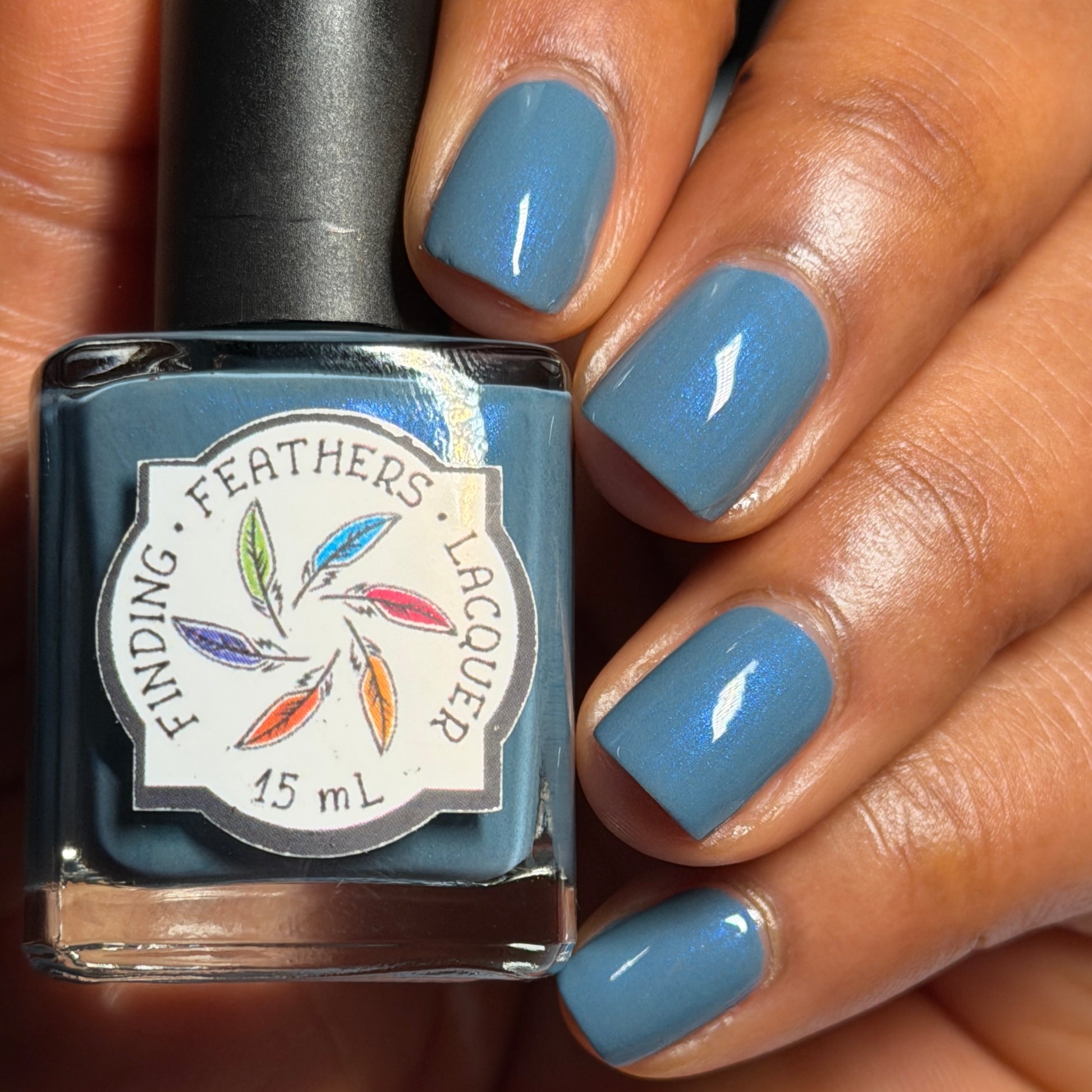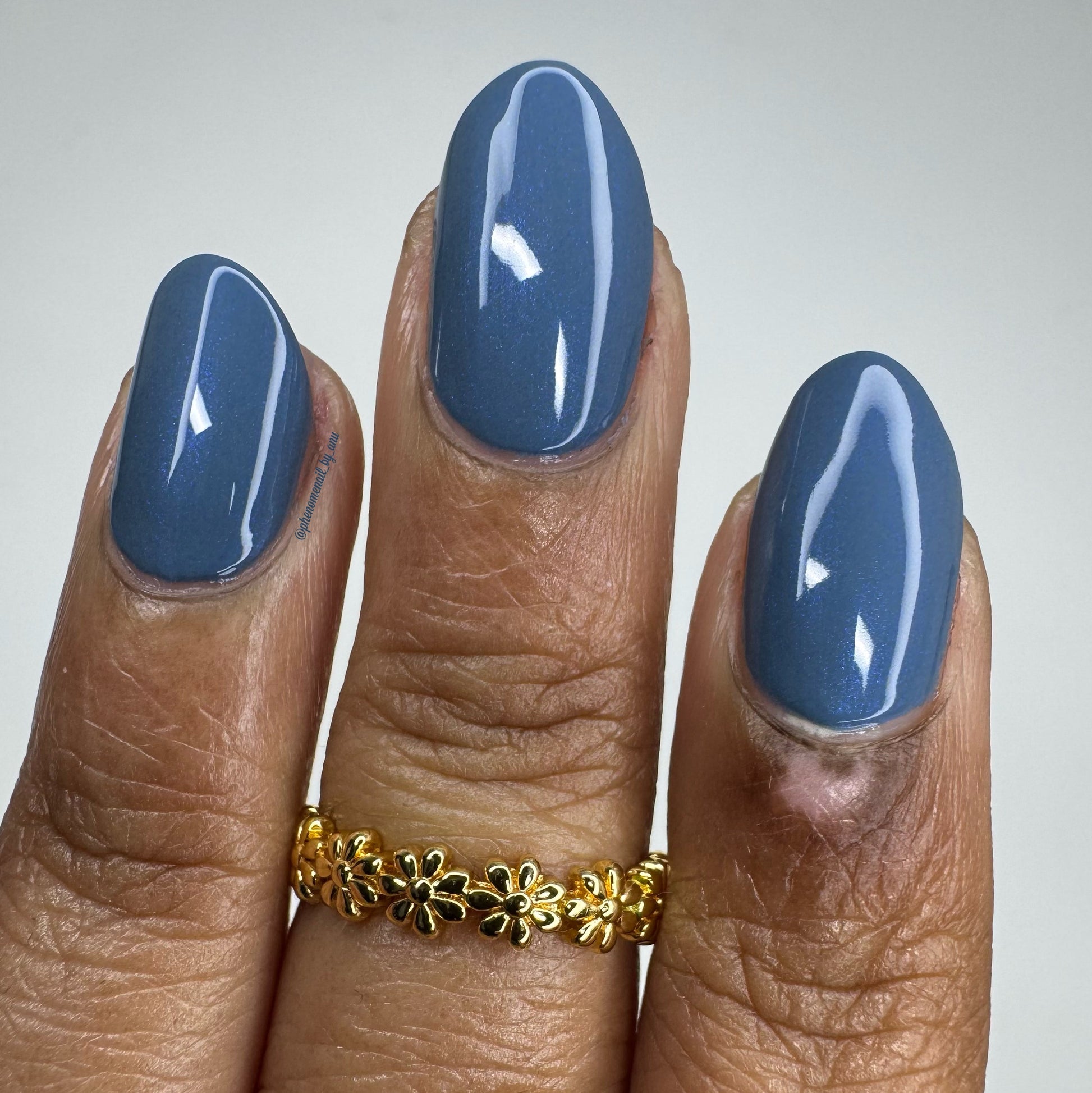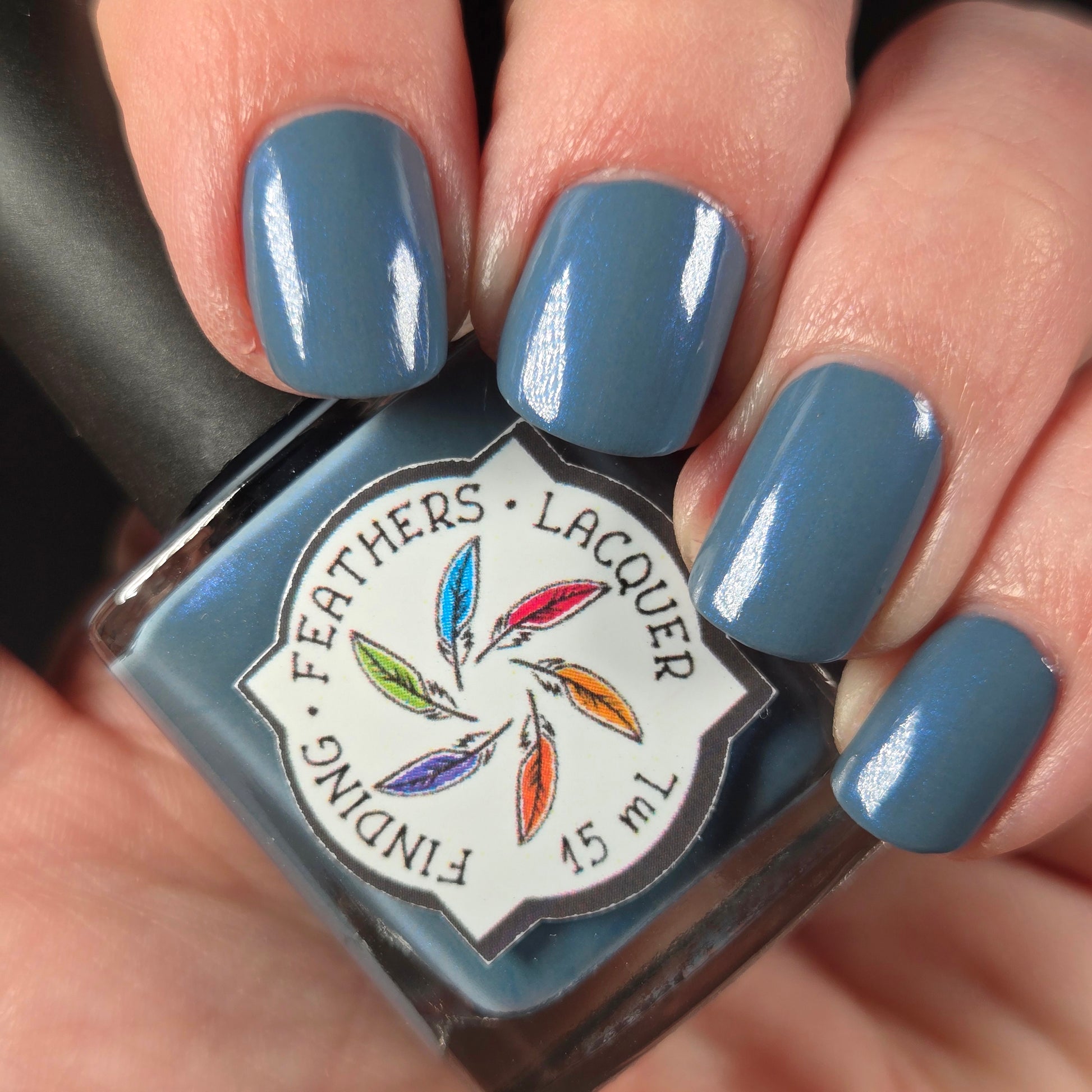 Morning Mist's neutral cozy gray base is mingled with a rich royal blue shimmer, creating a brisk steel blue shimmer creme polish.