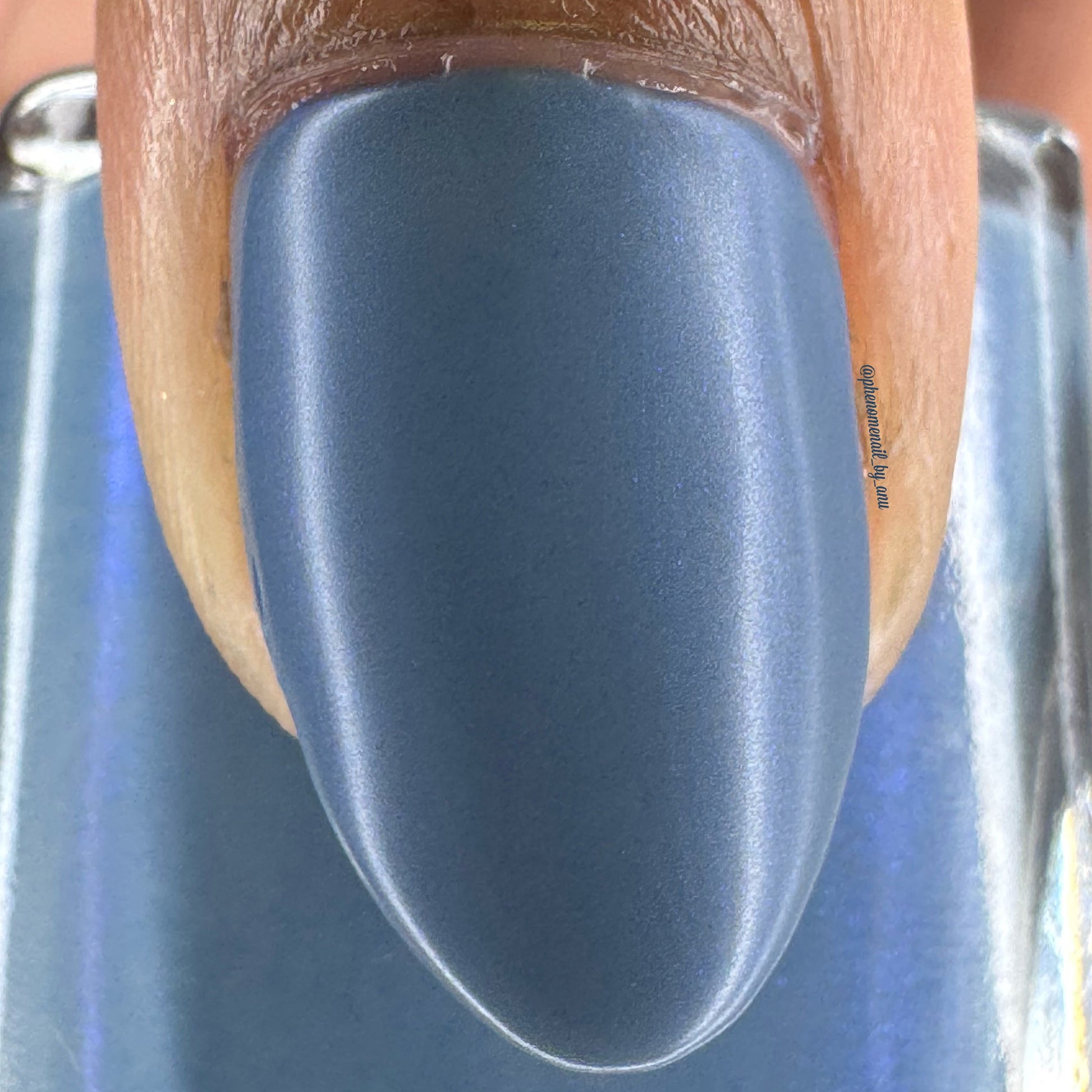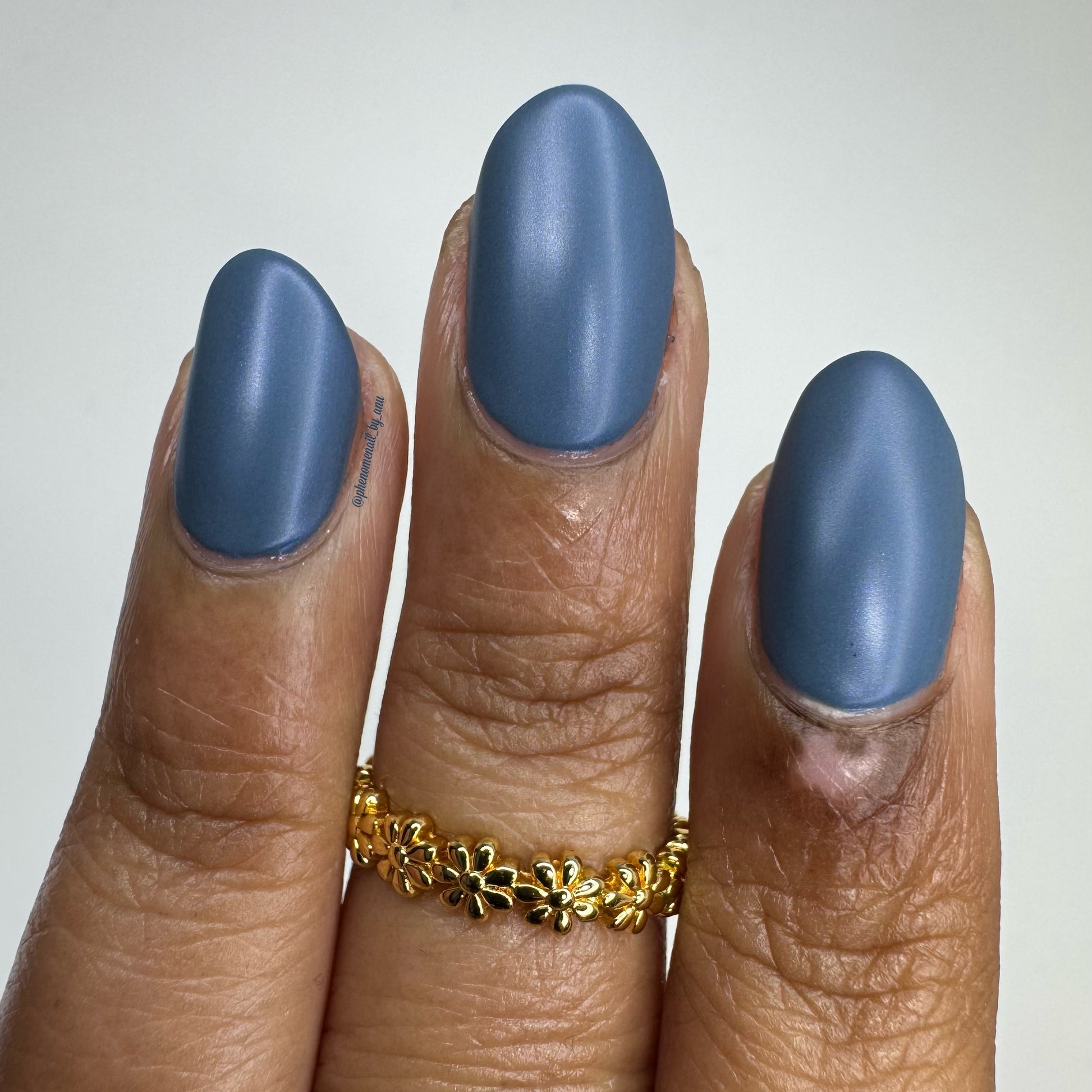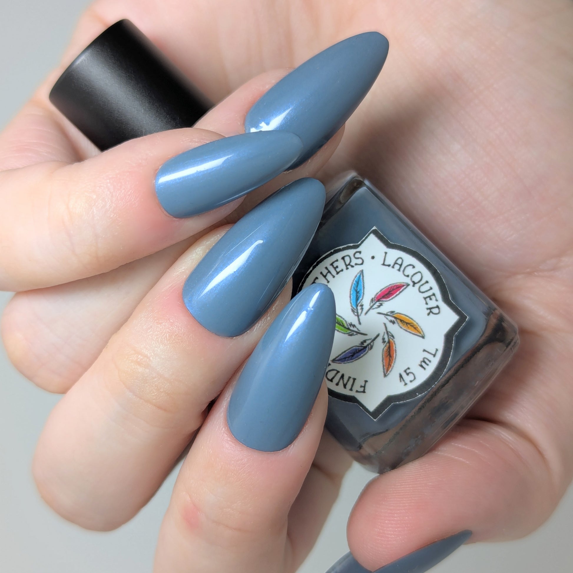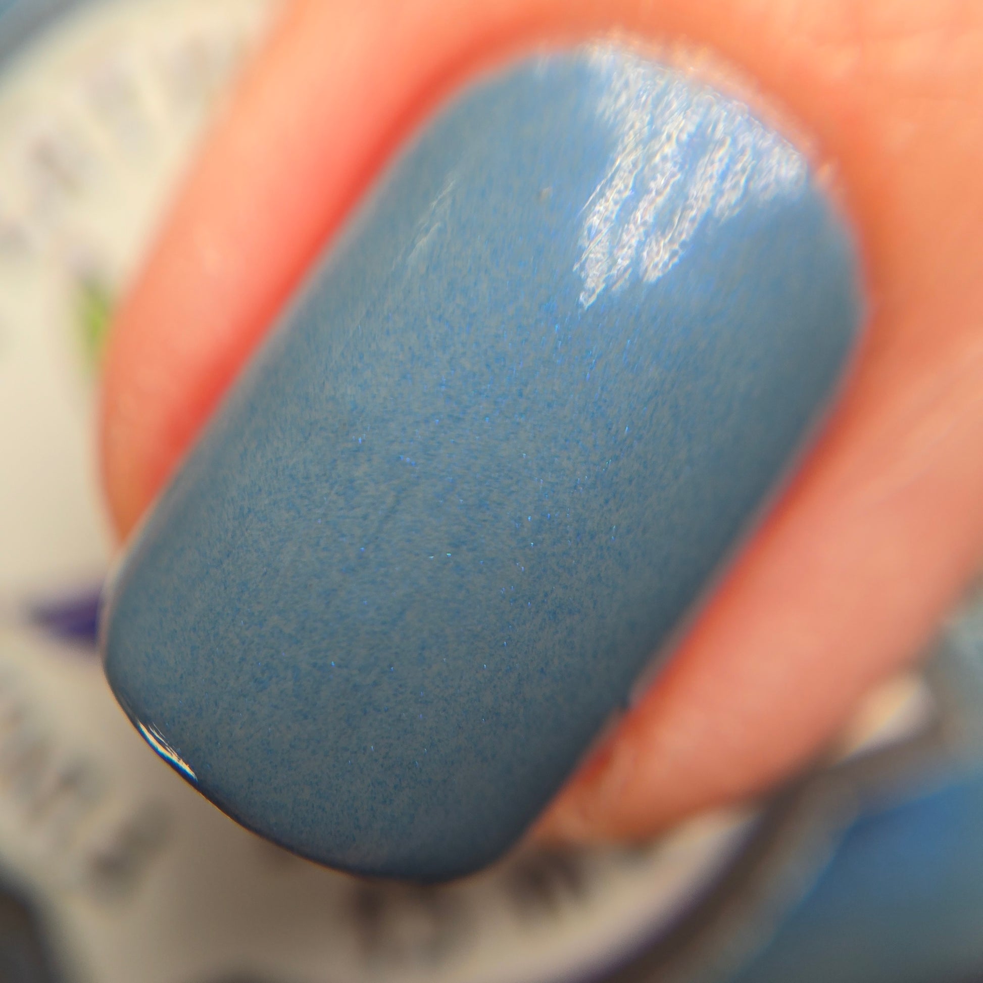 Morning Mist's neutral cozy gray base is mingled with a rich royal blue shimmer, creating a brisk steel blue shimmer creme polish.