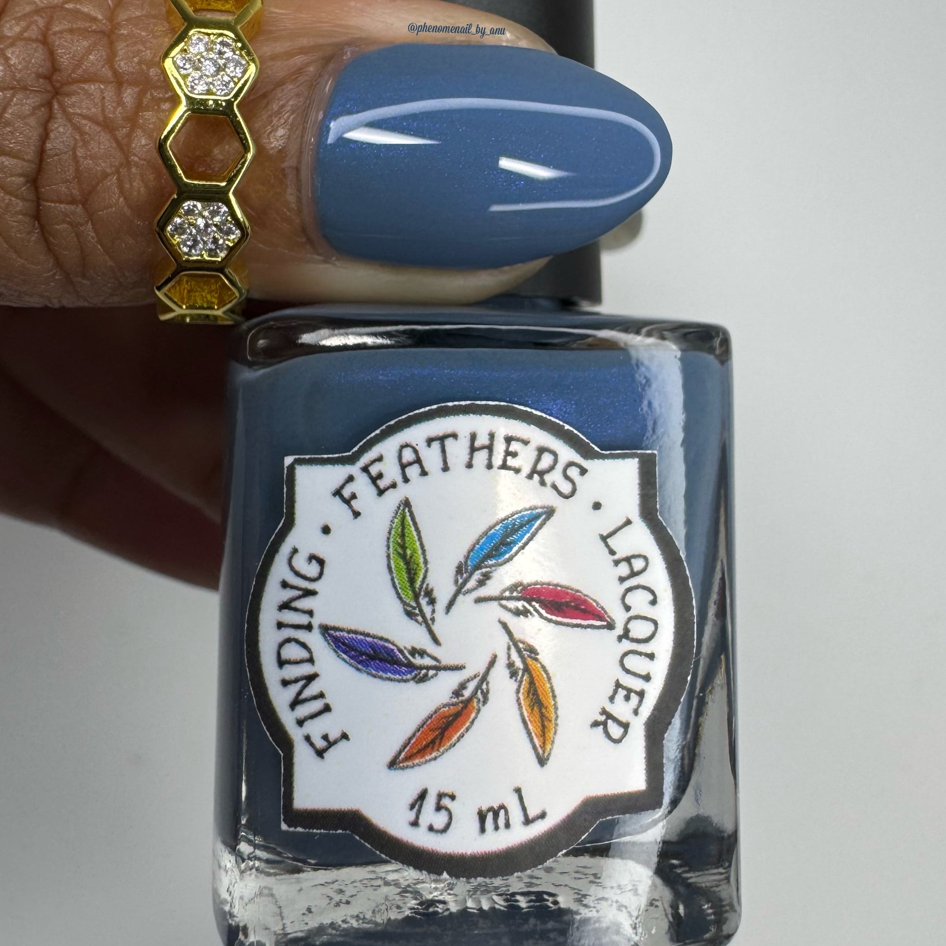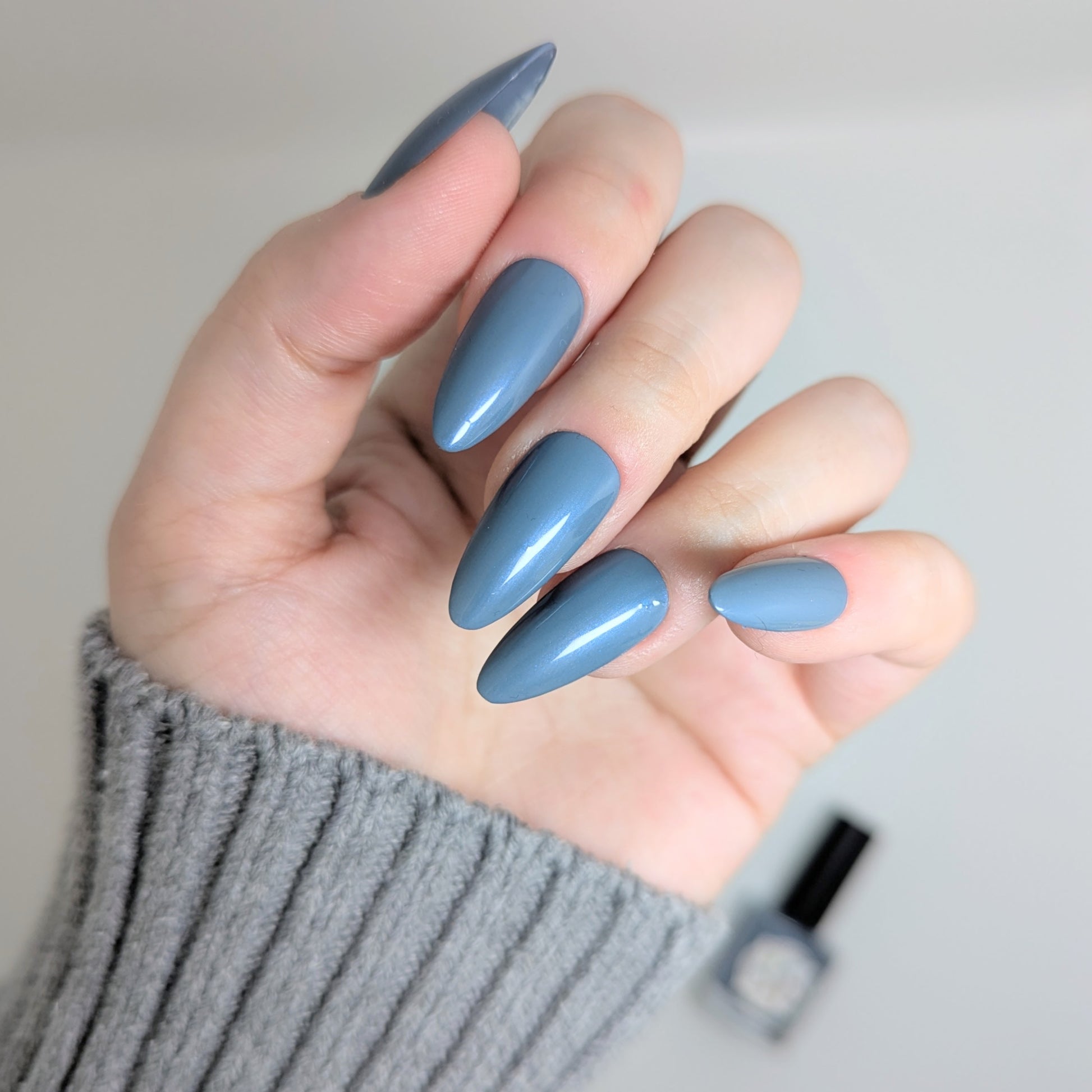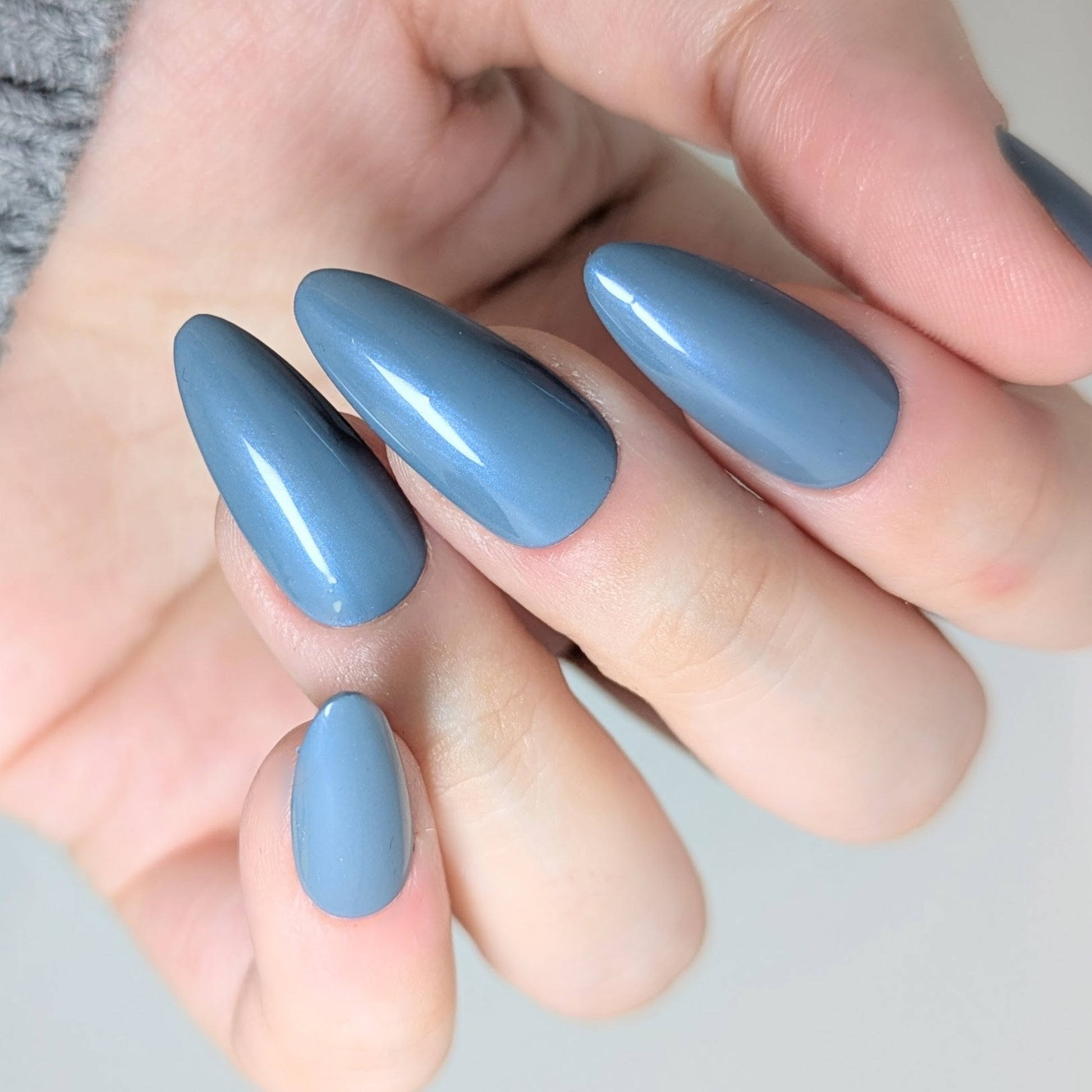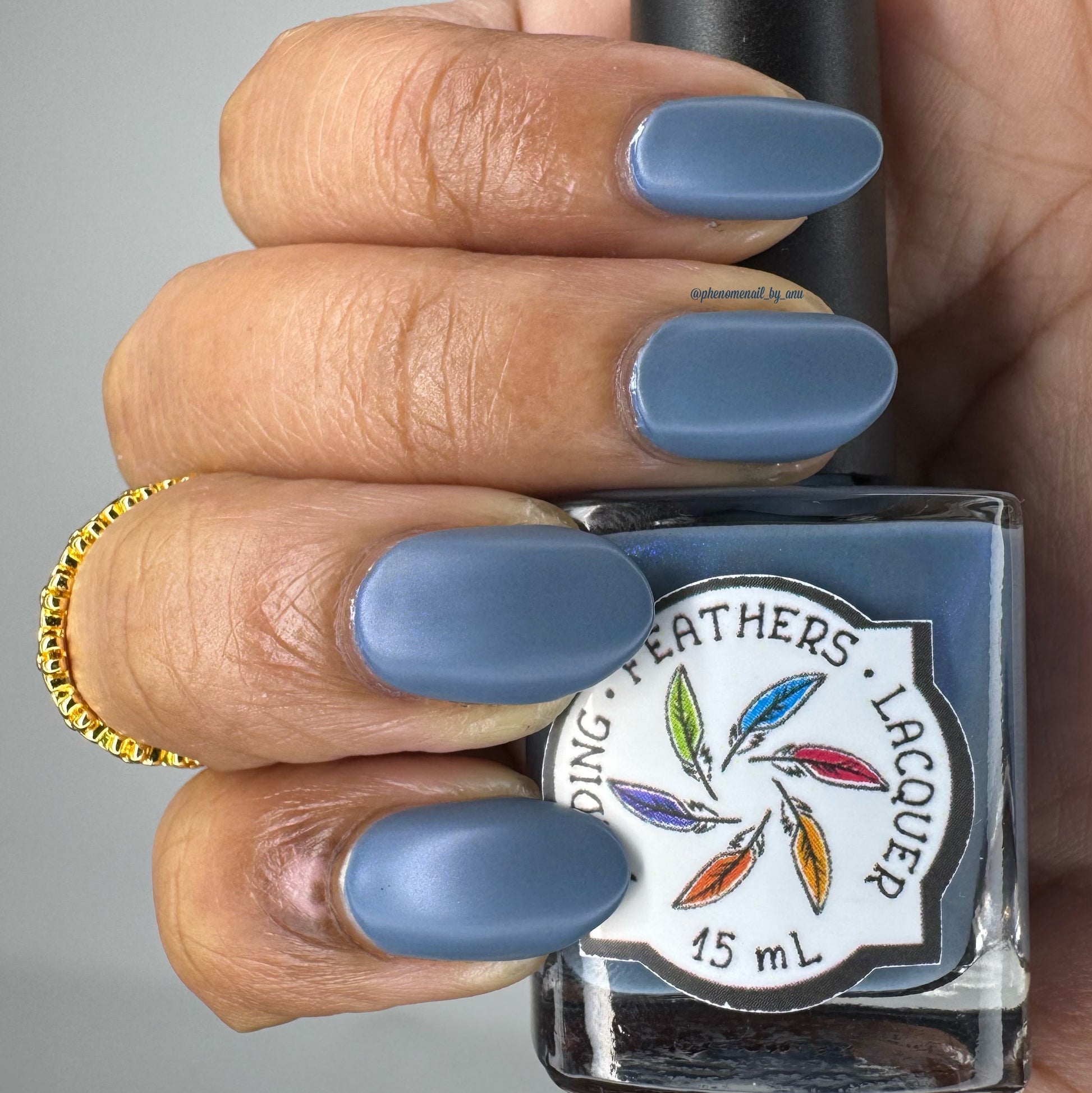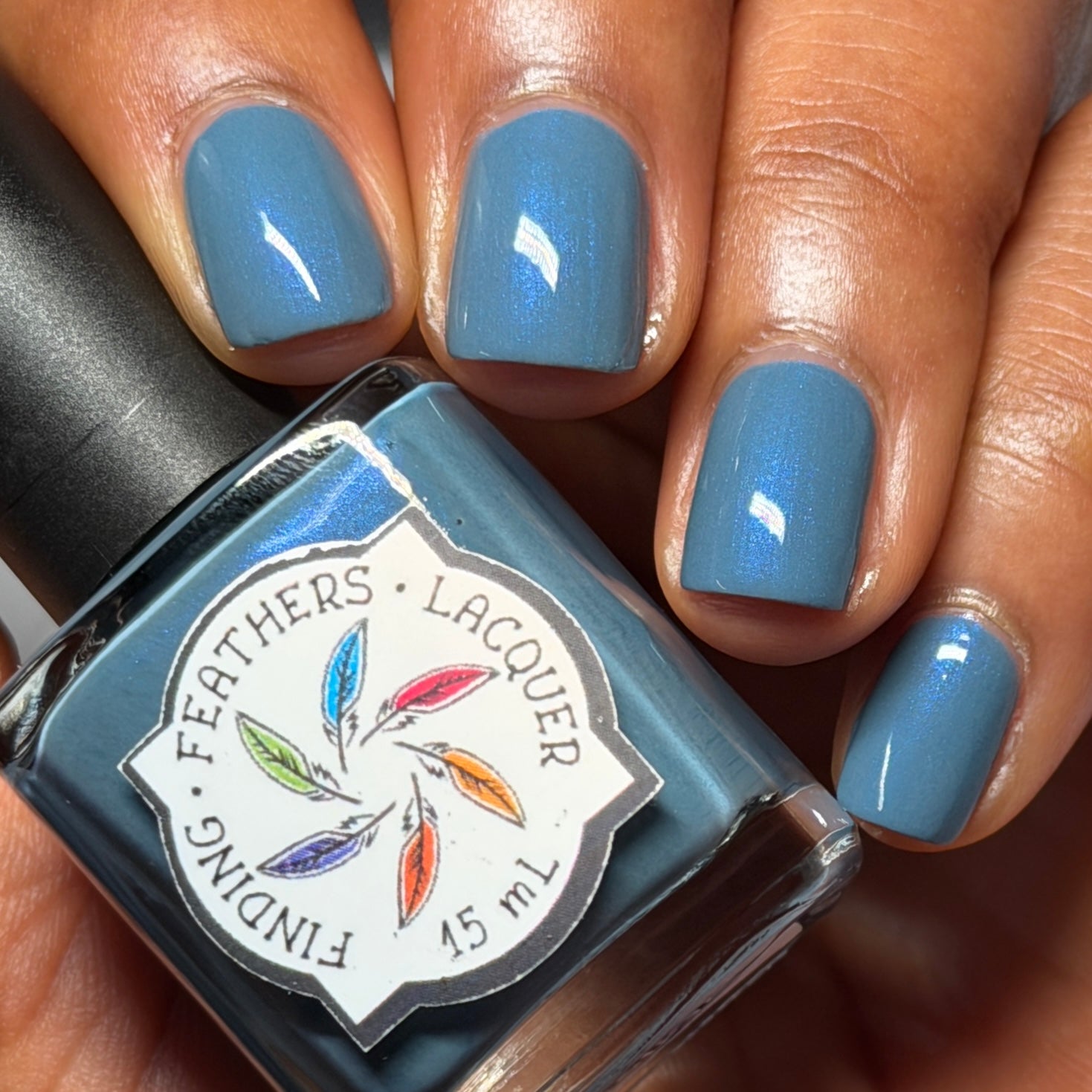 Morning Mist's neutral cozy gray base is mingled with a rich royal blue shimmer, creating a brisk steel blue shimmer creme polish.