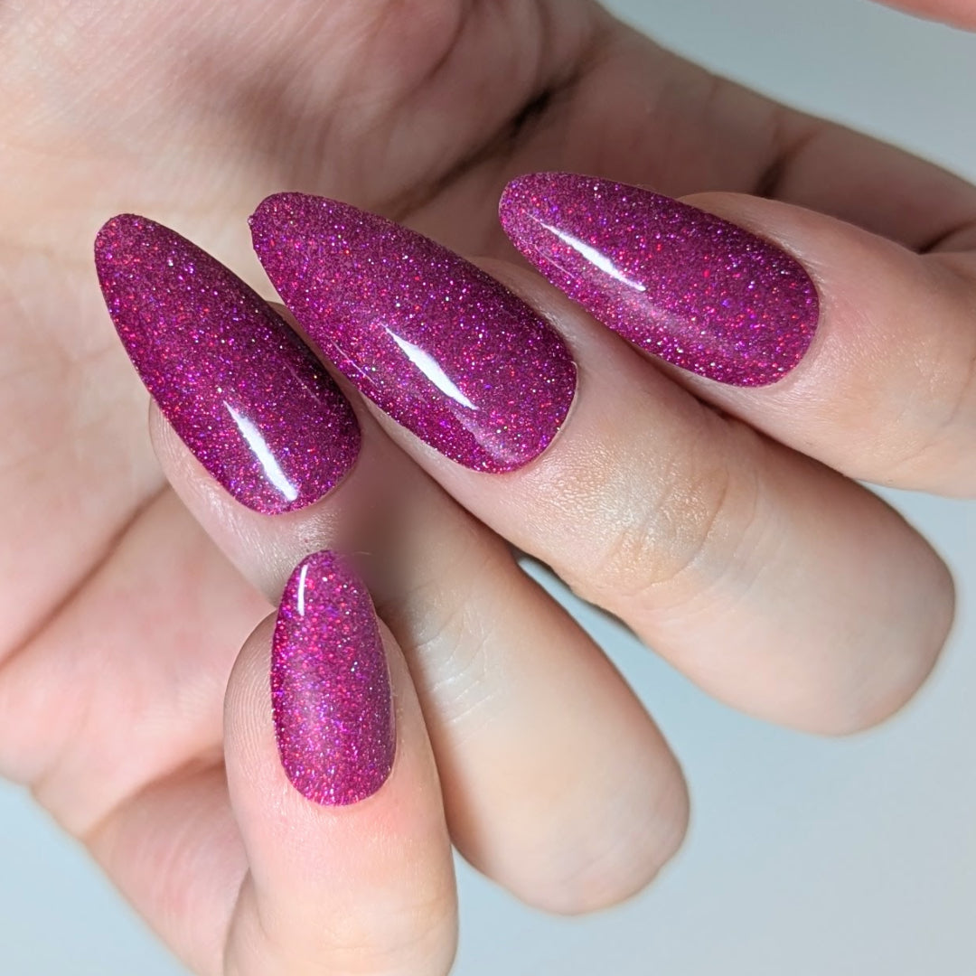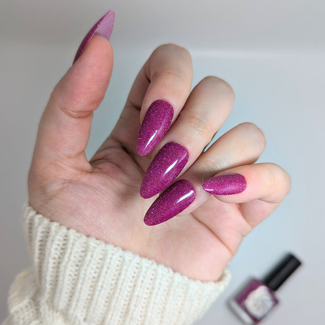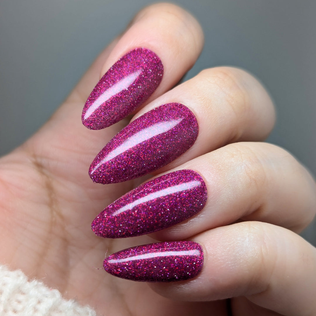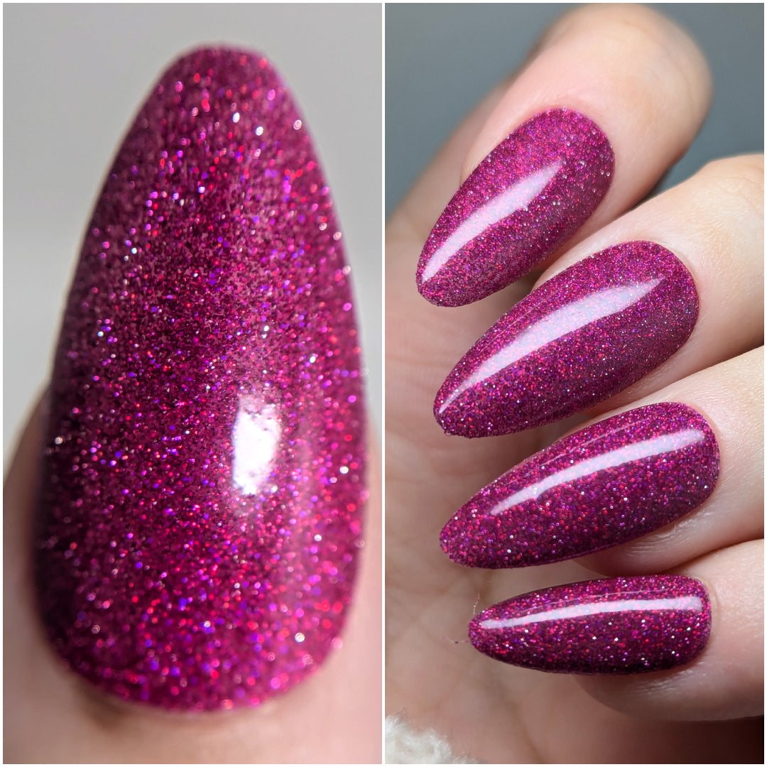Not That One. THAT One. is a marvelous magenta jelly base bedazzled with mini fuchsia holo and reflective glitters. Reflective glitters by nature are extra "thirsty", and we highly recommend FFL's Serenity Smoothing Top Coat BEFORE topping with FFL's True Tranquility QDTC for a smooth finish.