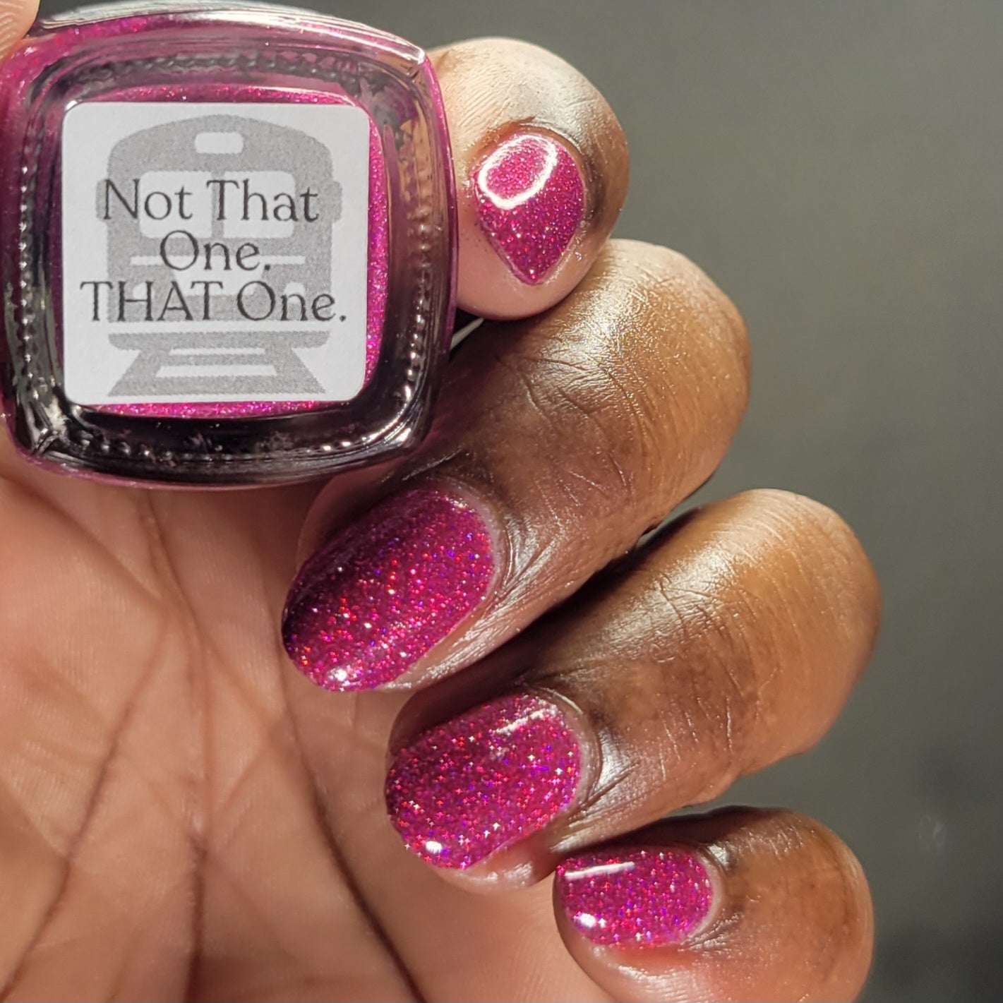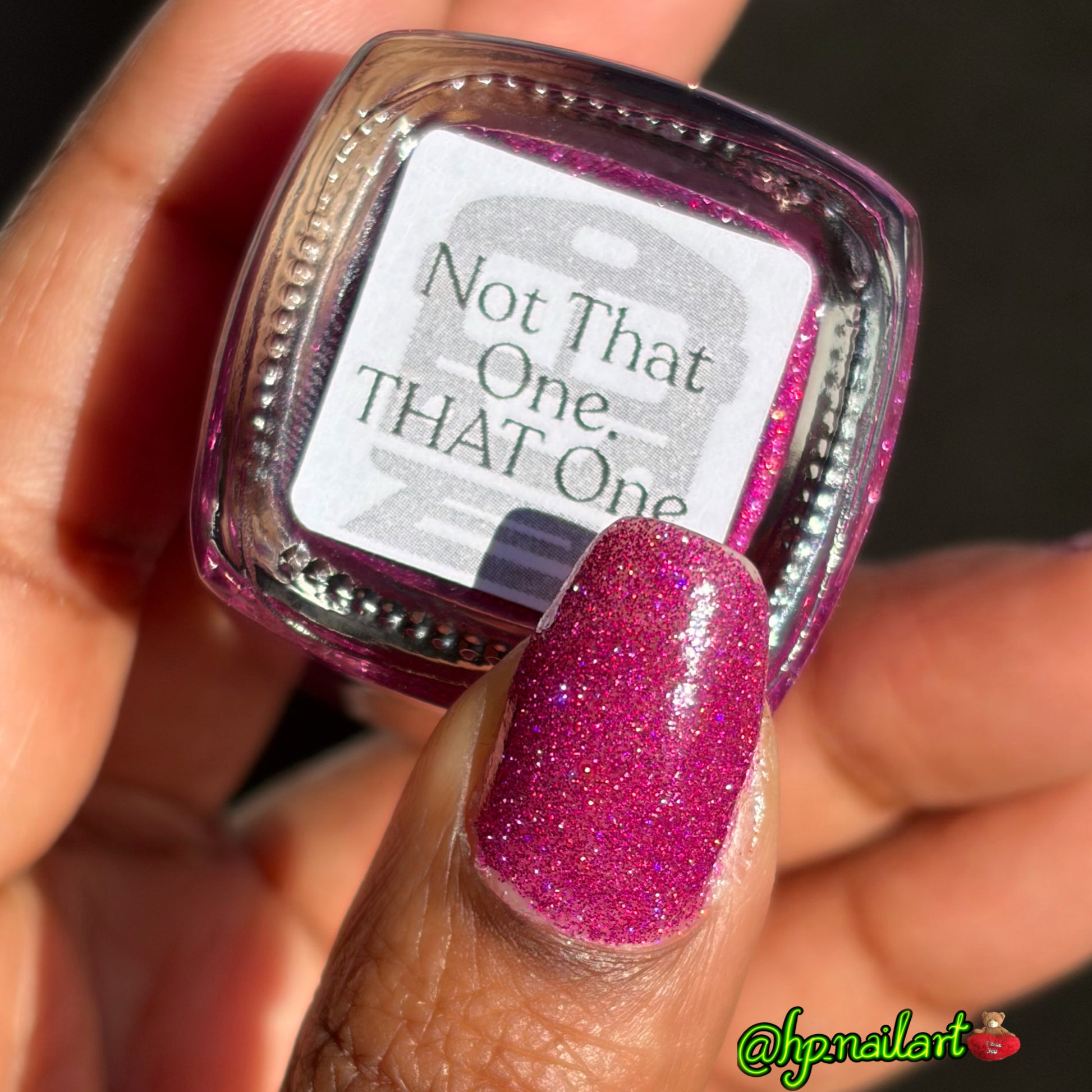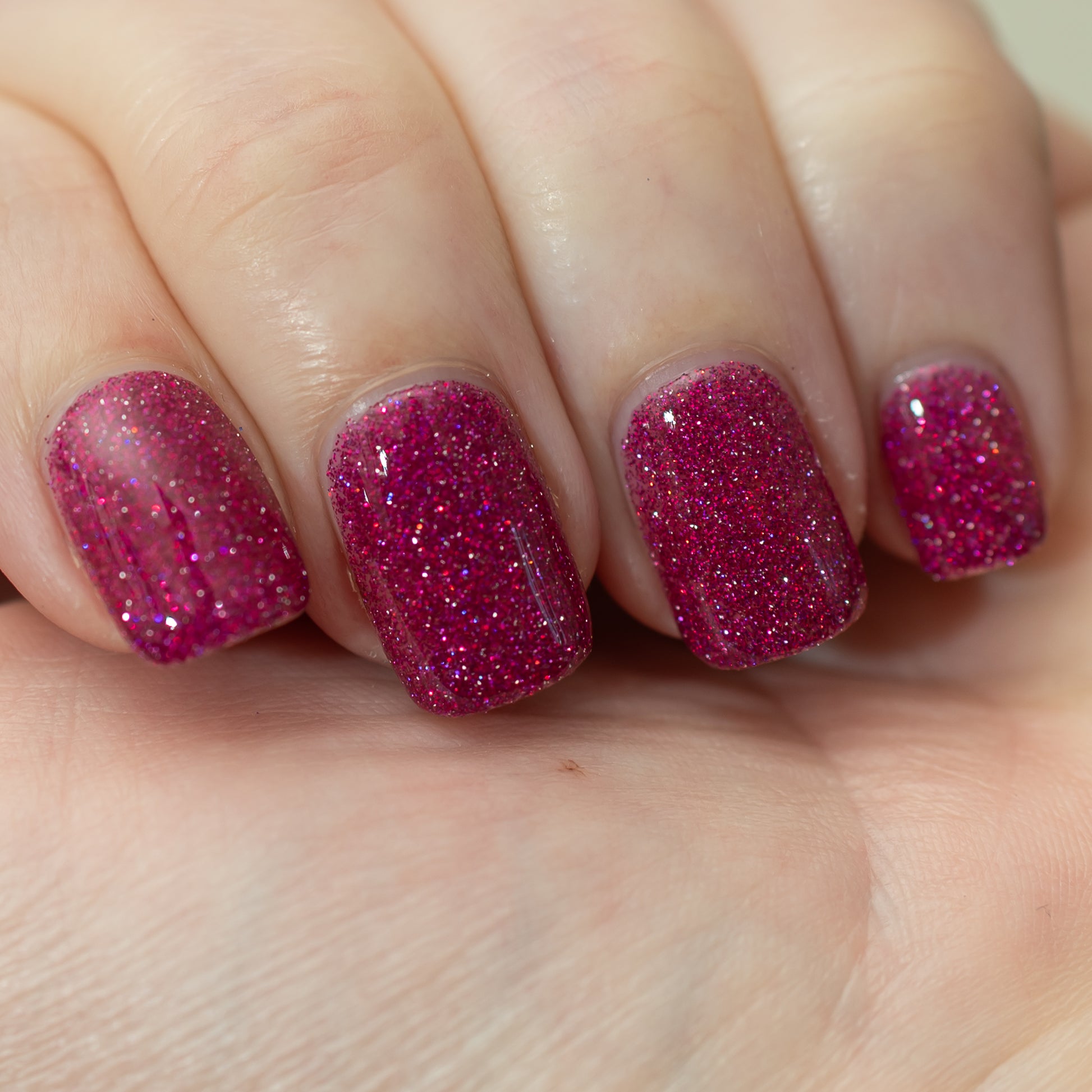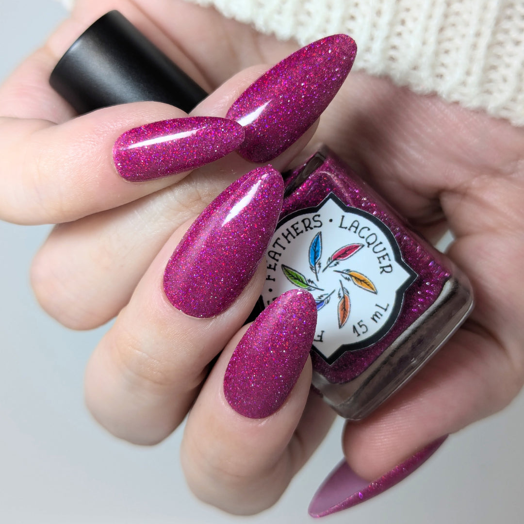 Not That One. THAT One. is a marvelous magenta jelly base bedazzled with mini fuchsia holo and reflective glitters. Reflective glitters by nature are extra "thirsty", and we highly recommend FFL's Serenity Smoothing Top Coat BEFORE topping with FFL's True Tranquility QDTC for a smooth finish.