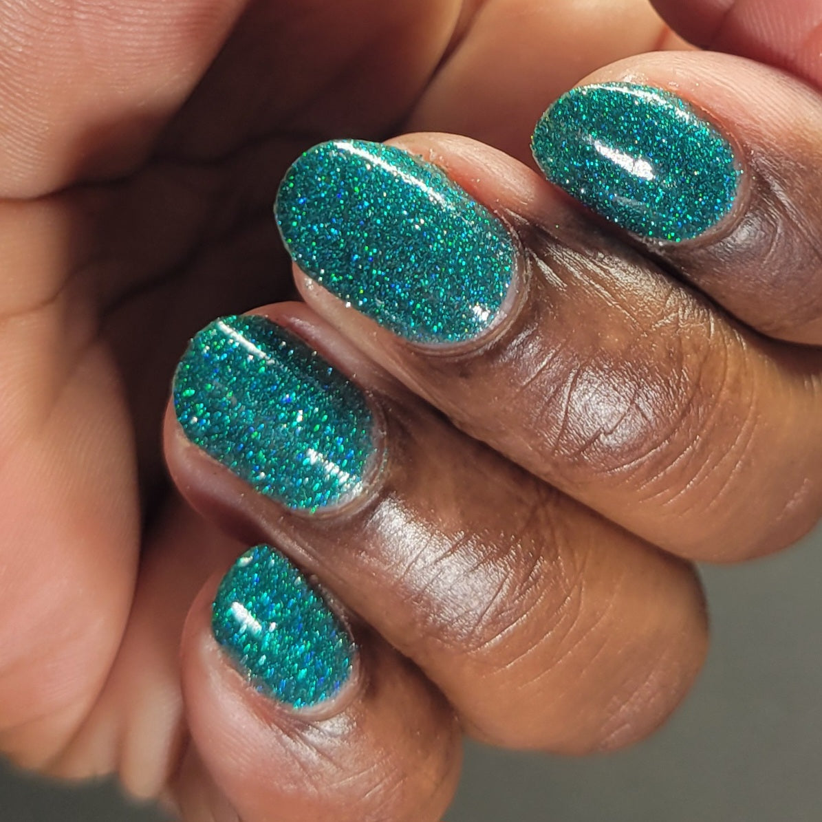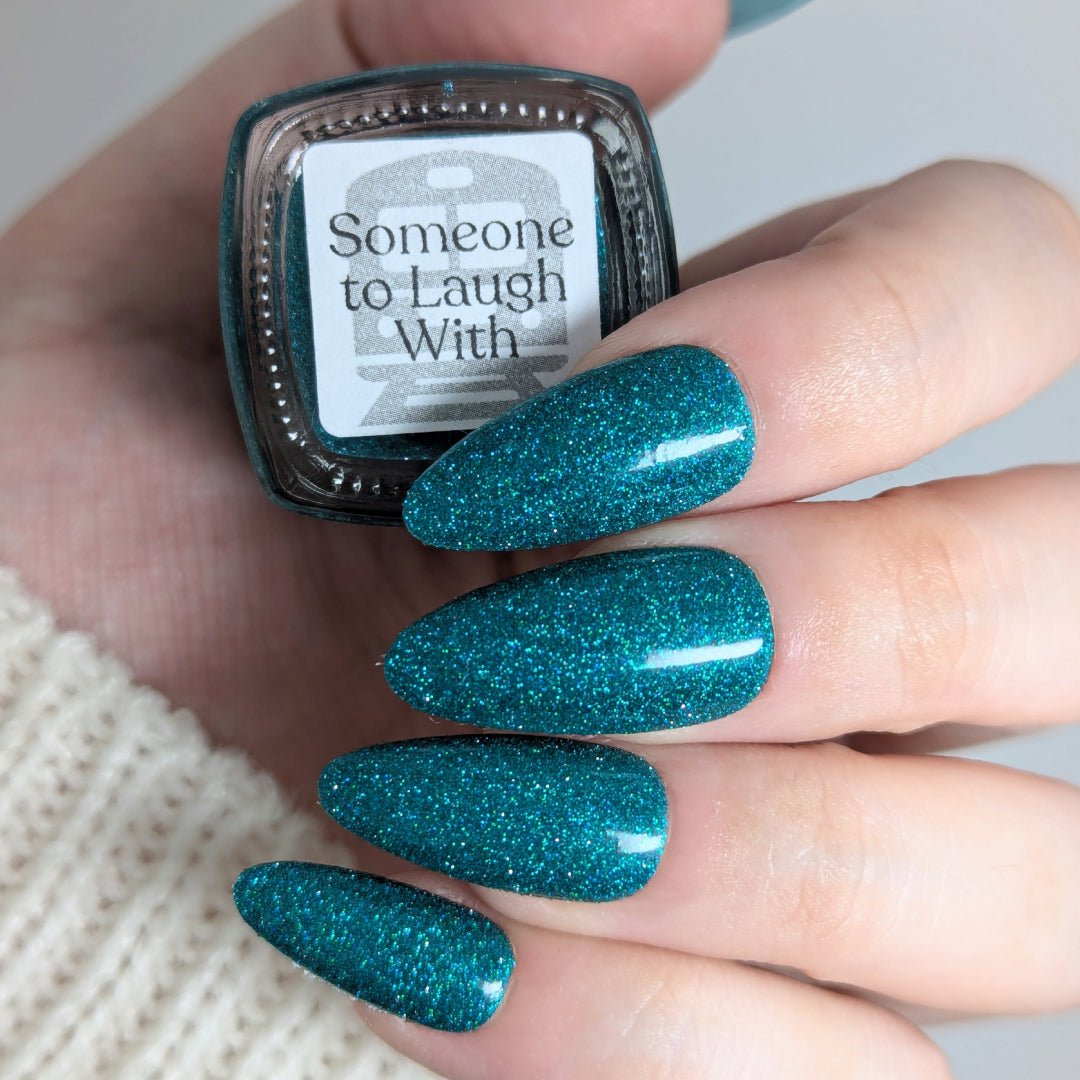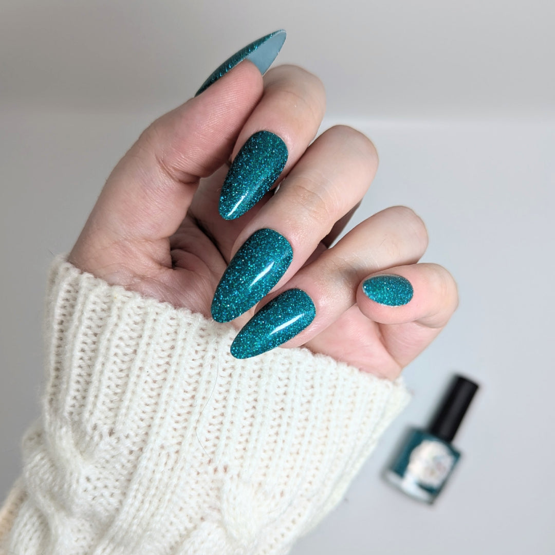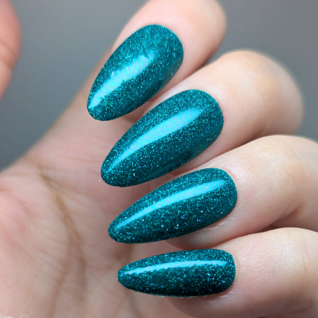 Someone to Laugh With is a deep sea green jelly base adorned with mini blue-green holo and reflective glitters. Reflective glitters by nature are extra "thirsty", and we highly recommend FFL's Serenity Smoothing Top Coat BEFORE topping with FFL's True Tranquility QDTC for a smooth finish.