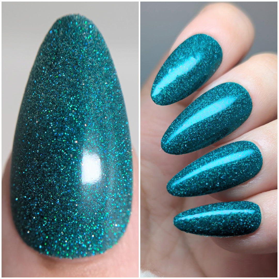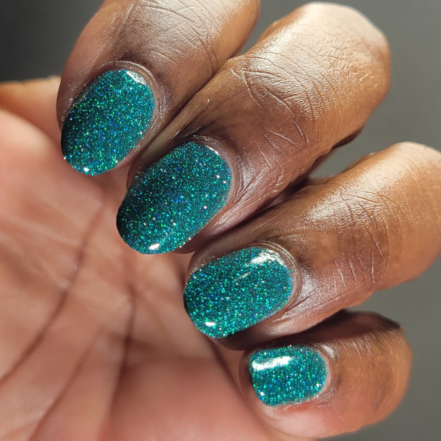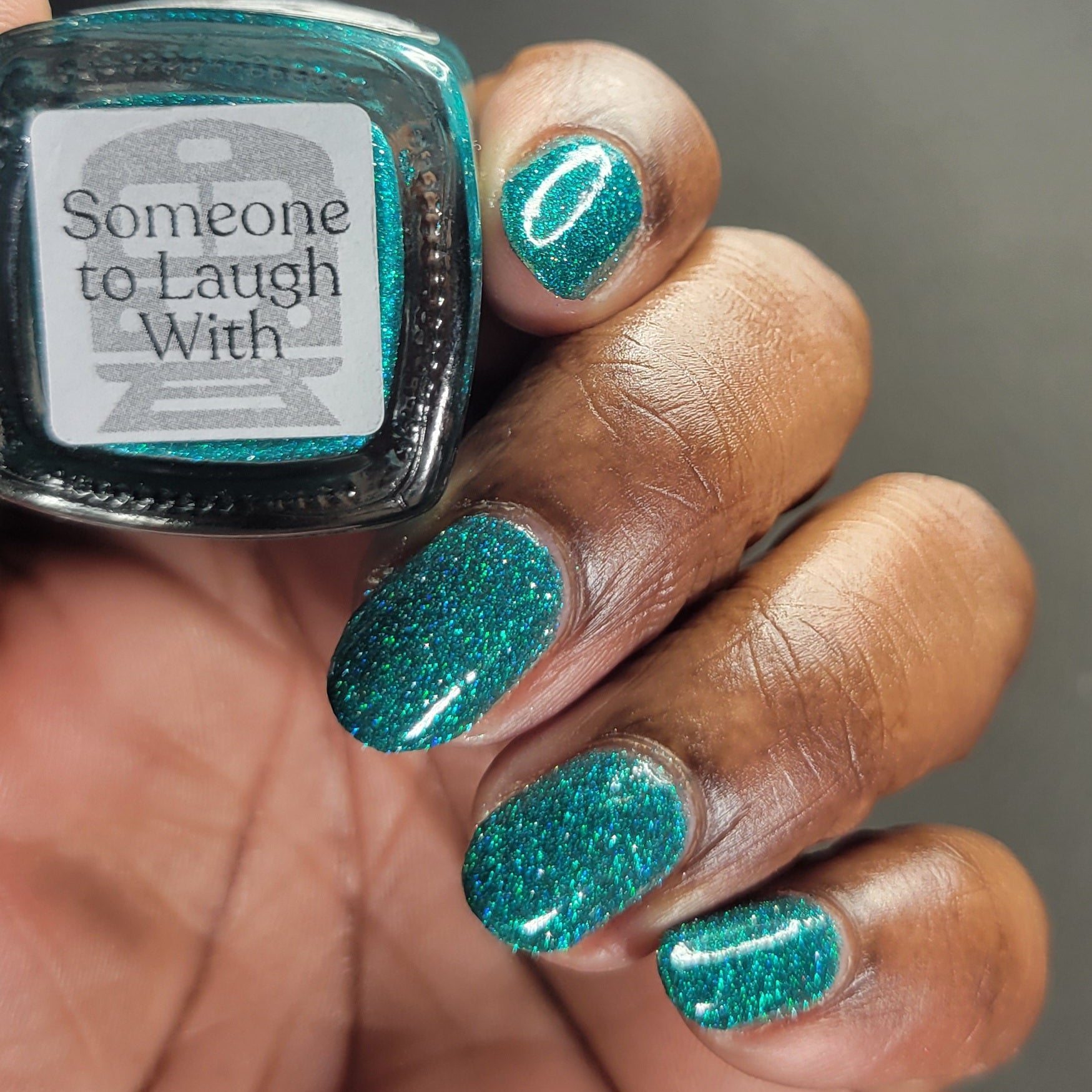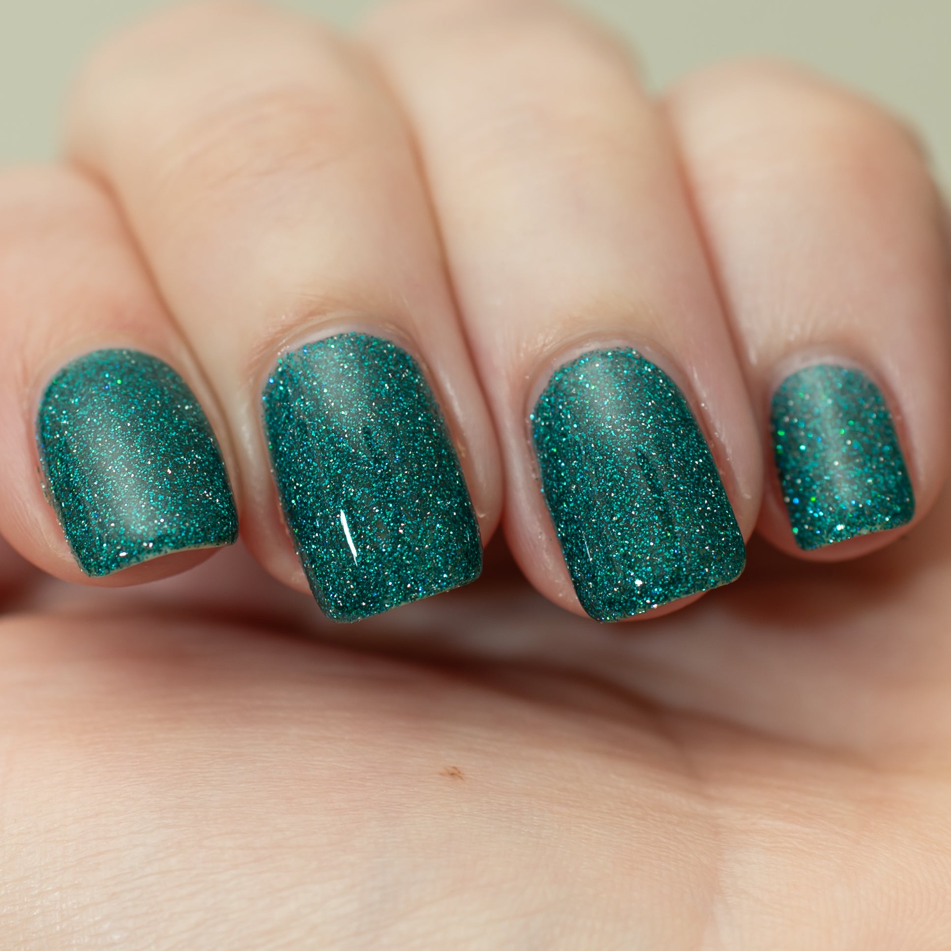 Someone to Laugh With is a deep sea green jelly base adorned with mini blue-green holo and reflective glitters. Reflective glitters by nature are extra "thirsty", and we highly recommend FFL's Serenity Smoothing Top Coat BEFORE topping with FFL's True Tranquility QDTC for a smooth finish.
