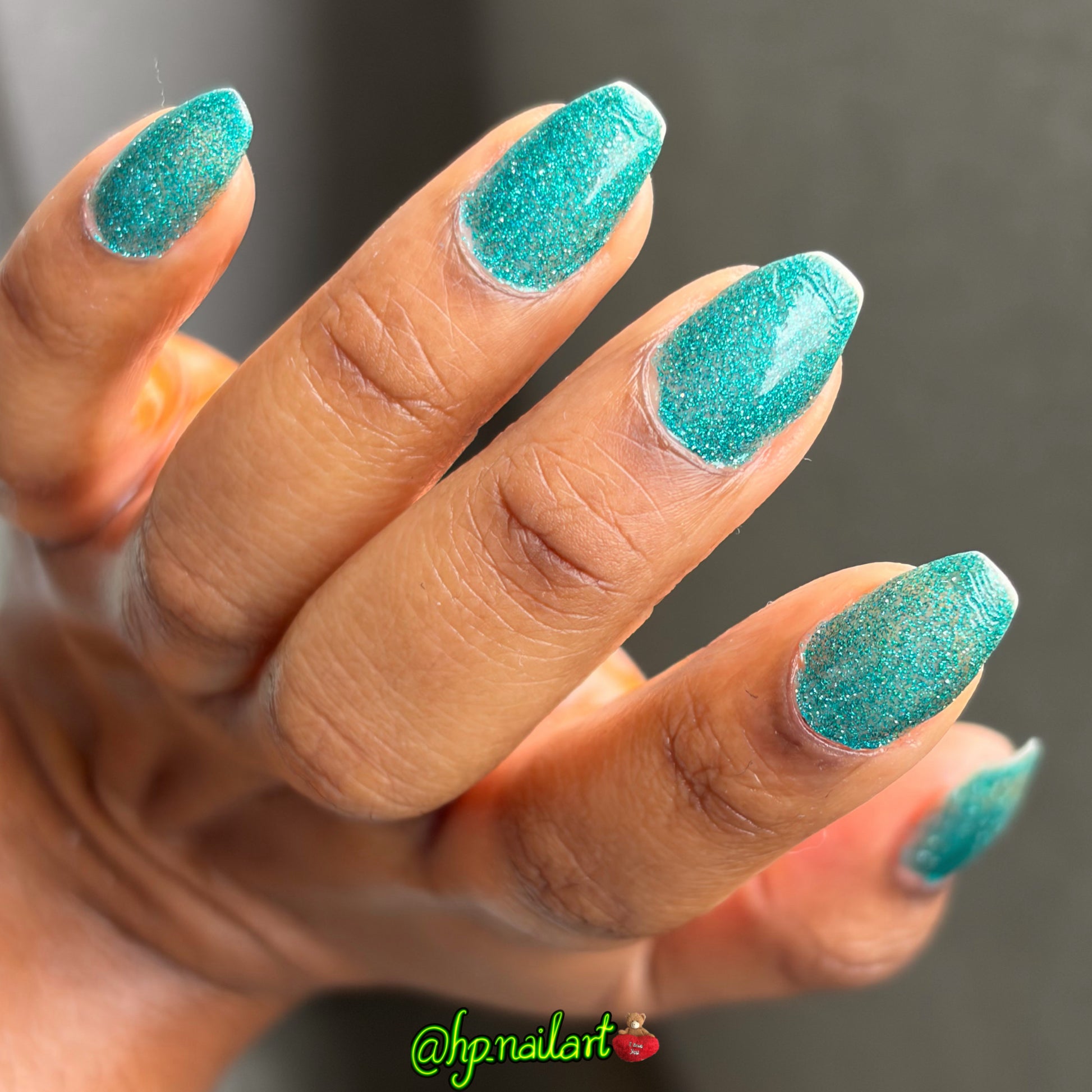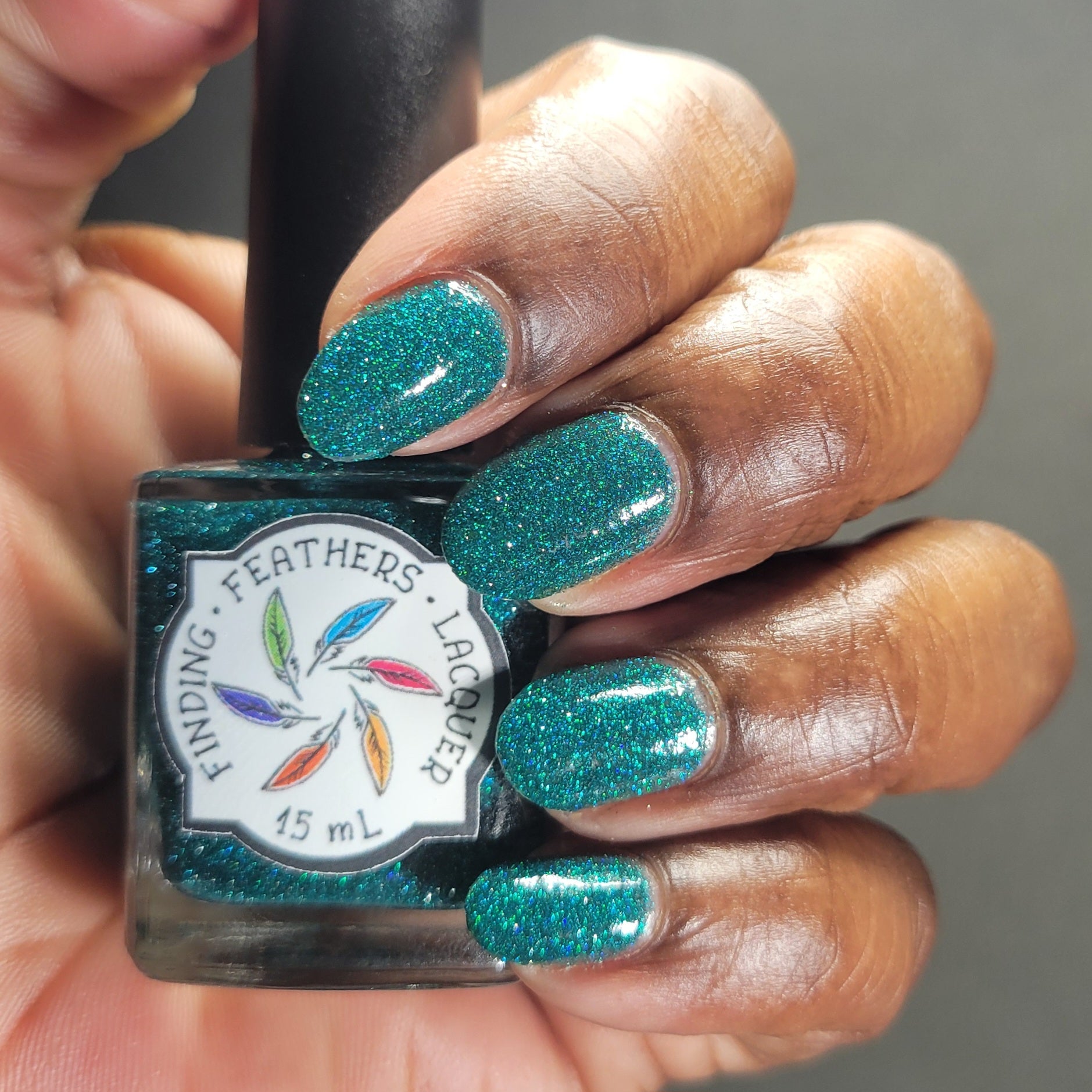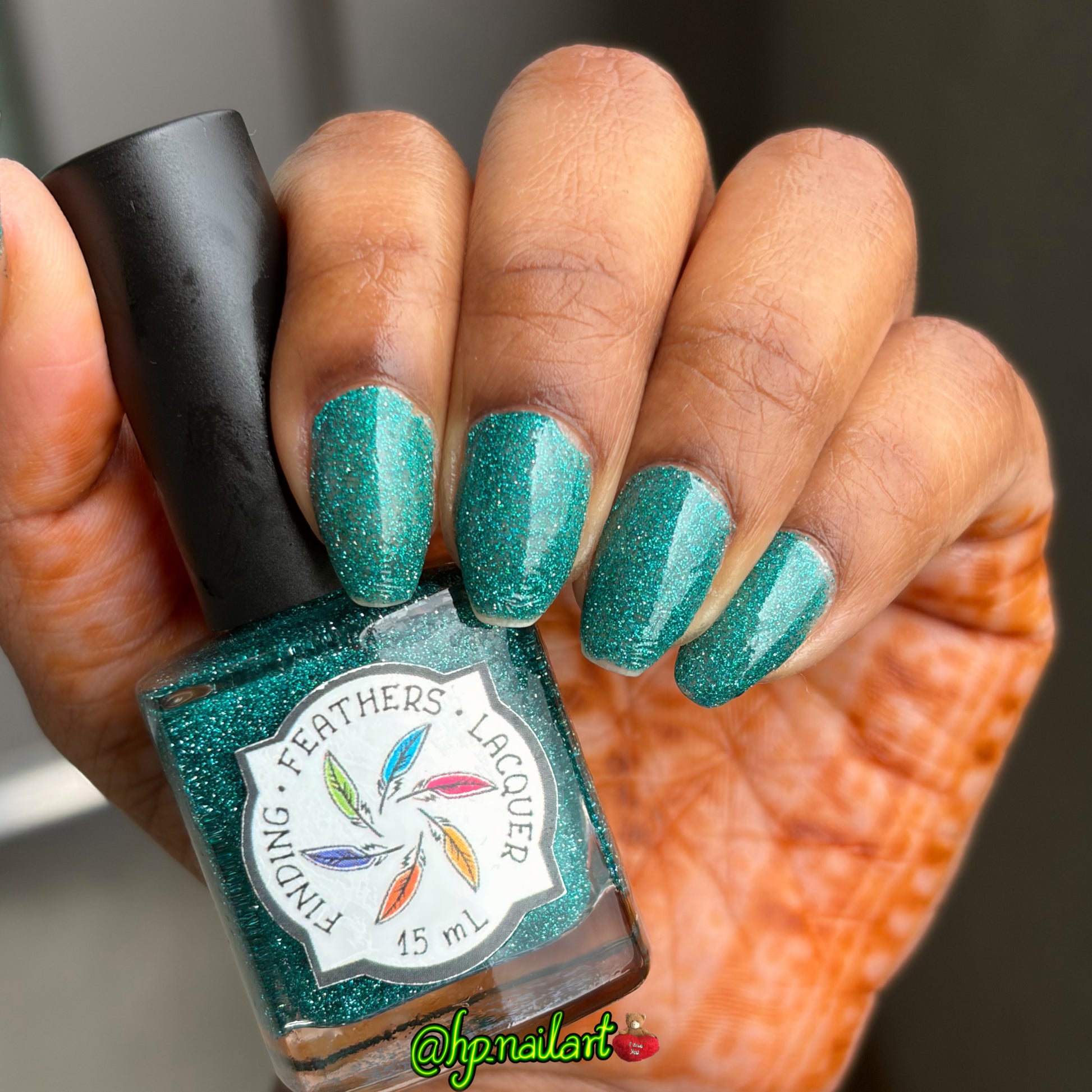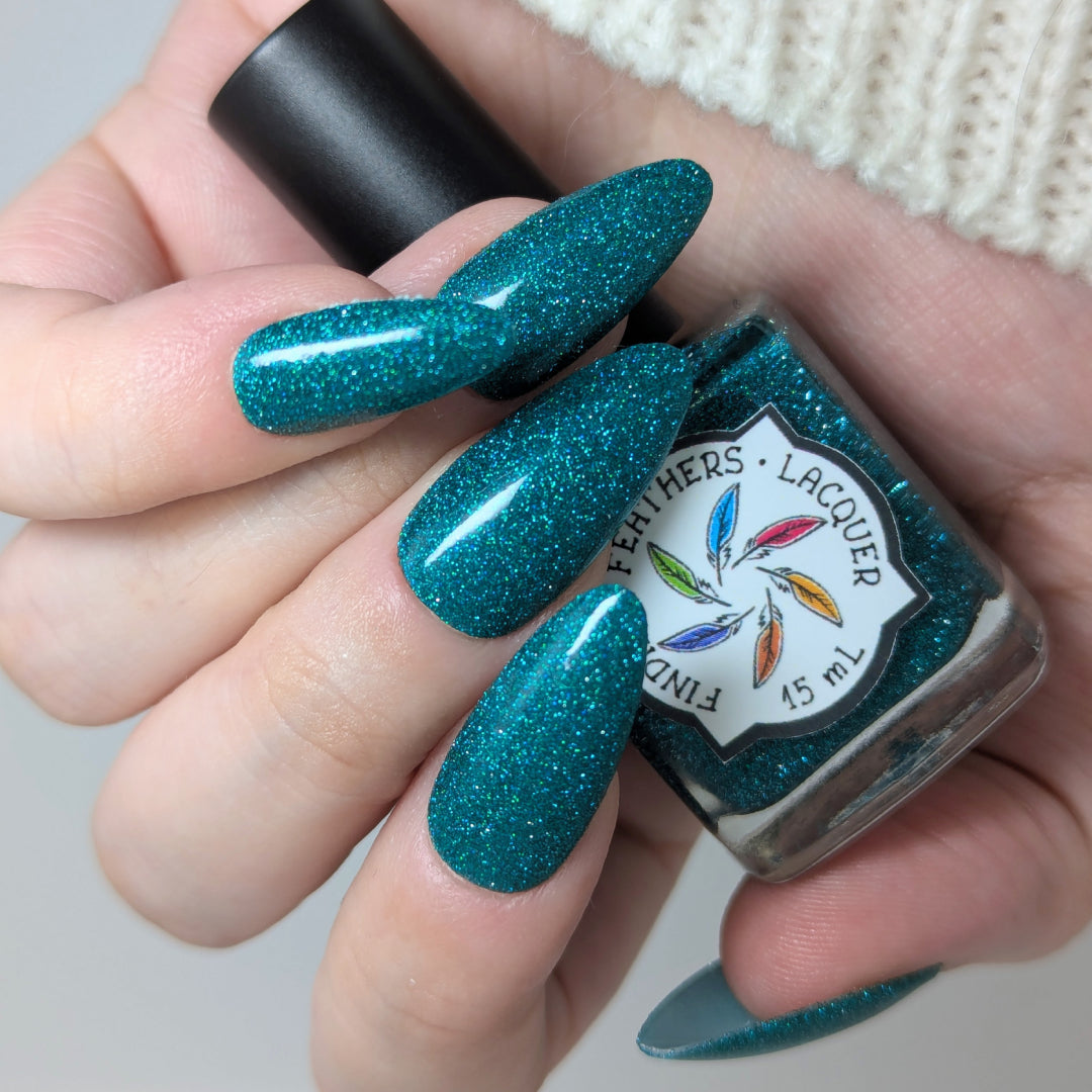 Someone to Laugh With is a deep sea green jelly base adorned with mini blue-green holo and reflective glitters. Reflective glitters by nature are extra "thirsty", and we highly recommend FFL's Serenity Smoothing Top Coat BEFORE topping with FFL's True Tranquility QDTC for a smooth finish.